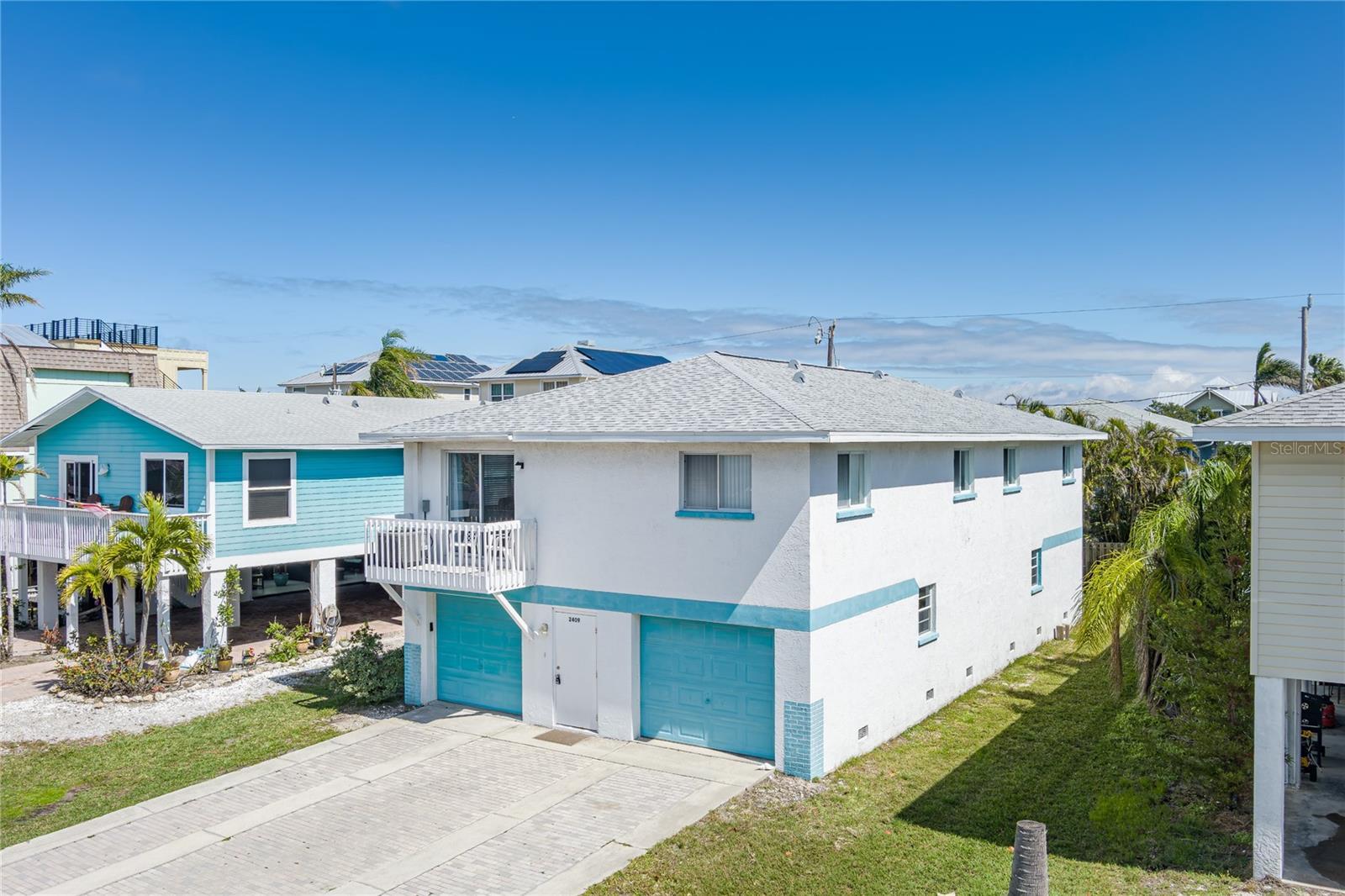 SELLERS OFFERING $15,000 TOWARD BUYERS' CLOSING COSTS — MOTIVATED TO SELL! Just steps from the pristine sands and turquoise waters of Anna Maria Island, this elevated duplex is your gateway to the ultimate Florida beach lifestyle—with no HOA and no CDD fees. The City of Bradenton Beach allows for nightly rentals, giving owners outstanding income flexibility and investment potential. Ideally situated between the bay on the east and the Gulf of Mexico on the west, this property offers unbeatable water views and easy public beach access. Built with solid Masonite block construction from top to bottom, both units are thoughtfully designed for comfort and long-term durability. Each unit features 2 spacious bedrooms, 2 full bathrooms, and comes equipped with its own washer and dryer and newer HVAC systems. The front unit includes a 2-car enclosed garage with an expansive driveway that can accommodate up to 6 additional vehicles—a rare find on the island. The rear unit offers a 2-car garage with backroad access, providing even more flexibility and convenience. In total, the property offers garage parking for 4 cars and driveway space for up to 6 more, making it ideal for owners, guests, or renters. Recent upgrades include a newer roof (2021), updated flooring in select areas, and new electrical panels, enhancing both safety and efficiency. The east-west orientation allows for pleasant natural light throughout the day, with glimpses of both sunrise and sunset adding to the home's relaxing coastal atmosphere, while balconies and select bedrooms feature stunning water views, creating a serene and picturesque setting for daily living. Backing up close to a city park, the property offers easy access to pickleball, tennis courts, a playground, and kayaking spots, with extra public parking nearby. You're also within distance of restaurants, shopping, and family-friendly attractions like putt-putt golf. A free trolley provides effortless access to the island’s north end and local hot spots. Whether you're looking for a personal beach retreat, a full-time residence, or a high-performing investment property, this duplex offers the perfect mix of location, lifestyle, and income potential of $100K and more in one of Florida’s most desirable coastal communities.