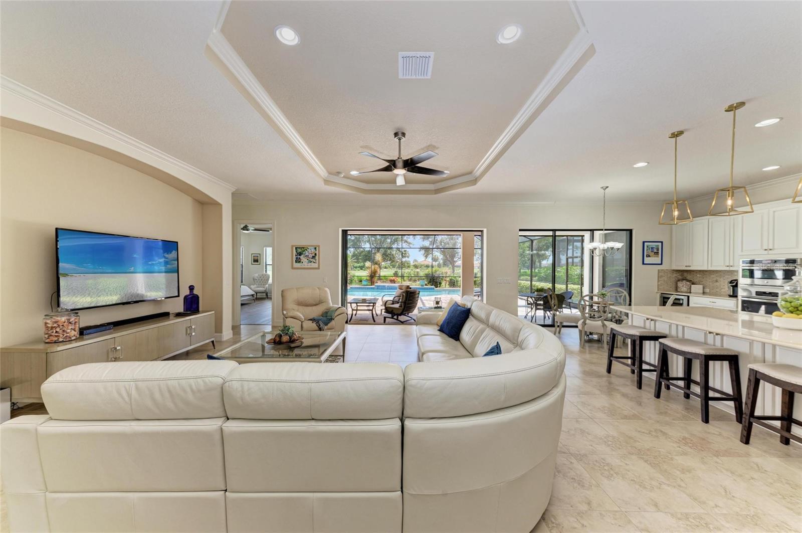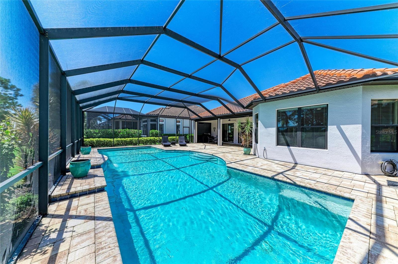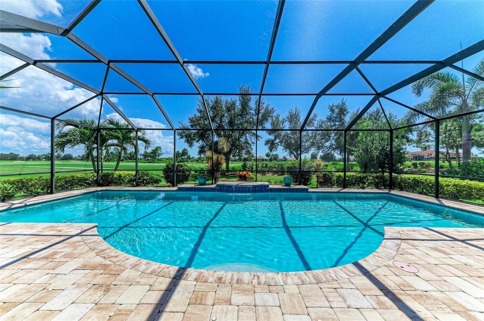 MASSIVE PRICE IMPROVEMENT! Sellers are MOTIVATED! Seize this limited time value opportunity to own the LOWEST priced Pallazio pool home on a GOLF-DEEDED LOT with direct views of golf course near hole #1 in Esplanade Golf & Country at Lakewood Ranch! True Play-In, Play-Out Convenience, here you can take advantage of the recent updates including NEW exterior and interior paint, NEW upgraded landscaping, and NEW LED lighting. This highly sought-after floor plan offers breathtaking southern exposure overlooking lush fairways. Enter through the grand double doors into a foyer with adorned columns, a tray ceiling, and soaring ceilings that flow into the expansive open-concept great room. Crown molding and disappearing pocket sliders fill the space with natural light and open to the lanai, showcasing an impressive 40-foot pool perfect for swimming laps or relaxing. The gourmet kitchen features Cambria quartz countertops, a crema Marfil marble backsplash, stainless steel appliances including a natural gas cooktop and built-in oven, a wine refrigerator, and an oversized island with chic pendant lighting, ample storage, and generous workspace. The extended kitchen offers a separate breakfast area opens to the lanai, enhancing the home’s indoor-outdoor flow. The extended primary suite is privately located and offers a spa-like en-suite bath with dual sinks, frameless glass shower, soaking tub, private water closet, and a large walk-in closet. Two guest bedrooms provide comfort and privacy—one with an en-suite bath featuring a frameless glass shower and quartz countertops, and the other with access to a full bath with quartz countertops and a shower/tub combination. A generously sized study/den with double doors offers flexible use and can easily serve as a 4th bedroom. The extended screened lanai includes a large, covered area, expansive paver deck, and sweeping golf course views, with motorized hurricane Kevlar screens for added convenience. The professionally extended driveway accommodates 3-cars, and the epoxy-floored garage includes overhead storage racks. Additional features include a newer washer and dryer in the spacious laundry room with a utility sink, under-cabinet storage, and drop zone. Esplanade’s amenities include an 18-hole championship golf course, tennis and pickleball courts, two fitness centers, two resort-style pools, a full-service spa and salon, on-site dining at the Bahama Bar and Barrel House Bistro, bocce ball, a bark park, and an active social calendar. Lawn maintenance is included in the HOA fees. Located in Lakewood Ranch, near University Town Center, Sarasota Polo Club, farmers’ markets, trails, parks, award-winning beaches, and SRQ and TPA airports, this home offers the best of Florida living. This is a rare, limited-time opportunity to own at an amazing price in a fully built-out, established neighborhood—no new construction, no disruptions, just a beautiful home ready for your enjoyment.