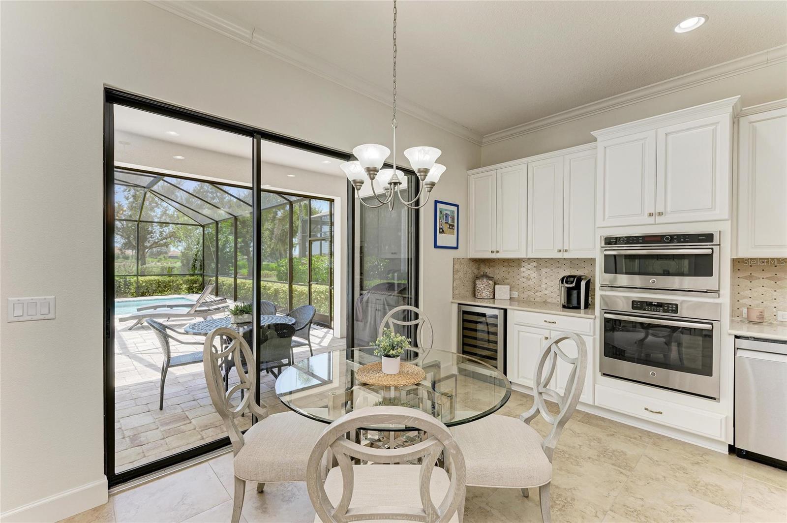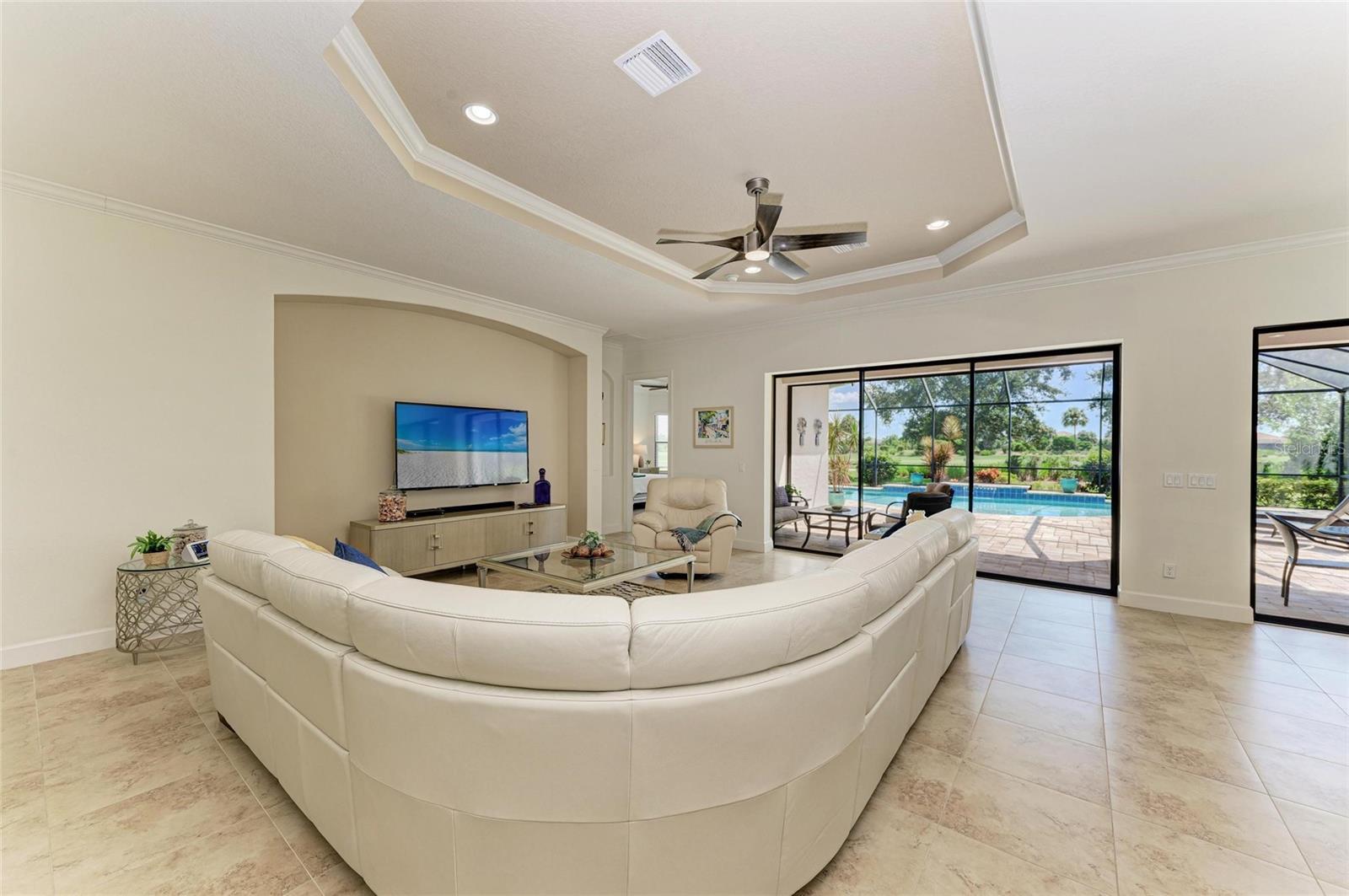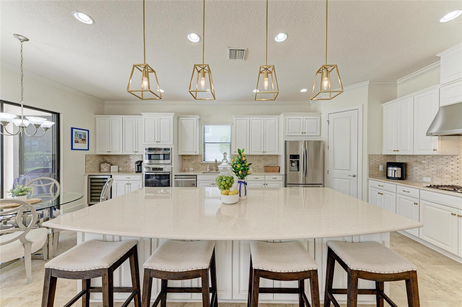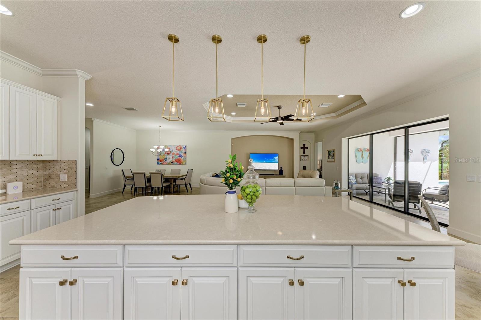 MASSIVE PRICE IMPROVEMENT! Sellers are MOTIVATED! Seize this limited time value opportunity to own the LOWEST priced Pallazio pool home on a GOLF-DEEDED LOT with direct views of golf course near hole #1 in Esplanade Golf & Country at Lakewood Ranch! True Play-In, Play-Out Convenience, here you can take advantage of the recent updates including NEW exterior and interior paint, NEW upgraded landscaping, and NEW LED lighting. This highly sought-after floor plan offers breathtaking southern exposure overlooking lush fairways. Enter through the grand double doors into a foyer with adorned columns, a tray ceiling, and soaring ceilings that flow into the expansive open-concept great room. Crown molding and disappearing pocket sliders fill the space with natural light and open to the lanai, showcasing an impressive 40-foot pool perfect for swimming laps or relaxing. The gourmet kitchen features Cambria quartz countertops, a crema Marfil marble backsplash, stainless steel appliances including a natural gas cooktop and built-in oven, a wine refrigerator, and an oversized island with chic pendant lighting, ample storage, and generous workspace. The extended kitchen offers a separate breakfast area opens to the lanai, enhancing the home’s indoor-outdoor flow. The extended primary suite is privately located and offers a spa-like en-suite bath with dual sinks, frameless glass shower, soaking tub, private water closet, and a large walk-in closet. Two guest bedrooms provide comfort and privacy—one with an en-suite bath featuring a frameless glass shower and quartz countertops, and the other with access to a full bath with quartz countertops and a shower/tub combination. A generously sized study/den with double doors offers flexible use and can easily serve as a 4th bedroom. The extended screened lanai includes a large, covered area, expansive paver deck, and sweeping golf course views, with motorized hurricane Kevlar screens for added convenience. The professionally extended driveway accommodates 3-cars, and the epoxy-floored garage includes overhead storage racks. Additional features include a newer washer and dryer in the spacious laundry room with a utility sink, under-cabinet storage, and drop zone. Esplanade’s amenities include an 18-hole championship golf course, tennis and pickleball courts, two fitness centers, two resort-style pools, a full-service spa and salon, on-site dining at the Bahama Bar and Barrel House Bistro, bocce ball, a bark park, and an active social calendar. Lawn maintenance is included in the HOA fees. Located in Lakewood Ranch, near University Town Center, Sarasota Polo Club, farmers’ markets, trails, parks, award-winning beaches, and SRQ and TPA airports, this home offers the best of Florida living. This is a rare, limited-time opportunity to own at an amazing price in a fully built-out, established neighborhood—no new construction, no disruptions, just a beautiful home ready for your enjoyment.