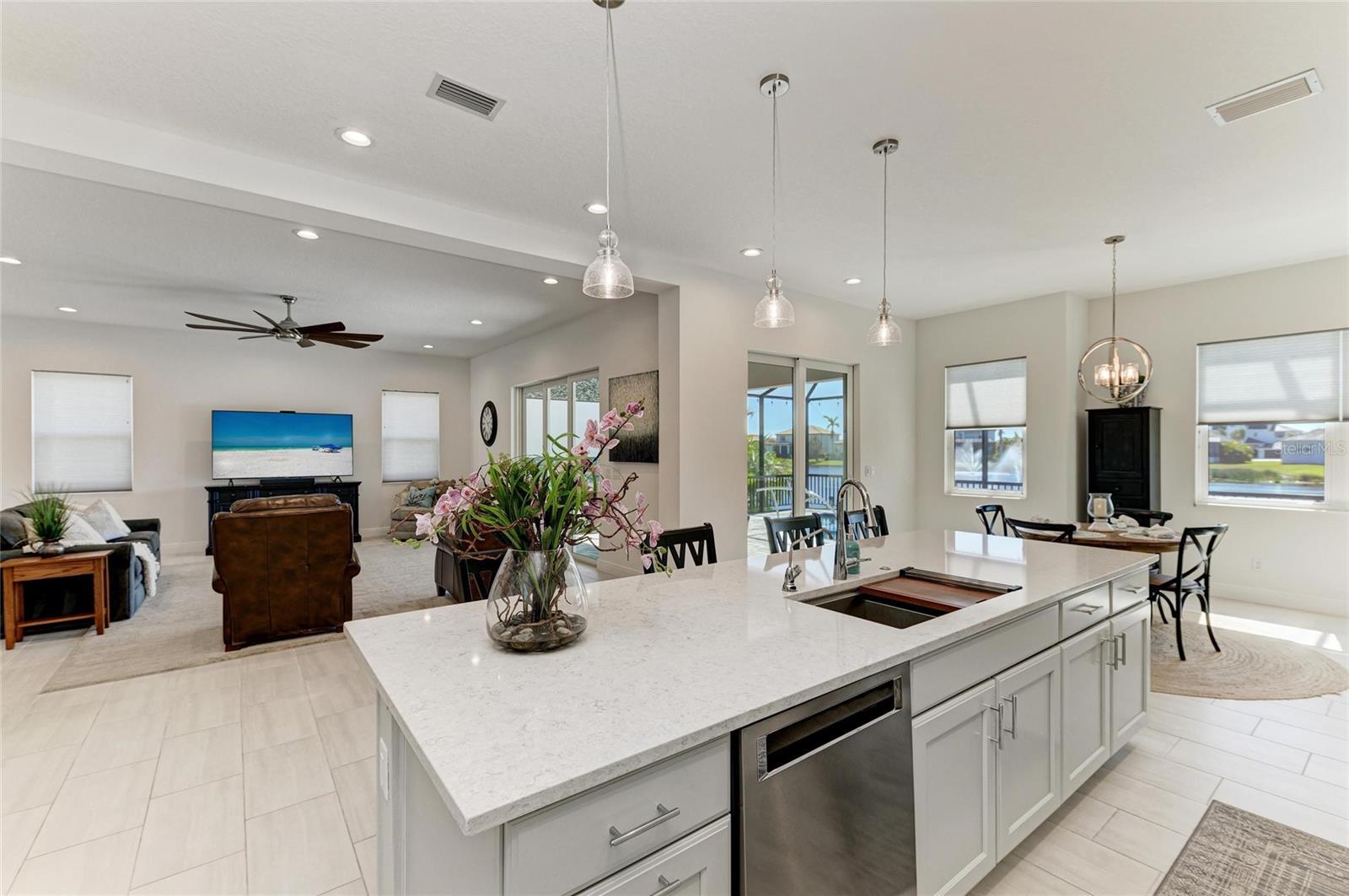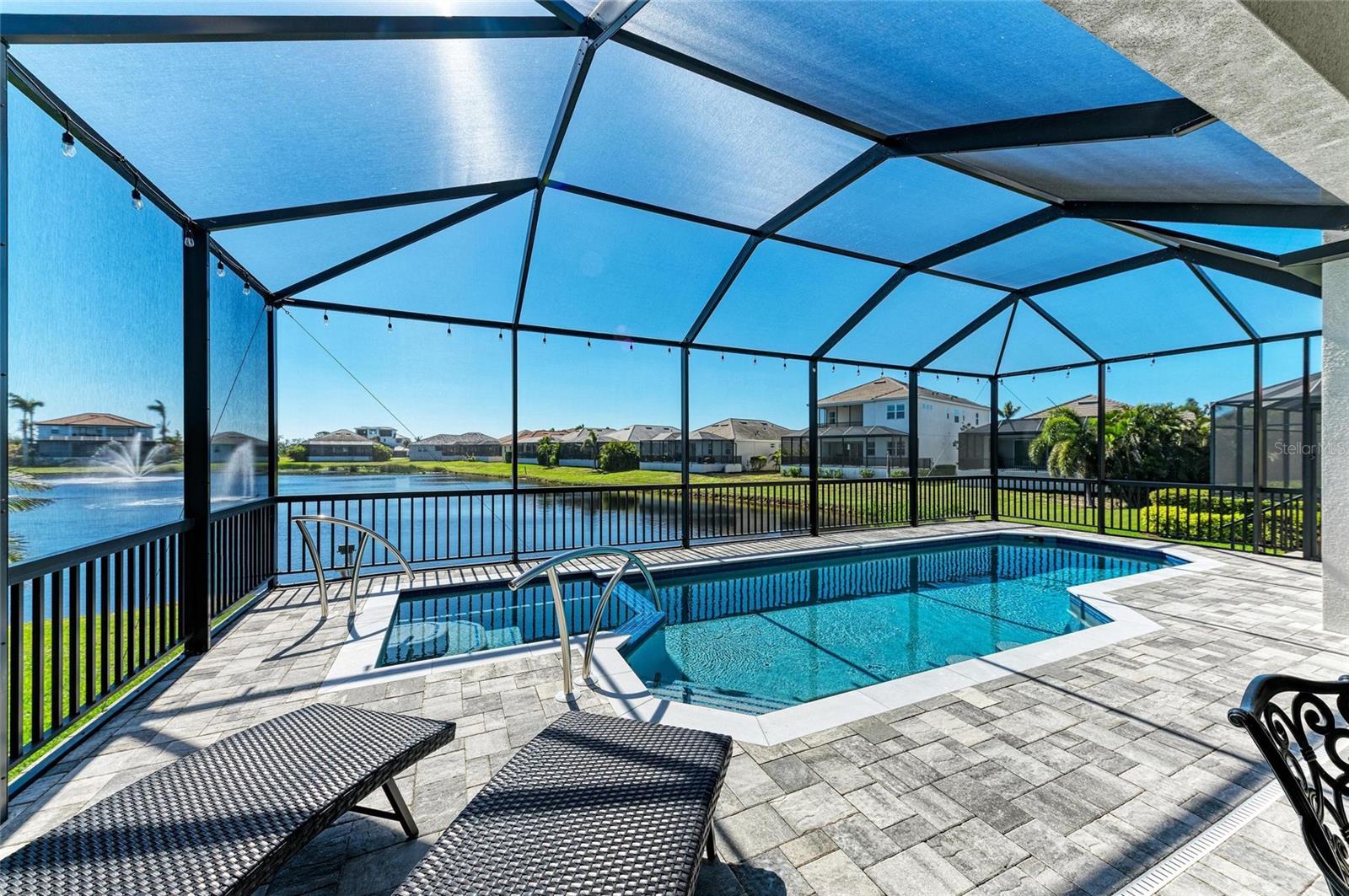 Beautiful inside and outside, this luxurious coastal contemporary home in Legends Bay is a must-see for those seeking a spacious retreat in a prime location. Nestled along the bay in a picturesque, gated neighborhood, this immaculate, storm-safe home is in excellent condition. Situated on a quaint homesite with sparkling water views, this serene sanctuary is ready to be enjoyed. Soaring ceilings give way to an elegant great room centered around a showcase gourmet kitchen with fabulous entertaining space, stainless-steel appliances, and gleaming quartz counters. The indoor area flows seamlessly to the outdoor area with a gorgeous saltwater heated pool, spa, outdoor kitchen, and covered lanai. A guest suite downstairs offers convenience for a bedroom or office. Upstairs, the well-appointed primary bedroom offers sweeping views, double walk-in closets, a walk-in shower and soaking tub, and glorious sunlight. The adjoining loft offers space to unwind and a second-story terrace with dreamy views. Three additional guest rooms provide privacy for family or friends. Impact windows and sliding glass doors provide safety and lower insurance premiums. This spectacular energy-efficient home shows like new and is move-in ready. Legends Bay is a gated enclave with a community clubhouse, swimming pool, walking paths, a lakeside fishing pier, and is golf cart accessible to IMG. This exceptional quality-built home has had no storm damage and offers lower insurance premiums based on the elevated stem wall foundation and quality construction features. The HOA covers yard maintenance and cable/internet. Come see this incredible residence!