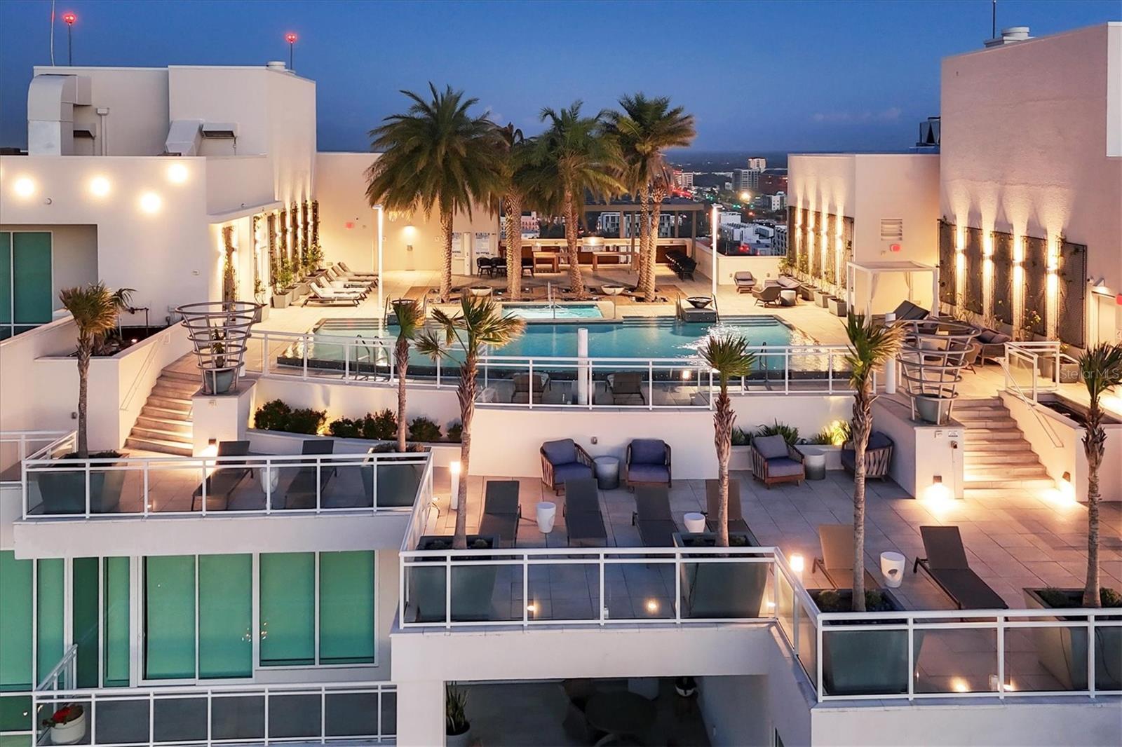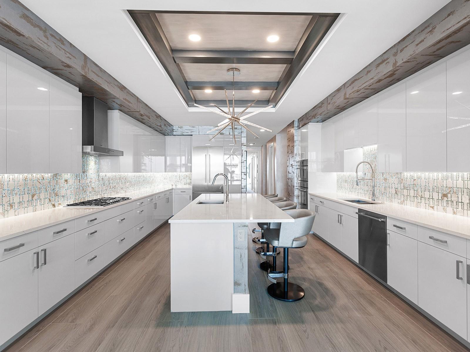 One or more photo(s) has been virtually staged. Perched high above Sarasota Bay on the 15th floor, this exceptional residence is a refined expression of modern luxury, offering a seamless fusion of architectural elegance and breathtaking, ever-changing vistas. Walls of glass frame vibrant sunsets, the city skyline, and the tranquil beauty of the barrier islands, creating a daily backdrop that is both dynamic and serene. More than a residence, this home delivers an elevated lifestyle, combining the scale and privacy of a private estate with the effortless sophistication of luxury condominium living. A semi-private elevator opens directly to an elegant foyer, where hand-painted walls, bespoke lighting, and wood-look plank tile flooring introduce the home’s refined aesthetic. Beyond, the great room unfolds as a striking showcase of artistry and craftsmanship, defined by soaring coffered ceilings, a dramatic stone accent wall with a built-in fireplace, and floor-to-ceiling windows that extend seamlessly to a private balcony overlooking sweeping city and coastal views. Anchoring the living space, the chef’s kitchen is both an entertainer’s dream and a functional work of art. A quartz-topped island with integrated storage, seating, and beverage drawers serves as the centerpiece, complemented by custom cabinetry, a designer tile backsplash, and premium Sub-Zero and Thermador appliances, including a gas cooktop and double wall oven. A built-in bar with glass shelving and a beverage cooler adds an additional layer of sophistication for hosting and everyday enjoyment. The primary suite is a private sanctuary of exceptional serenity, featuring floor-to-ceiling windows, a private terrace, and two custom-designed walk-in closets. The spa-inspired bath is equally indulgent, offering a quartz vanity, a soaking tub, a walk-in glass shower, and expansive windows that bathe the space in natural light. Two additional guest suites, a dedicated workspace, and a thoughtfully designed laundry room with extensive cabinetry further enhance the home’s comfort and functionality. Three private terraces provide breathtaking vantage points with views extending to Siesta Key, Lido Key, and Longboat Key. Residents of BLVD Sarasota enjoy access to an unparalleled collection of world-class amenities, including a rooftop deck with a zero-horizon pool, a state-of-the-art fitness center, elegant club and wine rooms, a dog grooming salon and park, and an indoor golf simulator. BLVD Sarasota stands as a landmark of contemporary luxury, redefining high-rise living in the heart of downtown Sarasota.