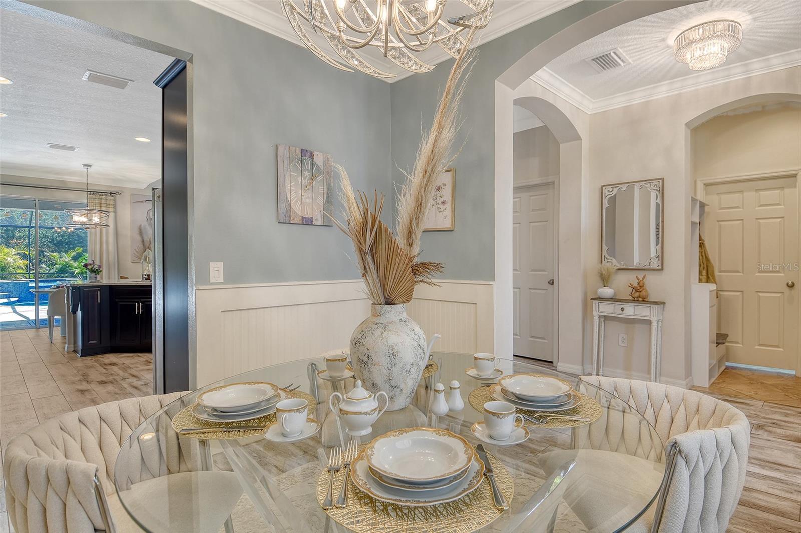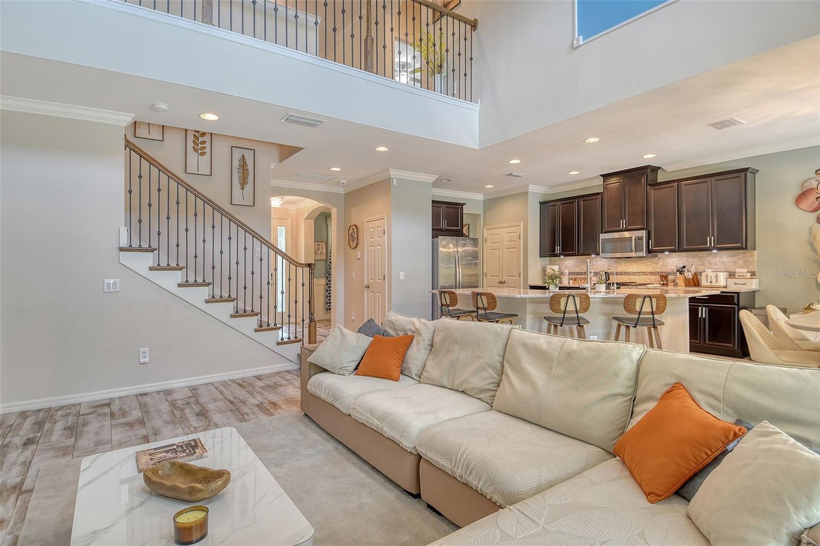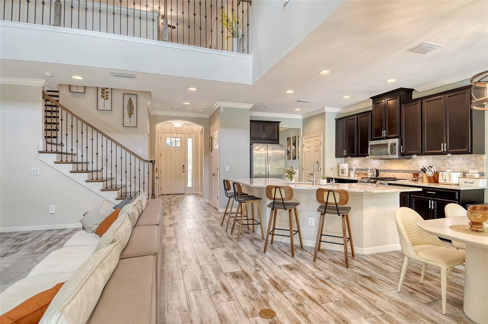 - Ceiling Fans(s), Coffered Ceiling(s), Crown Molding, Eat-in Kitchen, High Ceilings, Kitchen/Family Room Combo, Pest Guard System, Primary Bedroom Main Floor, Solid Surface Counters