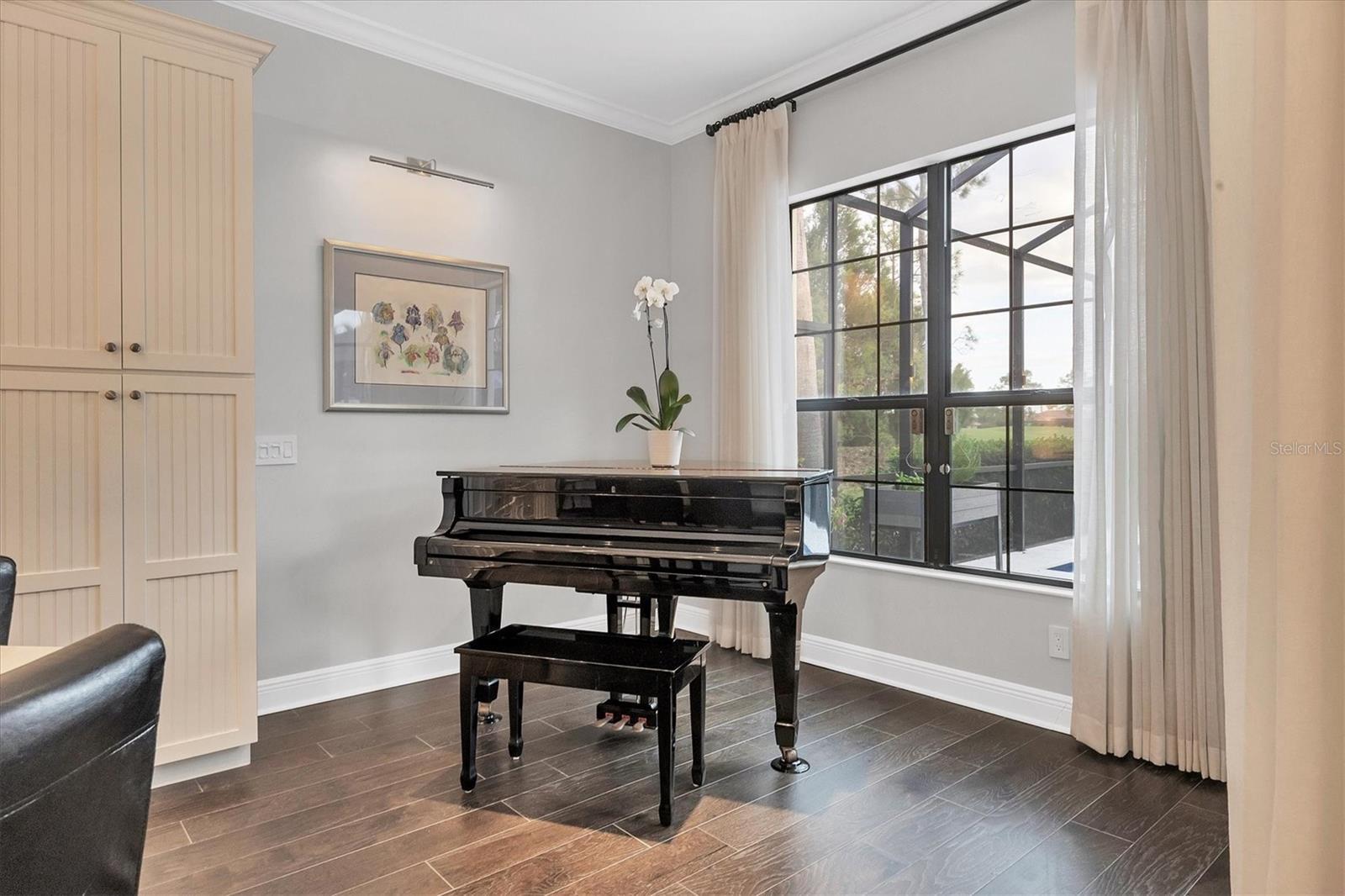 Majestically overlooking the sixth fairway of the esteemed Royal Lakes Golf Course, this exceptional three-bedroom, three-bath plus den residence offers panoramic views that seamlessly blend lush greenery with serene tranquility adjacent to a non-buildable homesite offering the ultimate in privacy. Upon entering through grand double glass doors, one is immediately enveloped in an ambiance of elegance and warmth. Rich wood flooring, intricate crown molding and soaring tray ceilings adorned with designer fixtures create an inviting atmosphere. The expansive great room features a discreetly integrated entertainment center within custom cabinetry, enhancing functionality and aesthetic appeal. A well-appointed wet bar, complete with a wine refrigerator, dedicated wine storage and sink, stands ready to facilitate gracious entertaining. The open-concept kitchen is a culinary masterpiece, boasting 42-inch custom cabinetry, premium stainless steel appliances, including a JennAir refrigerator, a gas cooktop, double convection ovens, and a sprawling 9-by-5-foot central island ideal for meal preparation and casual dining. Adjacent, the sunlit breakfast nook offers a serene space to enjoy morning fare while overlooking the picturesque landscape. The primary suite serves as a private sanctuary, featuring double walk-in closets meticulously designed by California Closets, complete with a wall safe and locking drawers for added security. The spa-inspired en-suite bath showcases split vanities, a spacious walk-in shower and exquisite tile work. Two additional guest suites provide comfort and privacy, each thoughtfully designed with ample storage and en-suite facilities. A versatile den offers flexibility to serve as a home office or library, catering to various lifestyle needs. Expansive sliding doors reveal a breathtaking lanai, where tongue-and-groove wood ceiling detailing adds warmth and character. The outdoor kitchen is a chef’s delight, equipped with a large gas grill, glass-front refrigerator, full-sized oven and stainless steel backsplash, ideal for alfresco dining. The recently expanded 25-by-12-foot heated saltwater pool and spa area, adorned with travertine decking, variable LED lighting and an auto-filler system, offers an idyllic setting for relaxation and entertainment, all while overlooking the tranquil golf course. Additional features include three-car garage equipped with a 220-volt EV charging system, Smart Home NEST thermostats to ensure optimal climate control and energy efficiency. Both interior and exterior have been repainted, complemented by enhanced landscaping and lighting. Residents of Country Club East enjoy access to a wealth of amenities, including The Retreat with lap pool, walking paths, a dog park and two additional resort-style pools. For an optional and additional fee, residents can enjoy a private membership that includes four championship golf courses, Cypress Links, King’s Dunes, Legacy and Royal Lakes, clubhouse with dining and bar services, fitness center and spa services. Country Club East is conveniently near top-rated schools, fine dining, boutique shopping and cultural attractions. This extraordinary estate offers a harmonious blend of opulence, comfort and unparalleled views, presenting a rare opportunity to experience the quintessential Florida lifestyle. Schedule your private tour today to fully appreciate the exceptional craftsmanship and unique features of this remarkable home.