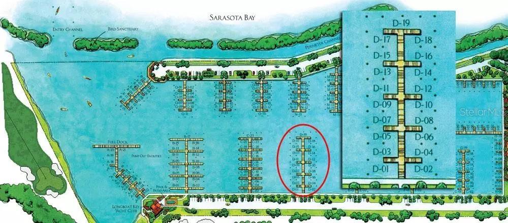 A one of a kind boat slip available for sale with fortified pilings that are plastic coated and an extended finger pier, deep water, protected, yet easy access to Sarasota Bay and the Gulf at Longboat Key Moorings Marina. This is a 154 ft. T-dock/face dock ready to accommodate a yacht; T of D-dock has 2 50s/100 service outlets. D-19 is 74.5 feet, and D-20 is 79.5 feet, because this slip is deeded as two slips, two boats are permitted. Direct access to Sarasota Bay and the ICW with exceptional views of Sarasota Bay. This only deep water marina on the West Coast of Florida is as much a luxury resort as any other neighborhood on the island, thanks to individual slip ownership, Marina village that includes bath house, laundry facilities, restaurant, shopping - close to Publix, CVS, and other specialty shops - recreational and social activities, on-site maintenance and concierge services. Electric, water and wireless internet access at each slip. Free shuttle to St. Armand's Circle. The Marina has everything a boater could need. Membership at the Longboat Key Club is available for an additional fee. This slip will accommodate one or two vessels total 149 feet. Usable beam is 25 feet.
