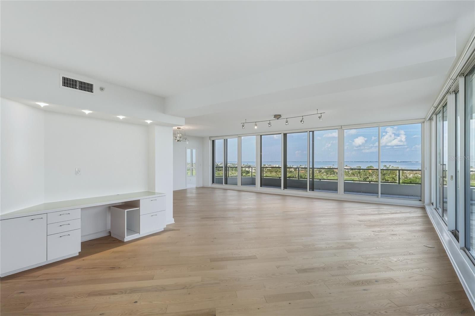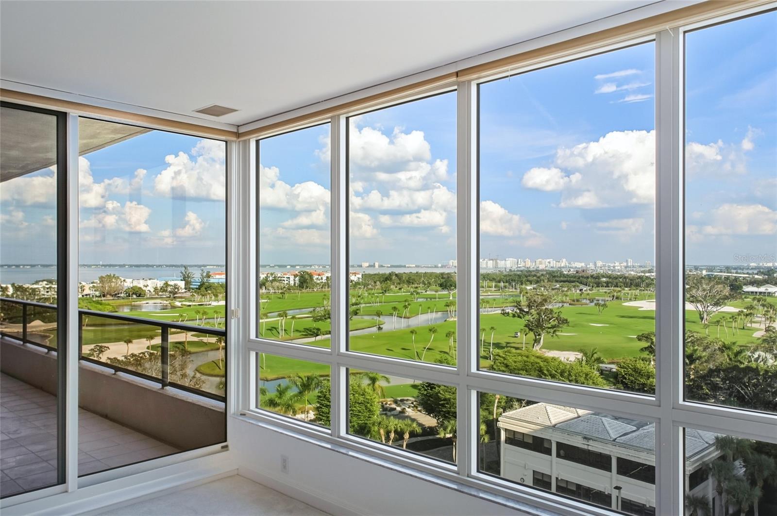 This residence offers an unparalleled luxury living experience within The Sanctuary, a secure, premiere beachfront community located behind the gates of the Longboat Key Club on south Longboat Key. Whether you are looking for a peaceful retreat or a permanent residence, this beachfront paradise has it all. Recently and completely renovated, this south-east corner location provides massive views of Sarasota Bay, the downtown city skyline, and the manicured golf course greens. The moment you step inside this 8th-floor residence, you are greeted by expansive, uninterrupted views enhanced by recently replaced floor-to-ceiling hurricane-impact sliders and windows. A spacious great room with exquisite wood flooring offers an unforgettable backdrop of the sparkling city lights and holiday firework displays, perfect for entertaining. The adjacent den can easily be converted to a third bedroom. Watch the sunrise with your coffee from the breakfast nook in the kitchen, or step outside and pick a spot on the large wraparound terrace for a more immersive experience that includes the fresh morning breeze and sounds of tropical birds. Home chefs will appreciate the large center island and the recent updates, including Calacatta Quartz counters, waterfall edges and backsplash, porcelain tile flooring, updated cabinetry, and all new hardware. The private primary suite boasts a customized walk-in closet, new plush carpeting, terrace access, and more panoramic views. The luxurious ensuite bath features dual vanities updated with Calacatta Quartz, all new hardware and lighting, a separate shower and water closet, and a newly refinished bathtub. Guests will be pampered in the ensuite guest bedroom with its own unique view that includes the Bay, the golf course and even a peek at the Gulf waters, along with new plush carpeting and ensuite bath including new Calacatta Quartz countertops, enhanced lighting, updated cabinetry, and all new hardware. The residence also includes a dedicated laundry room with new cabinetry, Calacatta Quartz counters and sink, one under-building parking spot, extra storage, and a freshly painted interior. Located on 18 incredible beachfront acres, The Sanctuary offers resort-style living with abundant amenities including 24-hour staffed security gate and onsite management, Olympic-sized heated pool and spa, lighted tennis courts and fitness center. Trails and a clubhouse with planned activities. For those seeking additional lifestyle amenities, optional membership to the Longboat Key Club allows access to superior golf courses, six private restaurants, a spa and wellness center, and other AAA four-diamond beach resort offerings.