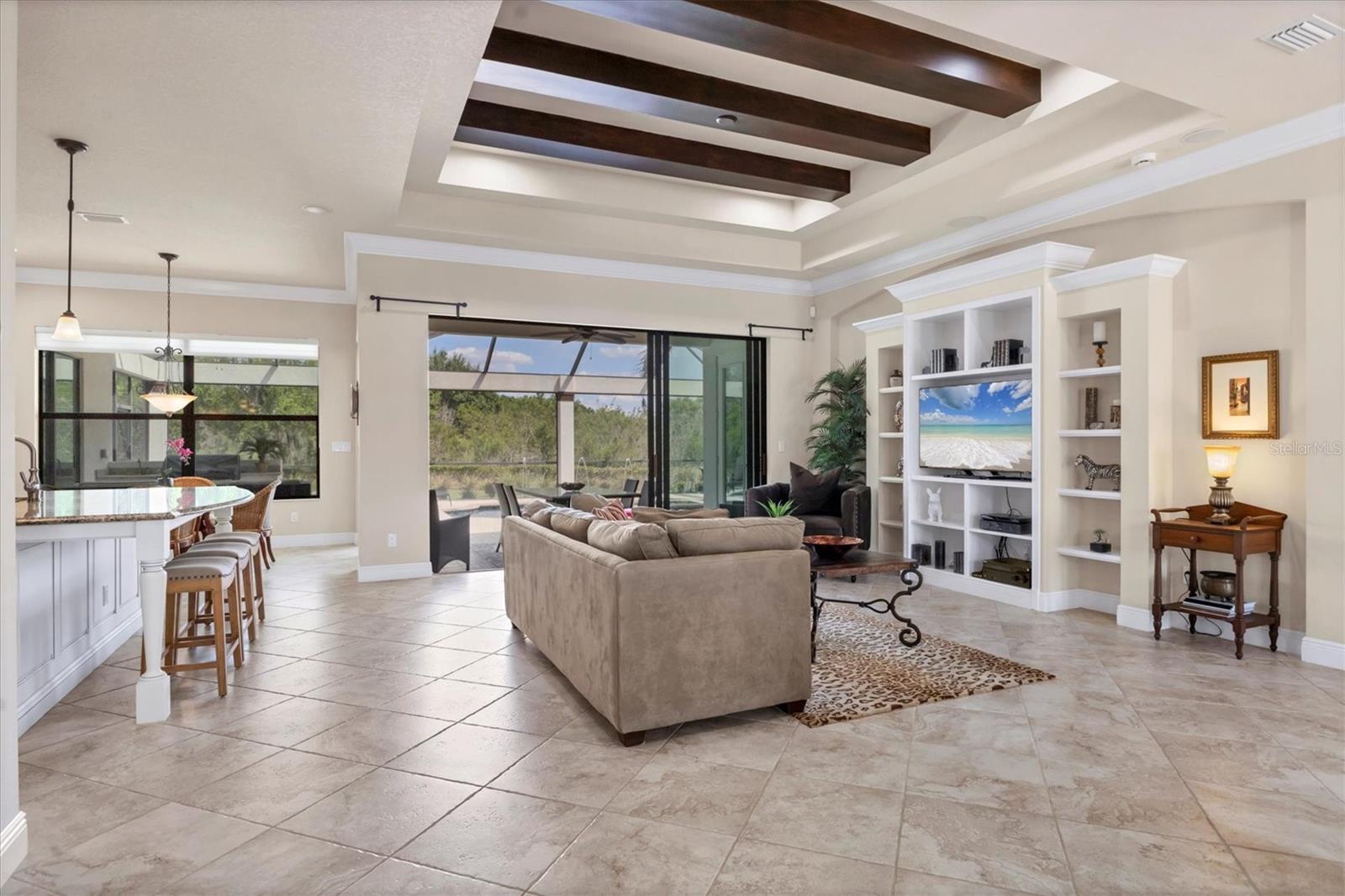 - Built-in Features, Ceiling Fans(s), Eat-in Kitchen, High Ceilings, Kitchen/Family Room Combo, Open Floorplan, Solid Wood Cabinets, Split Bedroom, Stone Counters, Thermostat, Tray Ceiling(s), Walk-In Closet(s), Window Treatments