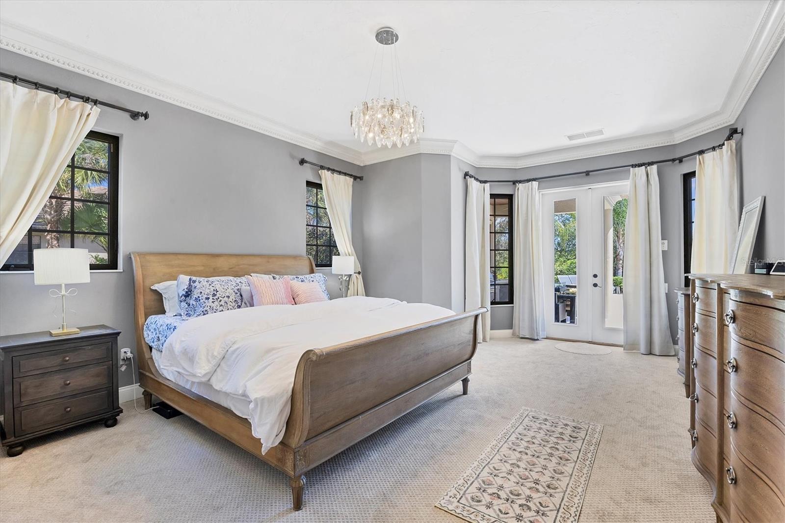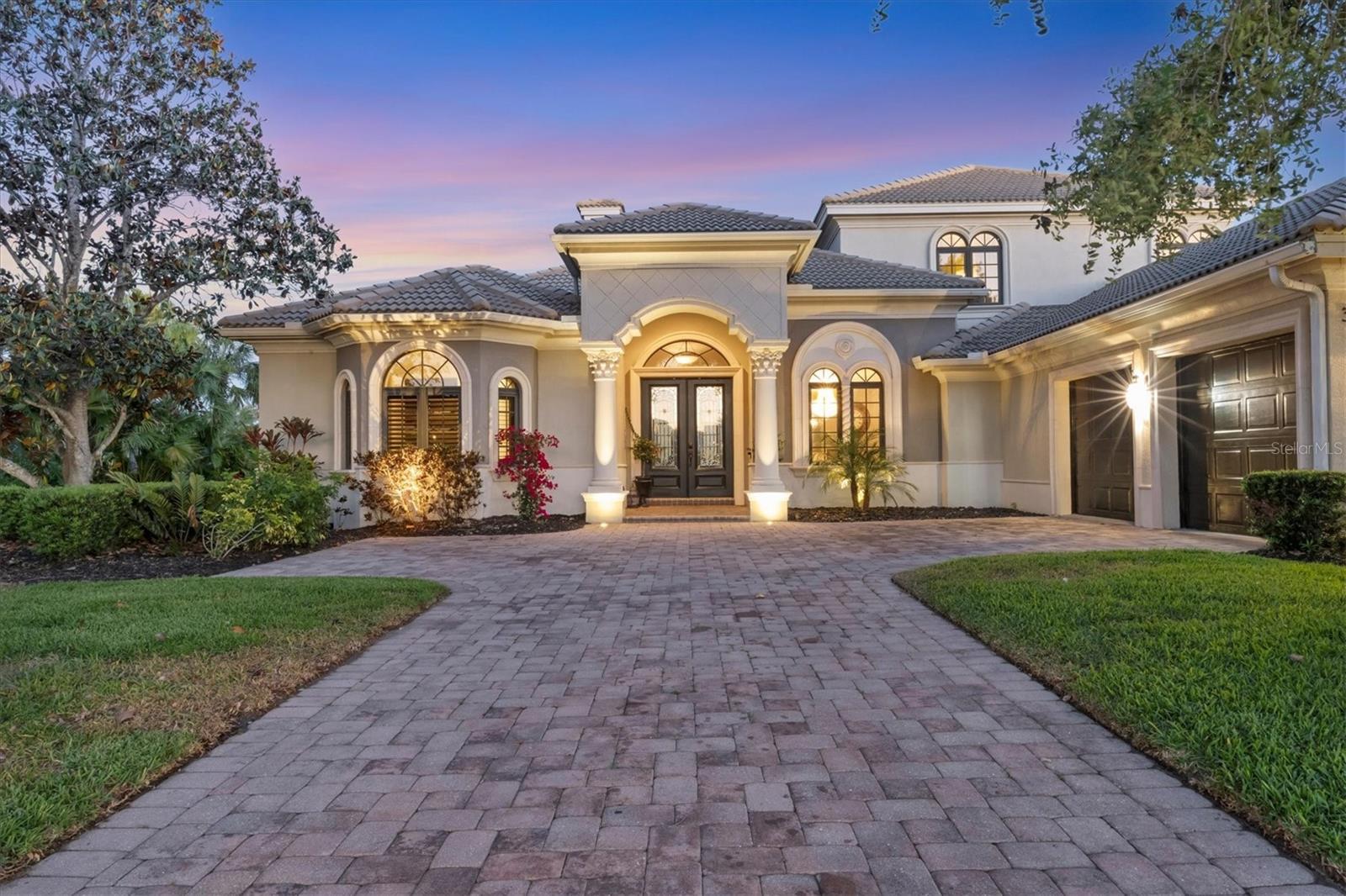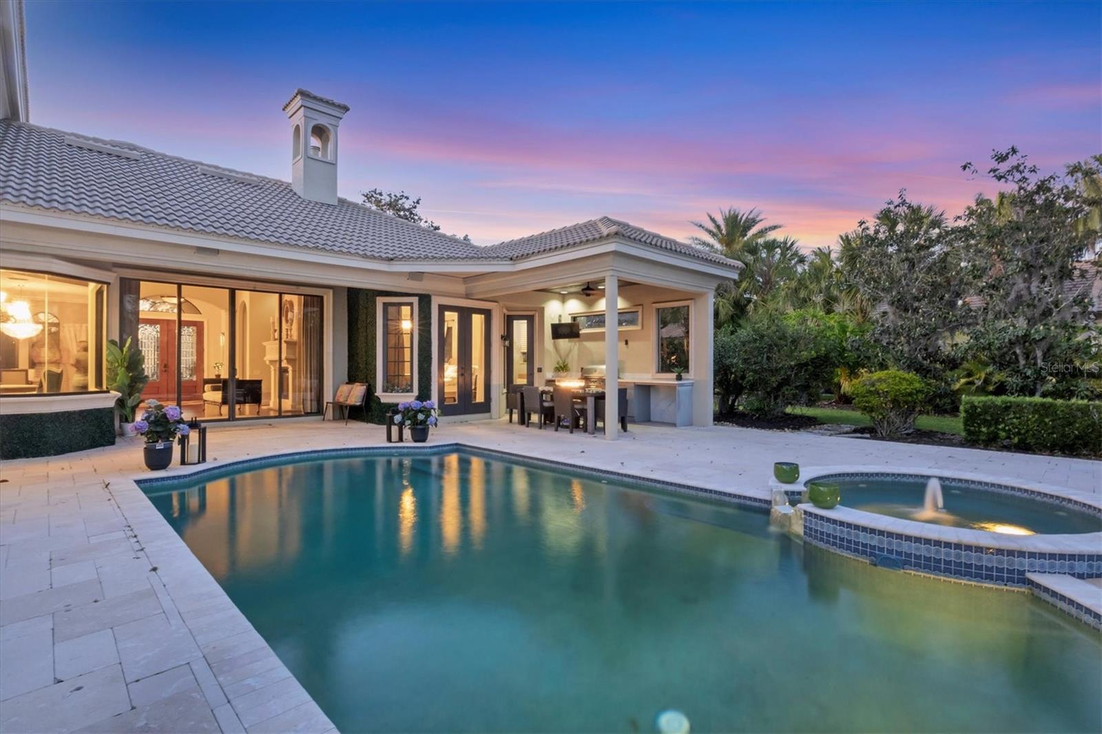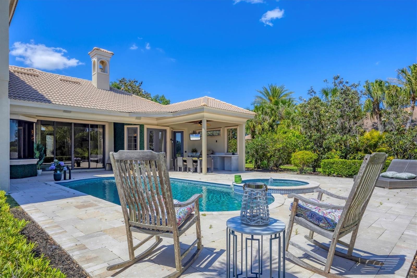 Welcome to luxury living in the exclusive, gated community of The Founders Club, where timeless elegance meets modern sophistication in this beautifully designed estate home. Nestled beneath mature oaks and surrounded by lush landscaping, this stately Todd Johnson custom residence boasts Mediterranean-inspired architecture with exquisite curb appeal and a grand columned entryway. Step through the double glass doors into a meticulously curated interior featuring rich hardwood floors, custom millwork, and soaring ceilings that accentuate the open-concept living spaces. Coffered ceilings, arched doorways, and a beautifully appointed fireplace create a sophisticated yet inviting atmosphere for entertaining. Expansive glass sliders lead you to a serene outdoor haven, featuring a sparkling pool, spa, outdoor kitchen, covered lanai, and a private backyard surrounded by tropical palms and manicured hedges. The gourmet kitchen is a true chef’s dream, complete with high-end stainless steel appliances, a gas range, granite countertops, a spacious center island with seating, and detailed wood cabinetry that exudes warmth and craftsmanship. Just off the kitchen, a cozy breakfast nook provide the perfect setting for casual meals or morning coffee, framed by large windows offering views of the lush outdoor retreat. The primary suite is a sanctuary of elegance and tranquility, blending classic architecture with modern comforts. Bathed in natural light from multiple windows and French doors, this spacious bedroom features a graceful tray ceiling with crown molding and a sparkling crystal chandelier that anchors the room with sophistication. This beautifully appointed home offers a thoughtful and versatile layout, perfect for both everyday living and entertaining. The office/den space is bright and airy, thanks to a trio of large bay windows that offer expansive views of the surrounding landscape and natural light. French doors with glass panes open into the living room, enhancing the sense of openness and connection to the rest of the home. The first floor also features a half bath, as well as private guest room with an adjacent full bath, offering comfort and convenience for visiting friends or extended family. Upstairs, you'll find a spacious bonus room complete with a charming balcony overlooking the pool and garden, that provides endless possibilities as a media room, playroom, or home gym. Two generously sized bedrooms share a well-appointed bathroom, making it an ideal retreat for kids or guests.The Founders Club offers an unparalleled lifestyle surrounded by 700 acres of natural Florida beauty. With just 262 homesites, this low-density enclave is designed for privacy and serenity. Residents enjoy access to a recreation center offering yoga and pilates classes, as well as Har-Tru tennis courts, pickleball, basketball, sand volleyball, and a kid's playground. Membership at the Founders Golf Club is optional offering both golf and social memberships. The renowned Robert Trent Jones Jr. golf course offers members easy tee times and is one of the only walkable courses in the region. Members enjoy a a grand Southern-style clubhouse, fine dining, a year-round social calendar, and a 24/7 fitness facility. It’s more than a home—it’s a lifestyle curated for those who appreciate understated luxury and quiet prestige. All just minutes from exquisite dining, shopping, and the vibrant art scene of downtown Sarasota, as well as Sarasota's incredible beaches.