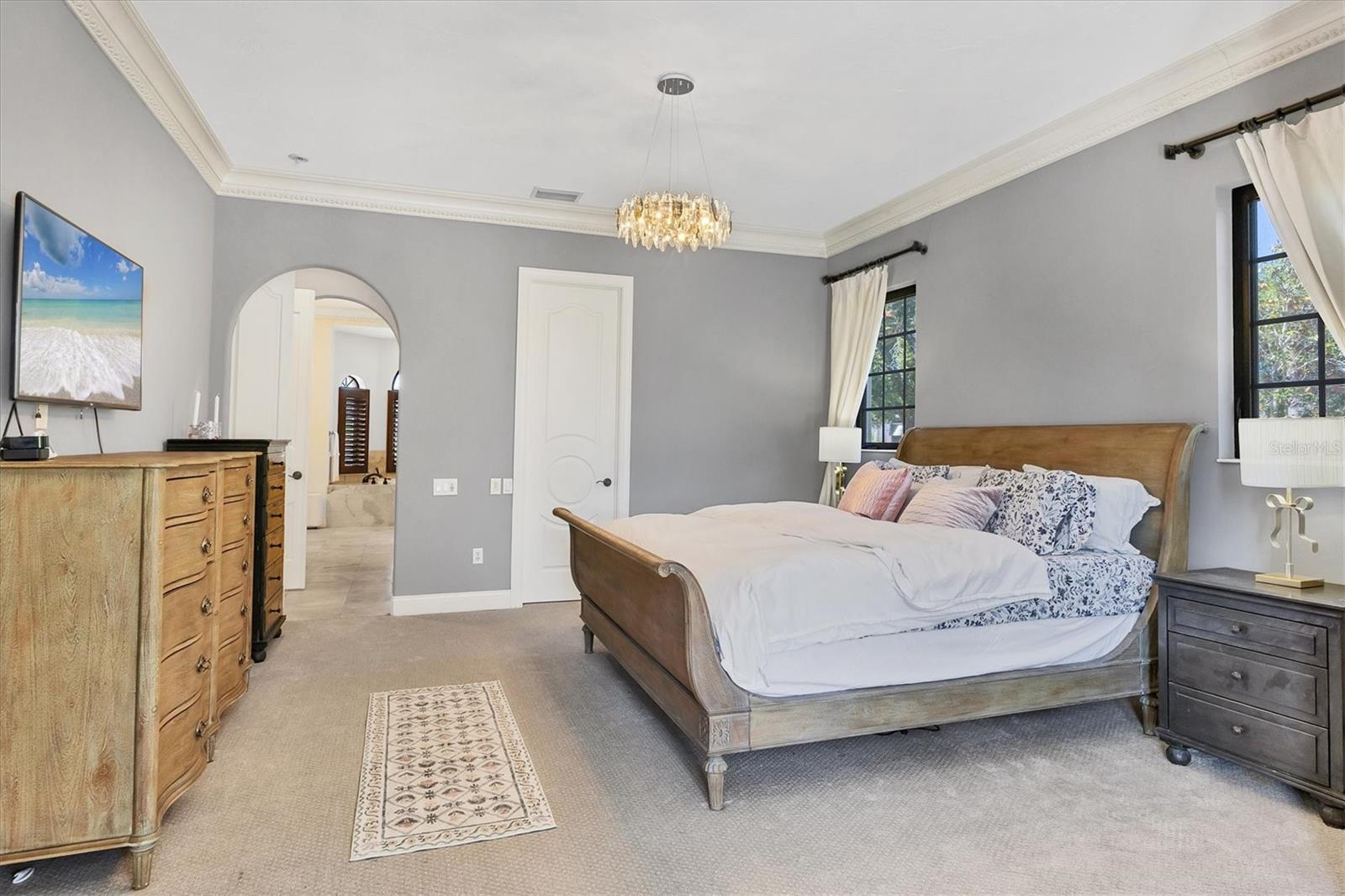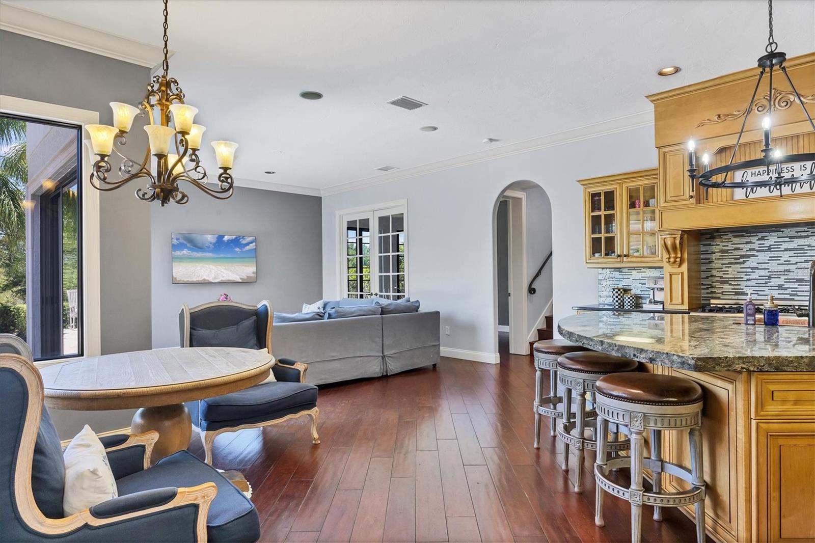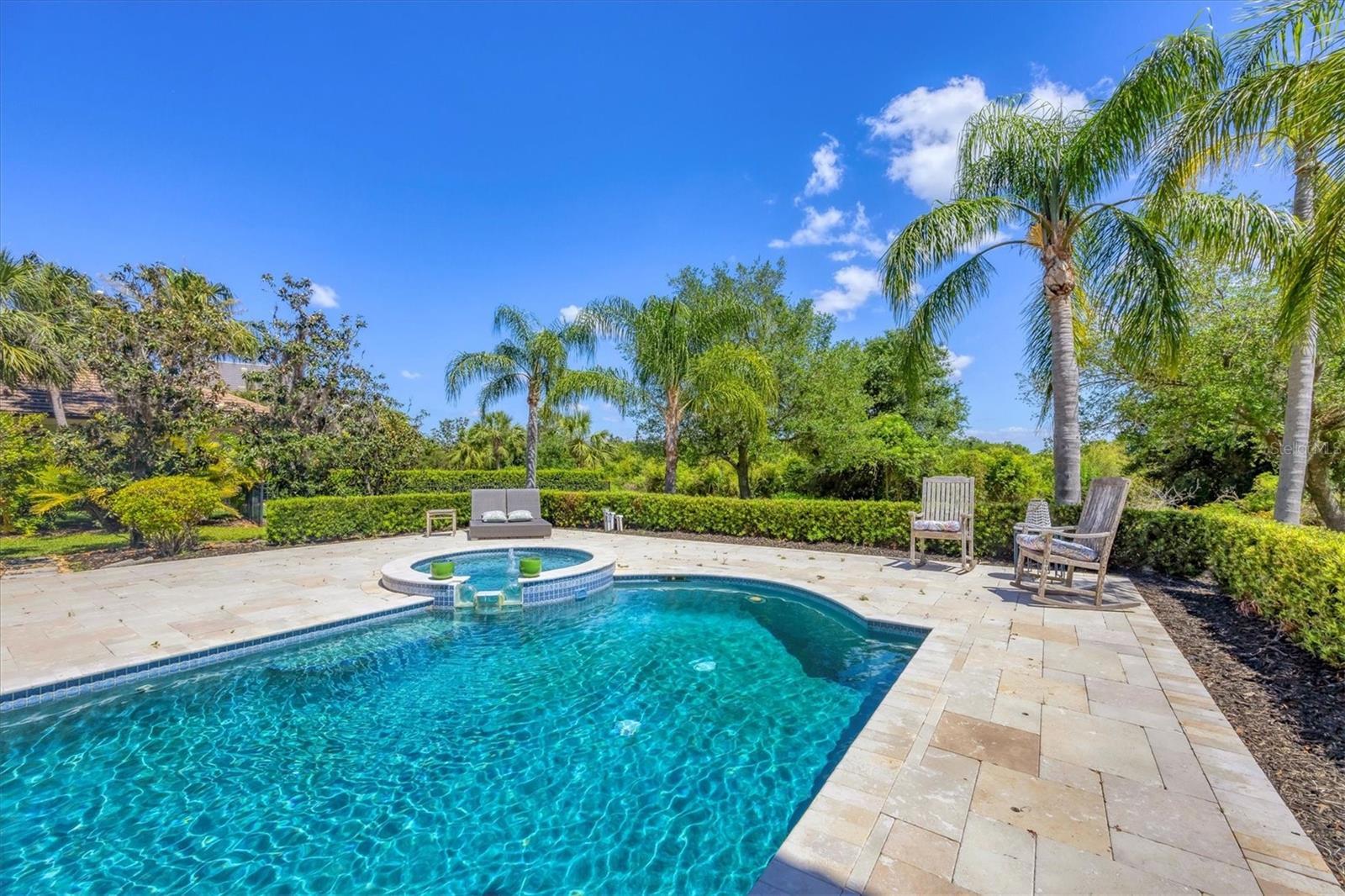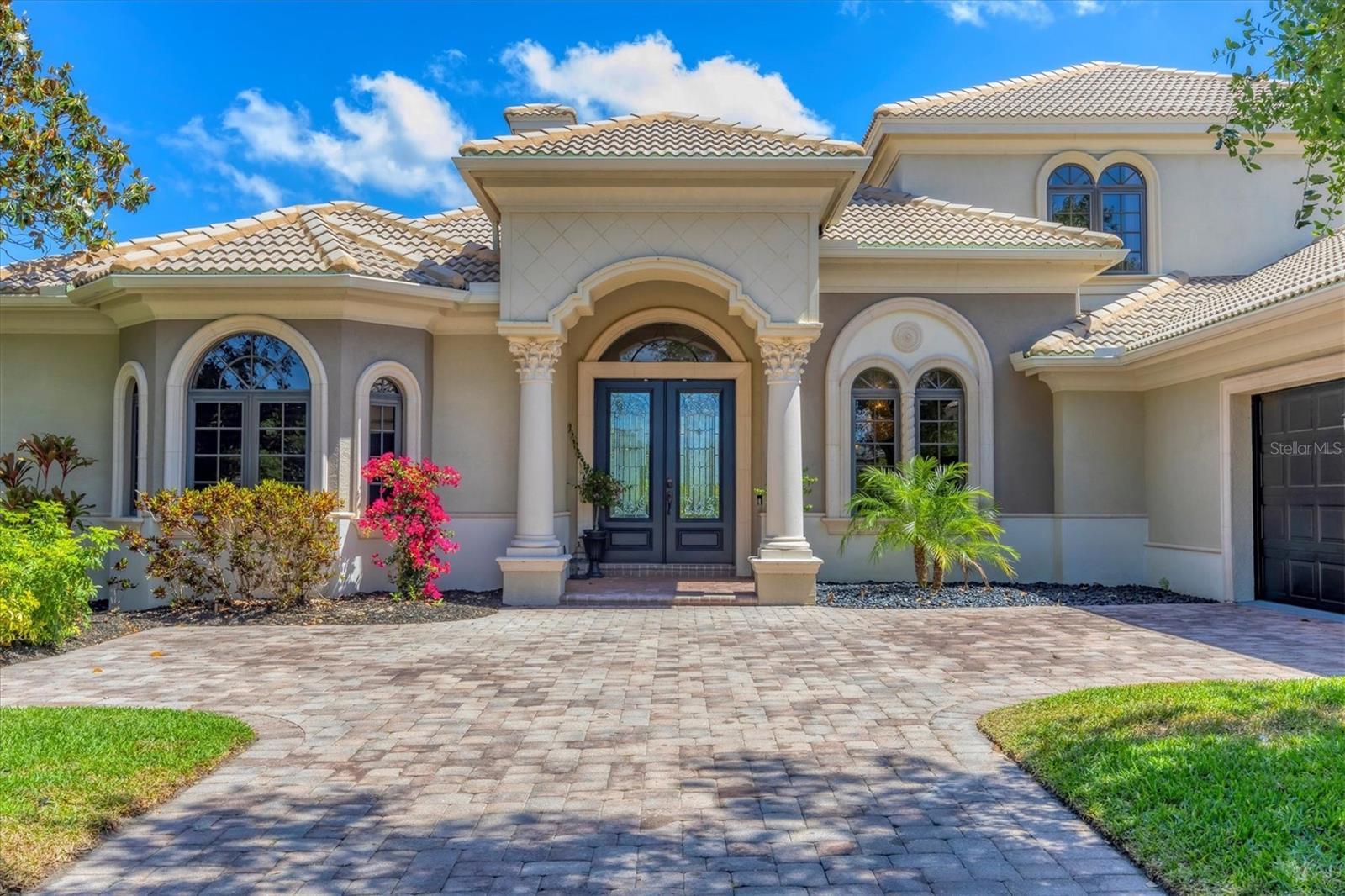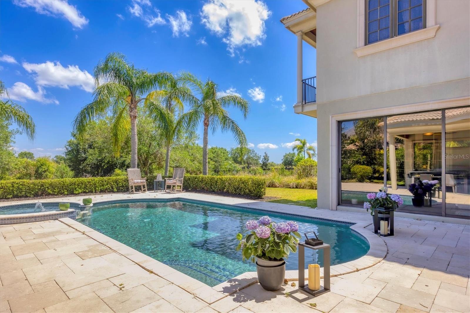 Welcome to luxury living in the exclusive, gated community of The Founders Club, where timeless elegance meets modern sophistication in this beautifully designed estate home. Nestled beneath mature oaks and surrounded by lush landscaping, this stately Todd Johnson custom residence boasts Mediterranean-inspired architecture with exquisite curb appeal and a grand columned entryway. Step through the double glass doors into a meticulously curated interior featuring rich hardwood floors, custom millwork, and soaring ceilings that accentuate the open-concept living spaces. Coffered ceilings, arched doorways, and a beautifully appointed fireplace create a sophisticated yet inviting atmosphere for entertaining. Expansive glass sliders lead you to a serene outdoor haven, featuring a sparkling pool, spa, outdoor kitchen, covered lanai, and a private backyard surrounded by tropical palms and manicured hedges. The gourmet kitchen is a true chef’s dream, complete with high-end stainless steel appliances, a gas range, granite countertops, a spacious center island with seating, and detailed wood cabinetry that exudes warmth and craftsmanship. Just off the kitchen, a cozy breakfast nook provide the perfect setting for casual meals or morning coffee, framed by large windows offering views of the lush outdoor retreat. The primary suite is a sanctuary of elegance and tranquility, blending classic architecture with modern comforts. Bathed in natural light from multiple windows and French doors, this spacious bedroom features a graceful tray ceiling with crown molding and a sparkling crystal chandelier that anchors the room with sophistication. This beautifully appointed home offers a thoughtful and versatile layout, perfect for both everyday living and entertaining. The office/den space is bright and airy, thanks to a trio of large bay windows that offer expansive views of the surrounding landscape and natural light. French doors with glass panes open into the living room, enhancing the sense of openness and connection to the rest of the home. The first floor also features a half bath, as well as private guest room with an adjacent full bath, offering comfort and convenience for visiting friends or extended family. Upstairs, you'll find a spacious bonus room complete with a charming balcony overlooking the pool and garden, that provides endless possibilities as a media room, playroom, or home gym. Two generously sized bedrooms share a well-appointed bathroom, making it an ideal retreat for kids or guests.The Founders Club offers an unparalleled lifestyle surrounded by 700 acres of natural Florida beauty. With just 262 homesites, this low-density enclave is designed for privacy and serenity. Residents enjoy access to a recreation center offering yoga and pilates classes, as well as Har-Tru tennis courts, pickleball, basketball, sand volleyball, and a kid's playground. Membership at the Founders Golf Club is optional offering both golf and social memberships. The renowned Robert Trent Jones Jr. golf course offers members easy tee times and is one of the only walkable courses in the region. Members enjoy a a grand Southern-style clubhouse, fine dining, a year-round social calendar, and a 24/7 fitness facility. It’s more than a home—it’s a lifestyle curated for those who appreciate understated luxury and quiet prestige. All just minutes from exquisite dining, shopping, and the vibrant art scene of downtown Sarasota, as well as Sarasota's incredible beaches.