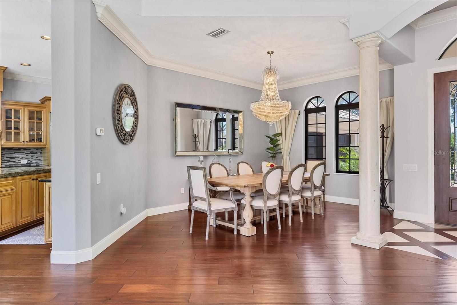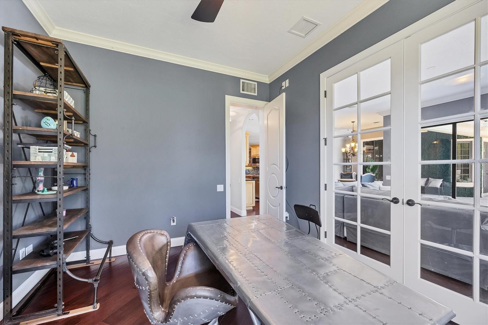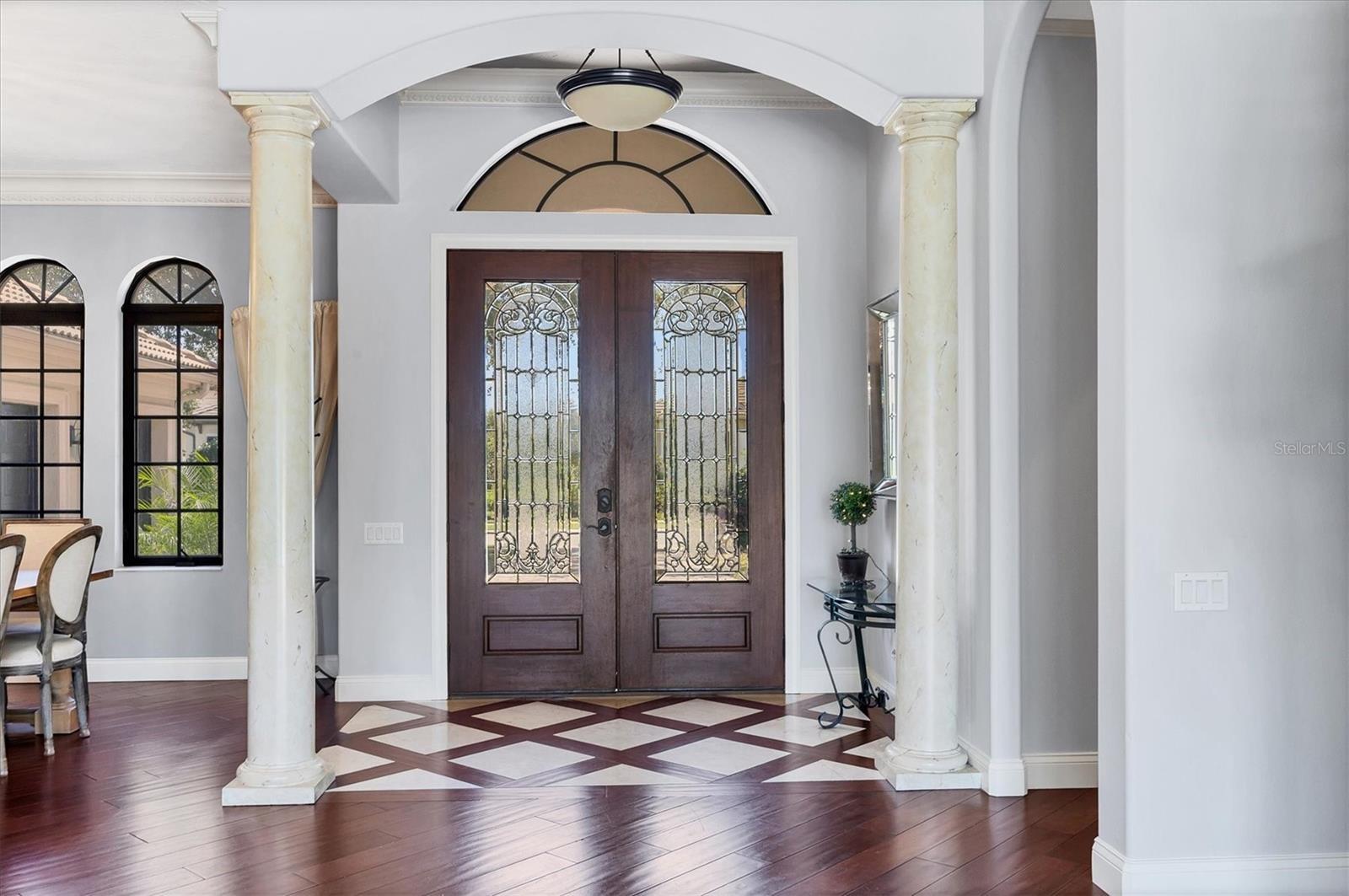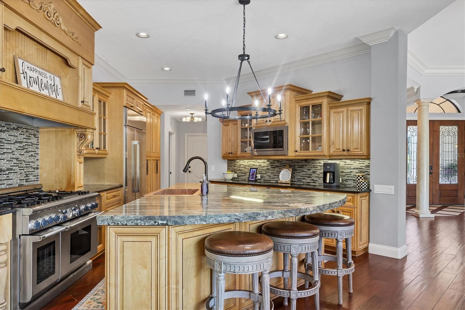 Welcome to luxury living in the exclusive, gated community of The Founders Club, where timeless elegance meets modern sophistication in this beautifully designed estate home. Nestled beneath mature oaks and surrounded by lush landscaping, this stately Todd Johnson custom residence boasts Mediterranean-inspired architecture with exquisite curb appeal and a grand columned entryway. Step through the double glass doors into a meticulously curated interior featuring rich hardwood floors, custom millwork, and soaring ceilings that accentuate the open-concept living spaces. Coffered ceilings, arched doorways, and a beautifully appointed fireplace create a sophisticated yet inviting atmosphere for entertaining. Expansive glass sliders lead you to a serene outdoor haven, featuring a sparkling pool, spa, outdoor kitchen, covered lanai, and a private backyard surrounded by tropical palms and manicured hedges. The gourmet kitchen is a true chef’s dream, complete with high-end stainless steel appliances, a gas range, granite countertops, a spacious center island with seating, and detailed wood cabinetry that exudes warmth and craftsmanship. Just off the kitchen, a cozy breakfast nook provide the perfect setting for casual meals or morning coffee, framed by large windows offering views of the lush outdoor retreat. The primary suite is a sanctuary of elegance and tranquility, blending classic architecture with modern comforts. Bathed in natural light from multiple windows and French doors, this spacious bedroom features a graceful tray ceiling with crown molding and a sparkling crystal chandelier that anchors the room with sophistication. This beautifully appointed home offers a thoughtful and versatile layout, perfect for both everyday living and entertaining. The office/den space is bright and airy, thanks to a trio of large bay windows that offer expansive views of the surrounding landscape and natural light. French doors with glass panes open into the living room, enhancing the sense of openness and connection to the rest of the home. The first floor also features a half bath, as well as private guest room with an adjacent full bath, offering comfort and convenience for visiting friends or extended family. Upstairs, you'll find a spacious bonus room complete with a charming balcony overlooking the pool and garden, that provides endless possibilities as a media room, playroom, or home gym. Two generously sized bedrooms share a well-appointed bathroom, making it an ideal retreat for kids or guests.The Founders Club offers an unparalleled lifestyle surrounded by 700 acres of natural Florida beauty. With just 262 homesites, this low-density enclave is designed for privacy and serenity. Residents enjoy access to a recreation center offering yoga and pilates classes, as well as Har-Tru tennis courts, pickleball, basketball, sand volleyball, and a kid's playground. Membership at the Founders Golf Club is optional offering both golf and social memberships. The renowned Robert Trent Jones Jr. golf course offers members easy tee times and is one of the only walkable courses in the region. Members enjoy a a grand Southern-style clubhouse, fine dining, a year-round social calendar, and a 24/7 fitness facility. It’s more than a home—it’s a lifestyle curated for those who appreciate understated luxury and quiet prestige. All just minutes from exquisite dining, shopping, and the vibrant art scene of downtown Sarasota, as well as Sarasota's incredible beaches.
