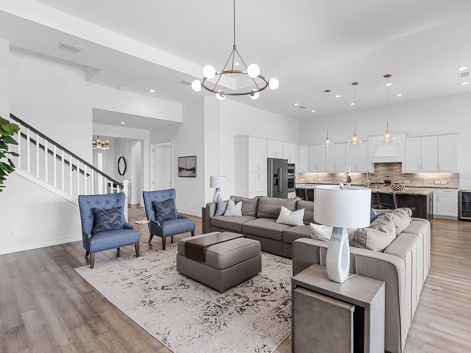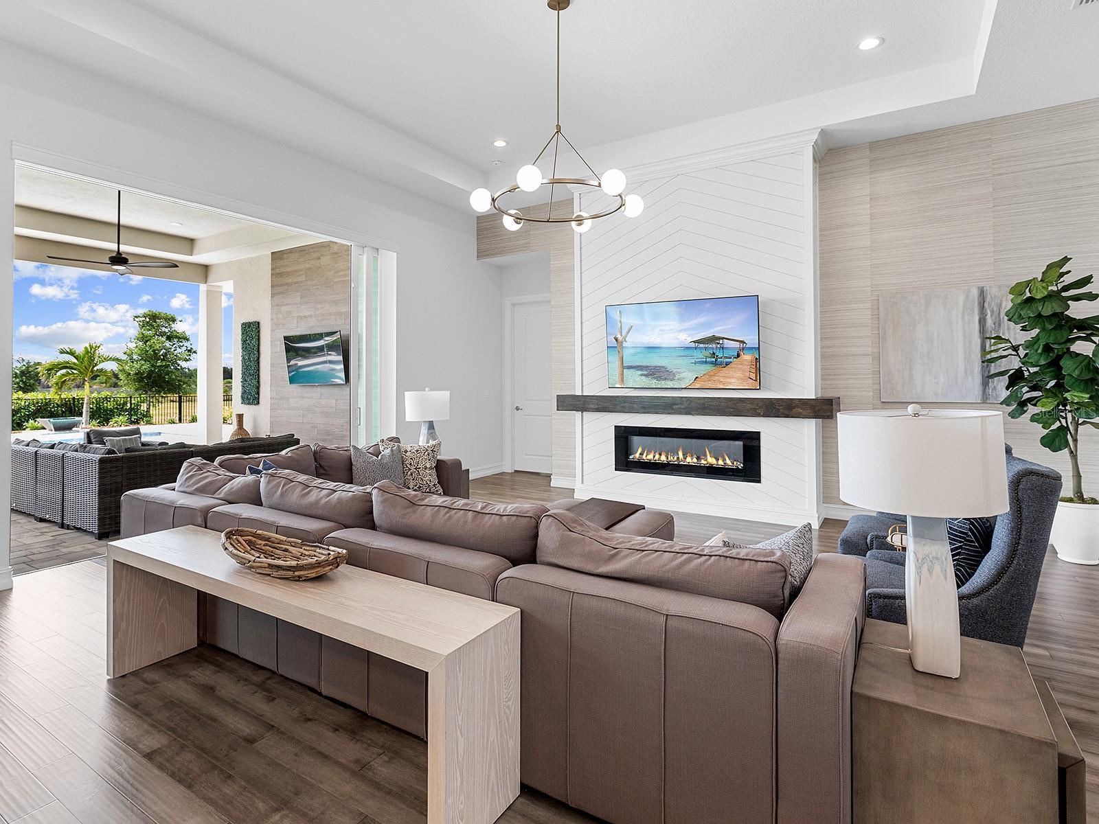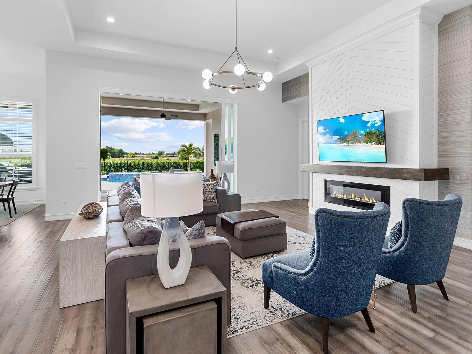 This is an exceptional residence tucked within the gates of Lakewood Ranch’s exclusive community, The Lake Club. With its elegant Eaton Grand III floor plan, this 2021-built estate offers effortless luxury. The home’s stately curb appeal sets the tone from the moment you arrive, with a side-load three-car garage, oversized paver driveway and manicured landscaping. Step through the front door into a soaring foyer adorned with accent trim, crown molding and a designer chandelier. Throughout the home, rich engineered hardwood flooring, plantation shutters, and sophisticated finishes speak to the care and detail poured into every room. The great room is an expansive space framed by a wallpaper accent wall and a striking linear fireplace with herringbone shiplap and a wood mantel. Pocketing sliders disappear to connect indoor-outdoor living. The kitchen boasts stainless steel KitchenAid appliances, including a five-burner gas cooktop with a statement hood and built-in oven and microwave/convection, granite countertops, stone backsplash and abundant cabinetry with under-cabinet lighting. A generous pantry cabinet, a lazy Susan corner cabinet, and an oversized island create ease for daily routines and entertaining. Just off the kitchen, the dining area is flooded with natural light from two large windows and elevated by a designer chandelier. Secluded in its own wing, the primary suite is a private retreat featuring an alcove entry, shiplap accent walls, a sitting area and two custom walk-in closets with thoughtful built-ins. The en-suite bath is complete with dual vanities, a soaking tub, a walk-in shower and a private water closet. Three additional bedrooms provide comfort and flexibility. One guest suite includes a private bath, while two more share a full bath in a cleverly designed pocketed guest wing. A quiet office, accessible through French doors, offers the perfect space for a home office or library. Upstairs, the loft offers versatile bonus space while an adjacent fitness room, or potential fourth bedroom, features three large windows and a spacious closet. A full bath with quartz-topped vanity and tub/shower completes the upper level. Step out to the lanai and enjoy a covered seating area centered around a custom media wall. The fully equipped summer kitchen includes a built-in Blaze grill, sink, mini refrigerator and granite countertops. The saltwater pool and spa await with blue tile accents, LED lighting, waterfall bowls with fire features and a sun shelf. A dedicated pool bath with quartz vanity and tile floors adds ease, and the included sauna invites relaxation. A brand new pool and lanai screen was installed July 2025. The fenced yard, bordered by mature landscaping, creates peace of mind for pets or children. Additional features include a well-appointed laundry room with granite counters and ample cabinetry, a large storage space under the stairs and a spacious three-car garage. In The Lake Club, residents enjoy access to a wealth of amenities, including two resort-style heated pools, a recently renovated clubhouse with fine dining and bar area, a fitness center, spa, tennis courts, pickleball, a playground, dog park, and services of a full-time concierge and activities director. Additionally, residents are near The Mall at UTC, LWR Main Street, Waterside Place and dining options. Experience luxury living in this home, where every detail has been carefully considered to provide the ultimate Lakewood Ranch lifestyle.