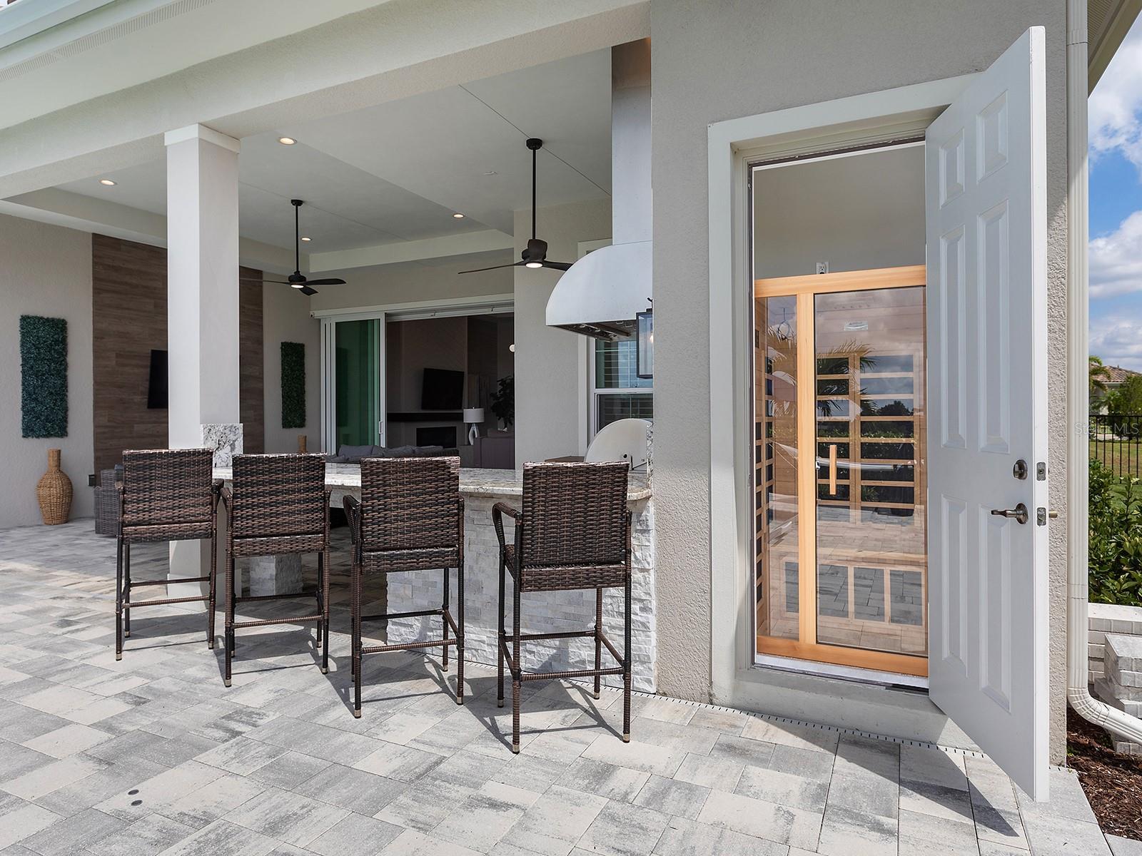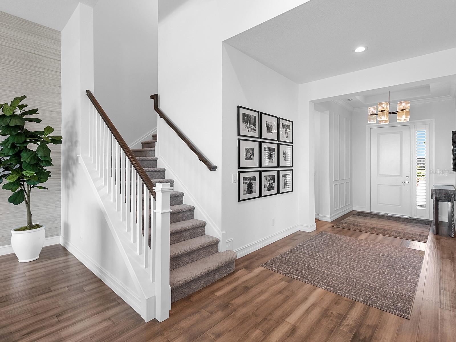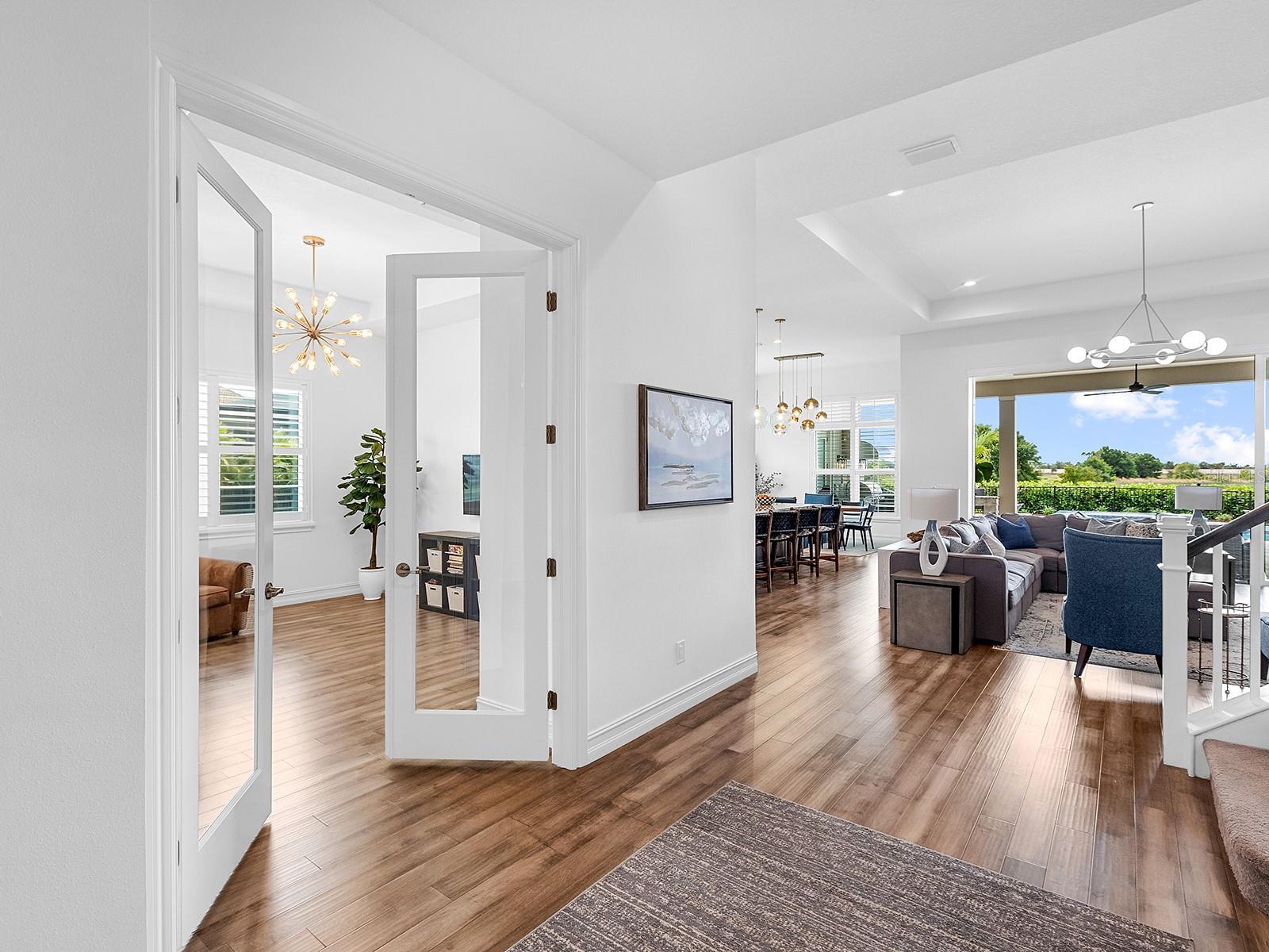 This is an exceptional residence tucked within the gates of Lakewood Ranch’s exclusive community, The Lake Club. With its elegant Eaton Grand III floor plan, this 2021-built estate offers effortless luxury. The home’s stately curb appeal sets the tone from the moment you arrive, with a side-load three-car garage, oversized paver driveway and manicured landscaping. Step through the front door into a soaring foyer adorned with accent trim, crown molding and a designer chandelier. Throughout the home, rich engineered hardwood flooring, plantation shutters, and sophisticated finishes speak to the care and detail poured into every room. The great room is an expansive space framed by a wallpaper accent wall and a striking linear fireplace with herringbone shiplap and a wood mantel. Pocketing sliders disappear to connect indoor-outdoor living. The kitchen boasts stainless steel KitchenAid appliances, including a five-burner gas cooktop with a statement hood and built-in oven and microwave/convection, granite countertops, stone backsplash and abundant cabinetry with under-cabinet lighting. A generous pantry cabinet, a lazy Susan corner cabinet, and an oversized island create ease for daily routines and entertaining. Just off the kitchen, the dining area is flooded with natural light from two large windows and elevated by a designer chandelier. Secluded in its own wing, the primary suite is a private retreat featuring an alcove entry, shiplap accent walls, a sitting area and two custom walk-in closets with thoughtful built-ins. The en-suite bath is complete with dual vanities, a soaking tub, a walk-in shower and a private water closet. Three additional bedrooms provide comfort and flexibility. One guest suite includes a private bath, while two more share a full bath in a cleverly designed pocketed guest wing. A quiet office, accessible through French doors, offers the perfect space for a home office or library. Upstairs, the loft offers versatile bonus space while an adjacent fitness room, or potential fourth bedroom, features three large windows and a spacious closet. A full bath with quartz-topped vanity and tub/shower completes the upper level. Step out to the lanai and enjoy a covered seating area centered around a custom media wall. The fully equipped summer kitchen includes a built-in Blaze grill, sink, mini refrigerator and granite countertops. The saltwater pool and spa await with blue tile accents, LED lighting, waterfall bowls with fire features and a sun shelf. A dedicated pool bath with quartz vanity and tile floors adds ease, and the included sauna invites relaxation. A brand new pool and lanai screen was installed July 2025. The fenced yard, bordered by mature landscaping, creates peace of mind for pets or children. Additional features include a well-appointed laundry room with granite counters and ample cabinetry, a large storage space under the stairs and a spacious three-car garage. In The Lake Club, residents enjoy access to a wealth of amenities, including two resort-style heated pools, a recently renovated clubhouse with fine dining and bar area, a fitness center, spa, tennis courts, pickleball, a playground, dog park, and services of a full-time concierge and activities director. Additionally, residents are near The Mall at UTC, LWR Main Street, Waterside Place and dining options. Experience luxury living in this home, where every detail has been carefully considered to provide the ultimate Lakewood Ranch lifestyle.