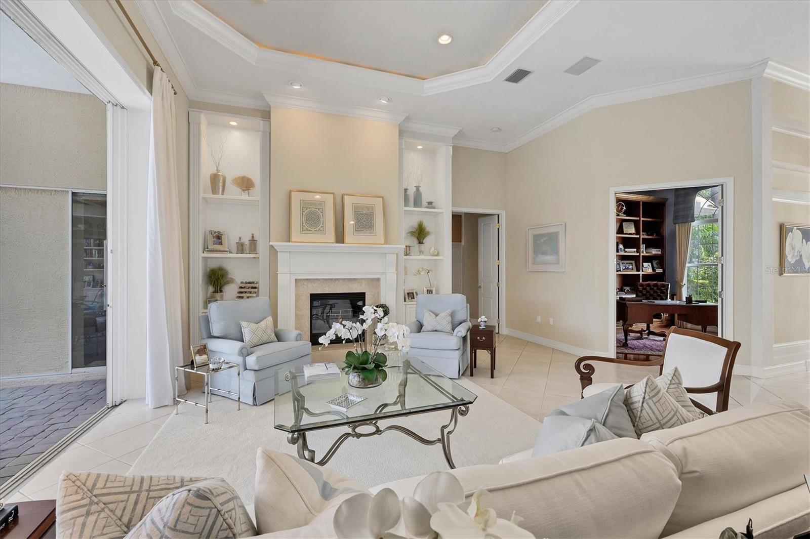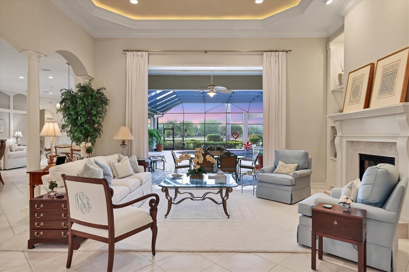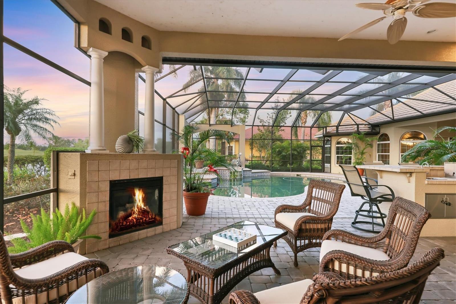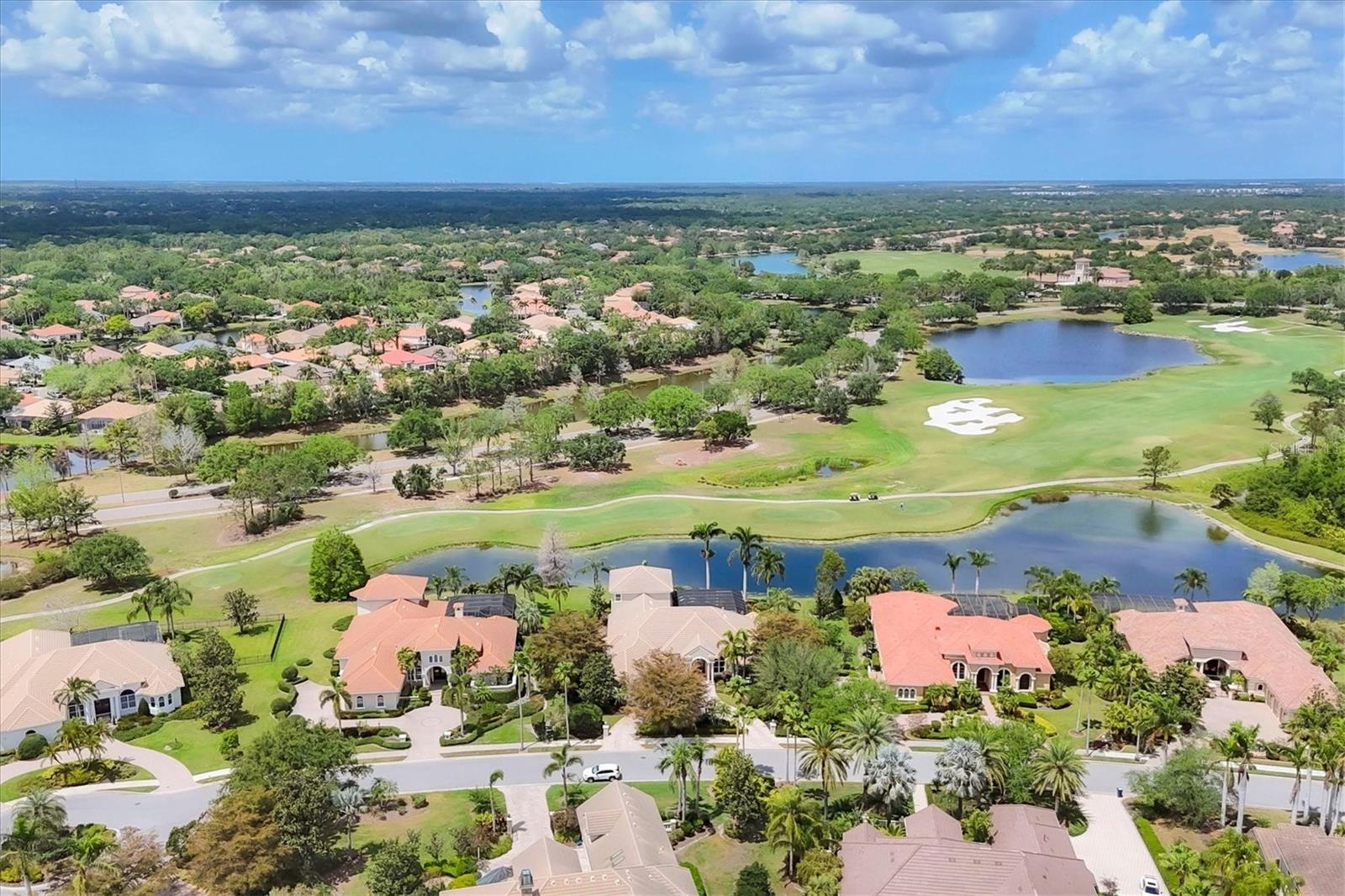 Under contract-accepting backup offers. Welcome to Portmarnock Place – an enclave that is home to some of the most stately properties in the Lakewood Ranch Country Club. Offered for the first time, this custom-built residence was created by the sellers and Pruett Builders to take advantage of the expansive views while providing a refined and elegant environment. Set on a generous half-acre lot on the 18th hole, this perfectly positioned home showcases long water, fairway and preserve views. As you approach the home you are greeted by a circular driveway and lush, mature landscaping. The grand double doors invite you in where you are presented with 12 foot ceilings, an ethereal living room with fireplace and built-ins, and a wall of glass framing the beautiful views that await. Fine architectural details grace most every area of this home – from lighted double and triple tray ceilings to feature walls and custom cabinetry, fine craftmanship is evidenced everywhere. If you enjoy entertaining you will find multiple areas to gather here – the elegant dining and main living rooms, adjacent wet bar with wine cooler, expansive family room, recreation room and multiple outdoor gathering areas provide ample options for family and guests. Accessing the outdoor space is made both easy and beautiful with 6 walls of the home featuring sliding glass doors that move completely out of view, essentially combining both indoor and outdoor environs. Once outside you’ll enjoy making and sharing memories by the heated salt-water pool and spa, the cozy conversation area by the fireplace and outdoor kitchen, and the intimate setting for two beyond the lanai where sunsets and sunrises are the main attraction. Inside you’ll enjoy preparing culinary creations in the expansive kitchen featuring high-end KitchenAid and Bosch appliances, custom-crafted cabinetry, large walk-in pantry, expansive counter space including a prep island, and plenty of seating. There’s even an additional seating area with a window seat and views through the aquarium glass to the pool area. When it’s time to end the day, you’ll find the owners’ suite, set apart at the opposite side of the home, is a comforting retreat. Behind the tall double doors is a spacious sleeping area with access to the lanai. Attached to this space behind double French doors is a private reflection and reading room, awash in natural light with a floor-to-ceiling custom bookcase. No luxury suite is complete without a generous spa-like bath, and you’ll find that here too. At over 4,700 square feet of living space under air, this residence comfortably offers 4 bedrooms, 4 full baths, oversized closets (several are walk-in), large laundry/workroom combo, a formal office/den with double French doors and a wall of built-ins, an upstairs living suite with a terrace featuring endless views, and a generous 3-bay garage with ample storage. The Lakewood Ranch Country Club offers extraordinary state-of-the-art amenities through membership choices – 4 golf courses, an aquatic and racket sports center, fitness facility and multiple dining options at the three clubhouses. Being a top master-planned community in the U.S., Lakewood Ranch puts its fortunate residents in the middle of endless dining, shopping, recreational and cultural options. Come experience for yourself what a coveted lifestyle can mean for you!