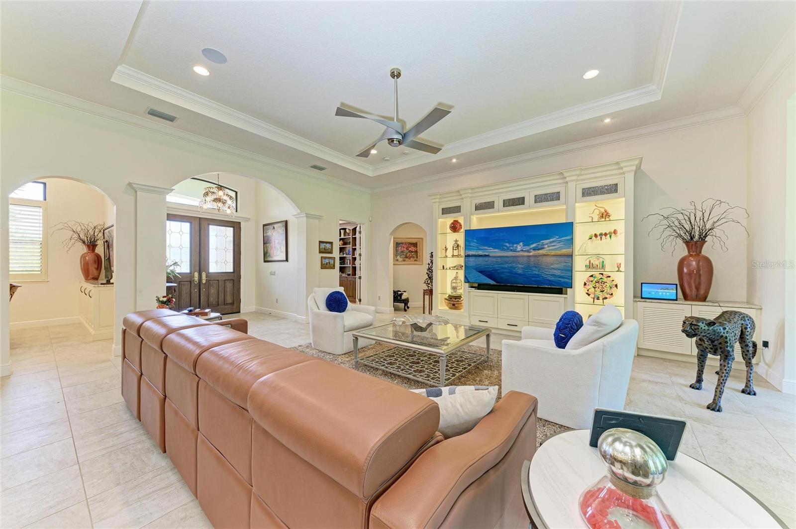 - Built-in Features, Ceiling Fans(s), Crown Molding, Eat-in Kitchen, High Ceilings, Open Floorplan, Primary Bedroom Main Floor, Solid Wood Cabinets, Split Bedroom, Stone Counters, Thermostat, Tray Ceiling(s), Window Treatments