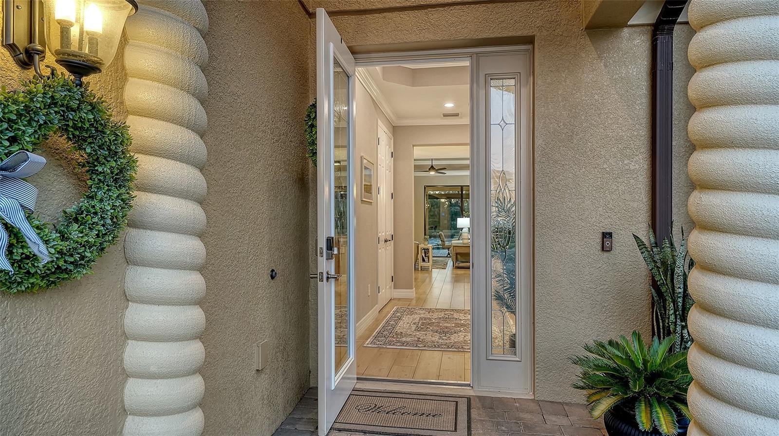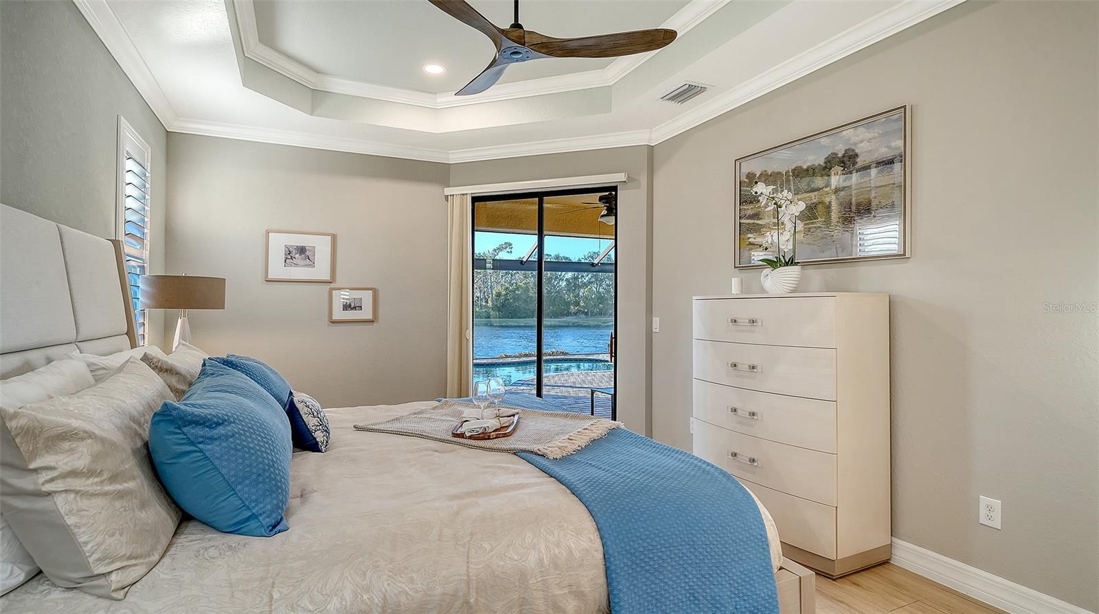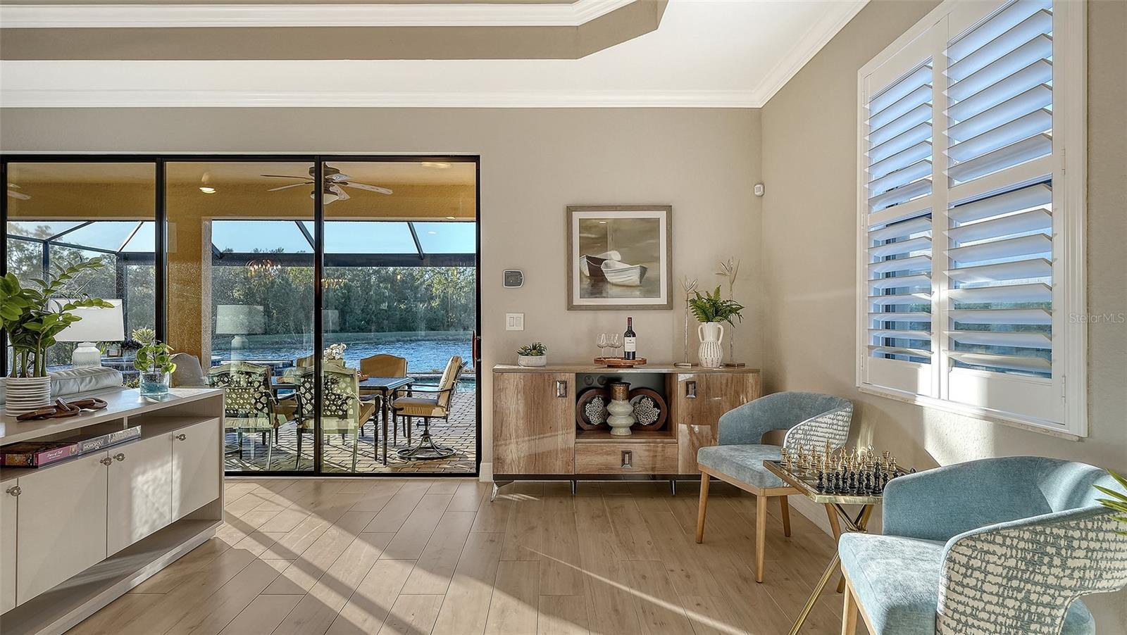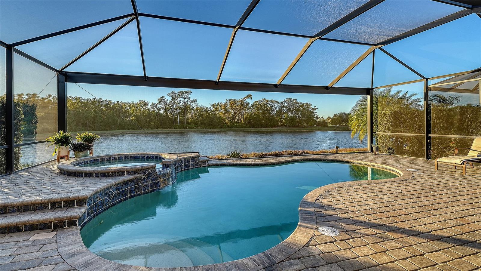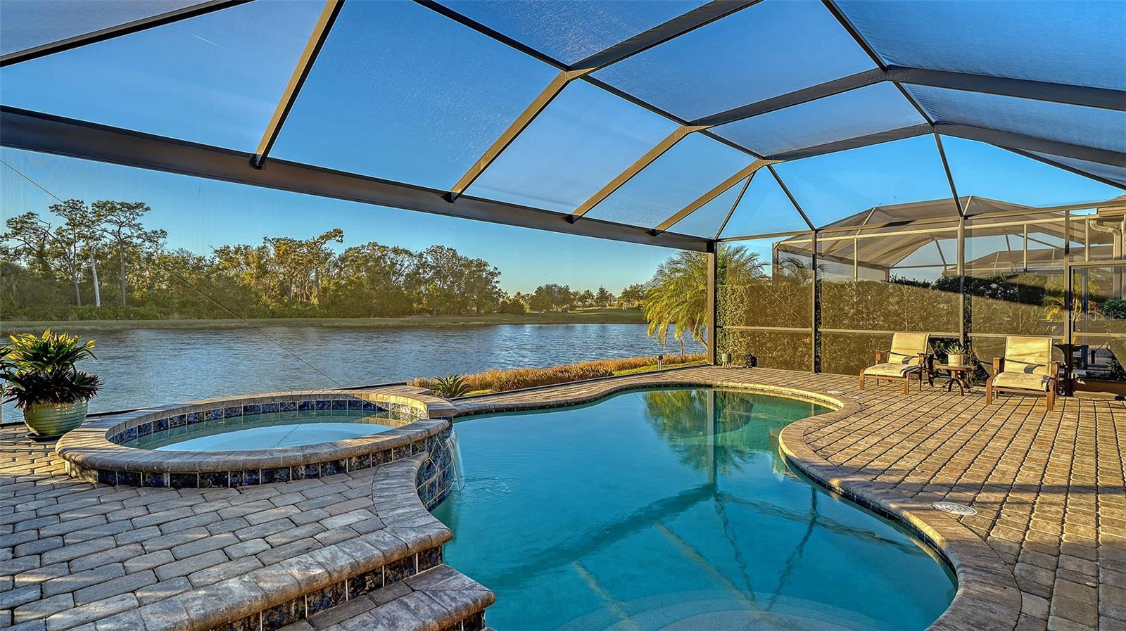 Beautiful two bedroom, two and a half bath (plus a den) single family home offers peace and tranquility with stunning views of the lake. Enjoy hassle free, Simple elegance in this beautiful, organic themed single family home located in the much sought after gated community of Lakewood National Golf Club, which boasts 2 champion golf courses and hosts the prestigious LECOM Annual PGA Suncoast Classic among other events. This beautiful home offers a stunning open floor plan, with unrivaled water views upon entering courtesy of your tropical pool/spa’s invisible picture screen. The spacious master suite is cleverly located at the back of the home to maximize the beautiful picturesque water views directly from bed and features double walk-in closets and ensuite bathroom, with welcoming soaking tub, double sinks and walk/in shower .The pool/spa area features an outdoor grill, TV and the latest technically advanced quiet heating system, as well as an outdoor half-bath. Elegant new custom lighting, central air system and other upgrades are featured throughout. Be our guest and enjoy the simple pleasures of Florida resort style living without the stress and worry in your own private oasis. Furniture can be removed as this home is offered unfurnished as well. ALL Clubhouse amenities transferable, Comes with an electronic vehicle gate pass. Golf cart can be rented for an additional fee, & Pool maintenance, lawn care and Organic pest control included.