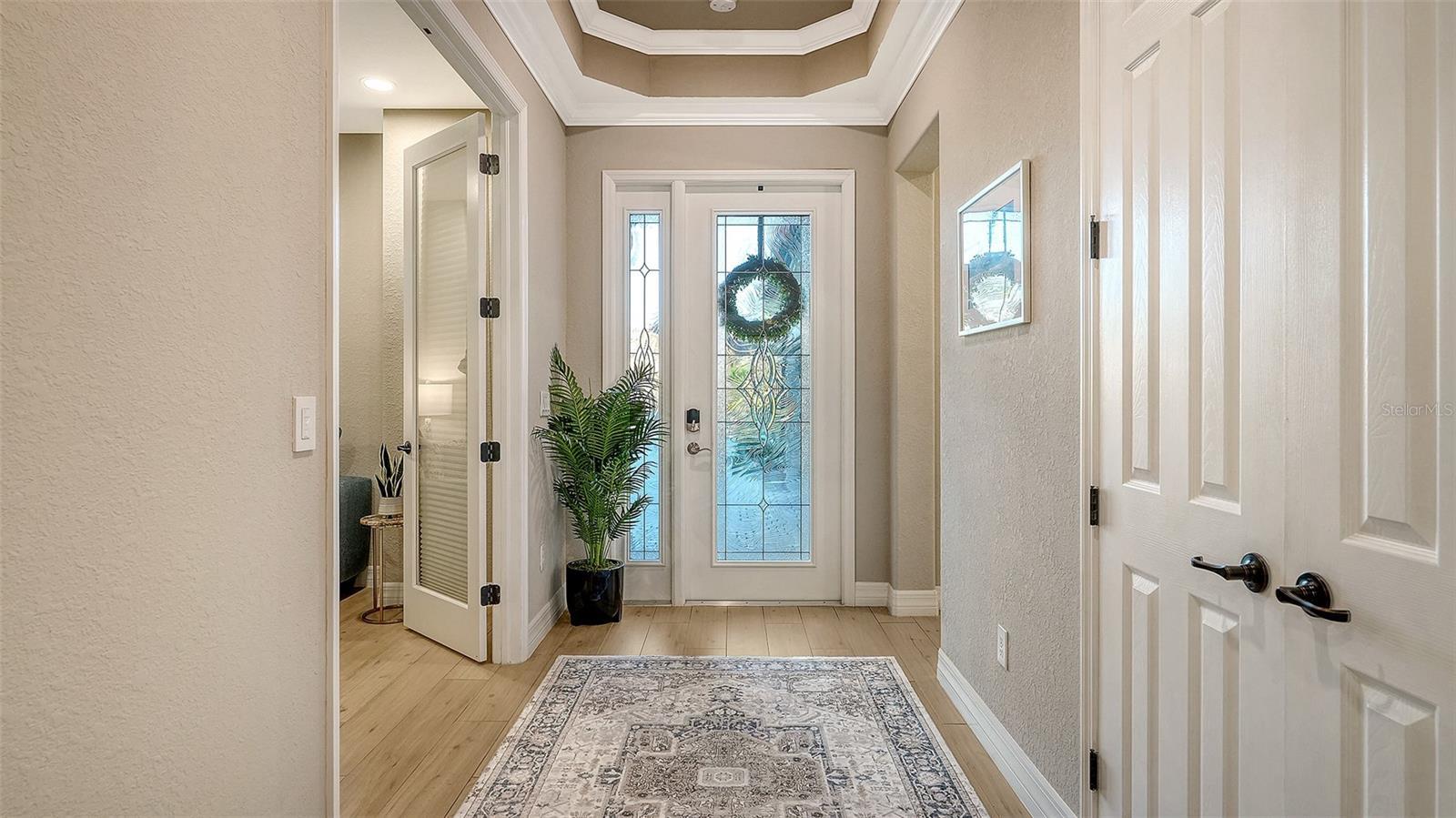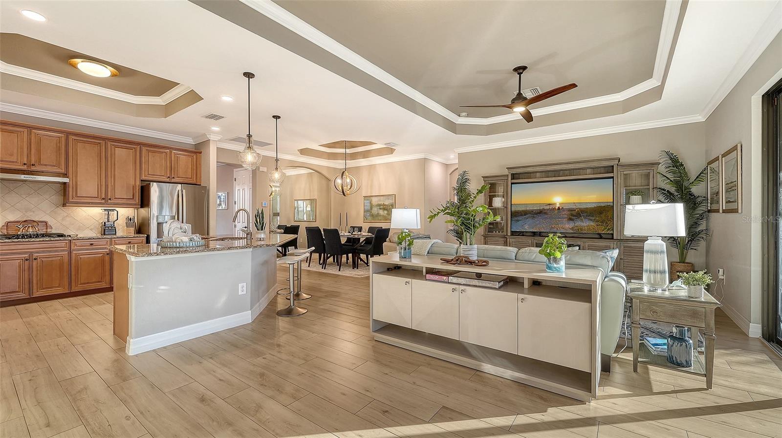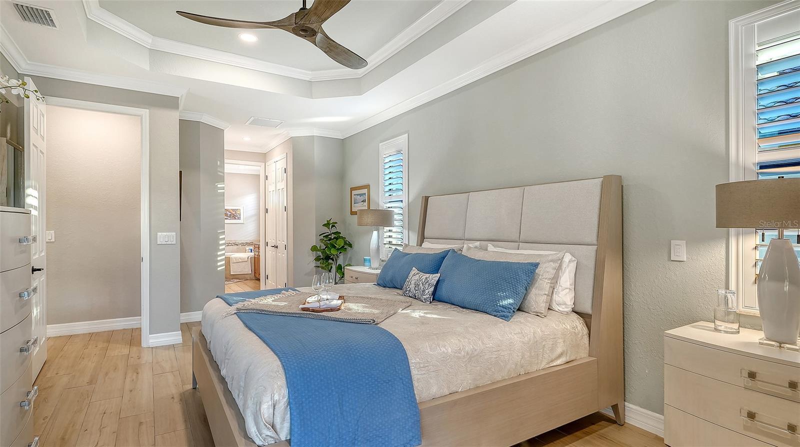 - Ceiling Fans(s), Crown Molding, Eat-in Kitchen, Living Room/Dining Room Combo, Open Floorplan, Pest Guard System, Primary Bedroom Main Floor, Split Bedroom, Stone Counters, Thermostat, Tray Ceiling(s), Window Treatments