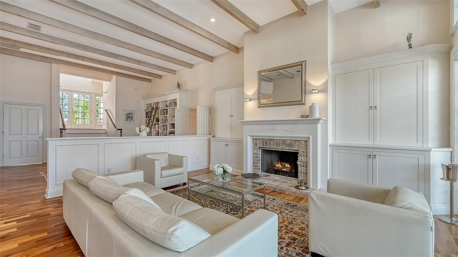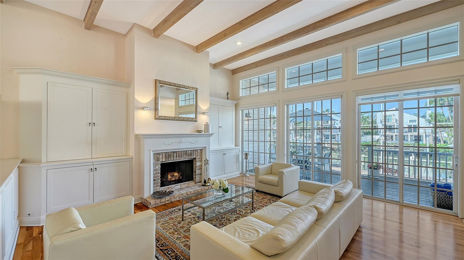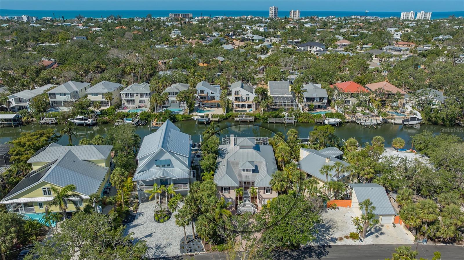 Nestled in the quaint neighborhood along the Grand Canal on Siesta Key, this Key West style home offers the perfect blend of old-world charm and modern living. This exceptionally well-appointed custom-built home is being offered turnkey. The home's grand entrance welcomes you through a covered porch that leads to an oversized foyer. You are greeted with a spectacular open floor plan, where an abundance of natural light, beautiful canal views, soaring ceilings and gleaming hardwood floors create a bright and airy atmosphere throughout. You will then be charmed by the library with a sliding ladder, wood burning fireplace, walnut wood flooring, and cedar beams in the living room, all combined with modern style furniture. The open living area includes a kitchen, with cherry wood cabinets, and an Iron Elmira stove surrounded by Chicago brick, gorgeous dining room and a breakfast nook. Floor to ceiling windows and sliding doors seamlessly connect the grand living area to the outside covered deck, perfect for entertaining. The beautiful primary suite with canal views is on the main level and two generously sized bedrooms with their en-suite bathrooms are located on the upper level. A “basement room” between the two garages offers a huge amount of storage with built-in closets and cabinets. The house was not affected by any wind or flood damage thanks to its solid concrete block construction and 11ft elevation of living space. Some water intrusion on garage level, but did not cause any damage to building, or cabinets in storage area between the garages. The fenced-in backyard features a 35ft screened heated pool with a waterfall and Chicago brick deck. The 60ft IPE hardwood boat dock with a tropical over-the-water gazebo is equipped with a 10,000lb boat lift and offers plenty of space for all your outdoor toys. Boating just one mile through the deep-water canal brings you to the Intercoastal Waterway which leads right out into the open Gulf. In a market where quality counts more than ever, this home offers a rare blend of location, craftsmanship, and timeless appeal. Welcome home to Siesta Key - island living, breath-taking sunsets, boating and award-winning beaches, all at your doorstep.