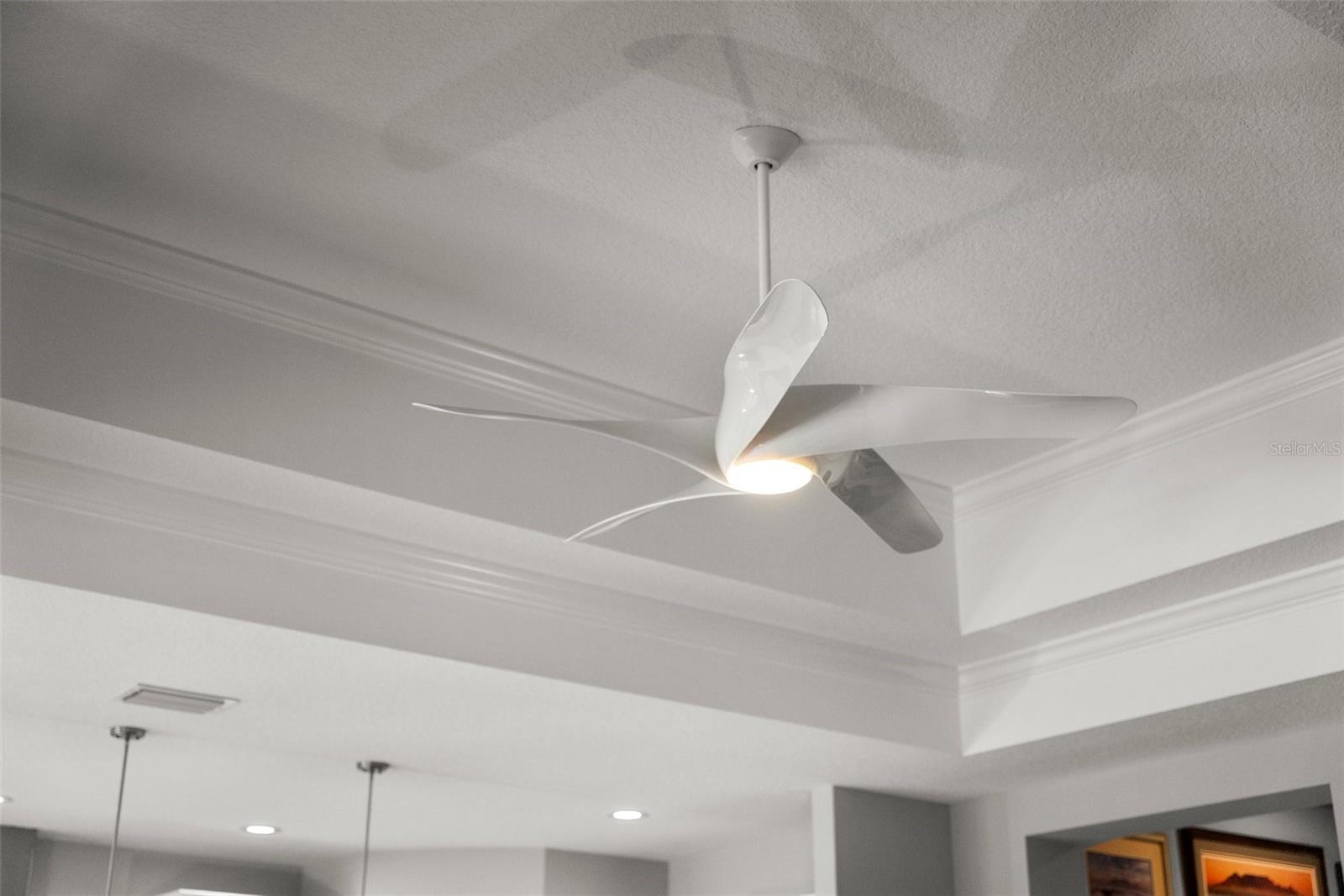 - Ceiling Fans(s), Coffered Ceiling(s), Crown Molding, Eat-in Kitchen, High Ceilings, In Wall Pest System, Kitchen/Family Room Combo, Open Floorplan, Primary Bedroom Main Floor, Solid Wood Cabinets, Stone Counters, Thermostat, Tray Ceiling(s), Walk-In Closet(s), Window Treatments