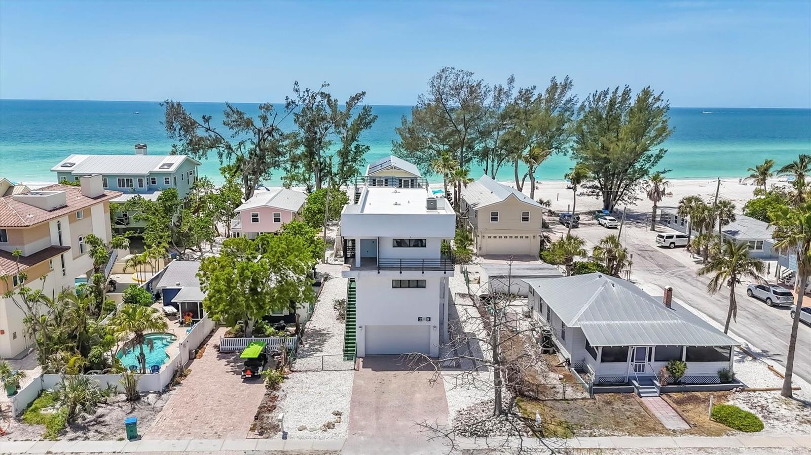 One or more photo(s) has been virtually staged. This incredible home is built like a fortress. This architect designed concrete tri-level residence was constructed with artistry and represents a masterpiece of strength framed by a concrete girdle wrapped around solid pilings. Wake up to the scent of salt in the air and the sound of waves just steps away, this is not a vacation, this is your everyday! Picture yourself walking barefoot at the beach just about 500 feet from your home, everyday! The European 2 person elevator glides you through 2262 square feet encompassing 3 bedrooms, 2 bathrooms, an open kitchen, dining room and multiple living areas to the rooftop retreat where Gulf views await stretching endlessly Westward. The details of this home are custom for this one of a kind beach residence. Features include richly hued cherry wood floors, a 2025 primary bathroom shower conversion, electric roll-down hurricane shutters for peace of mind, a 2024 newer roof, a 2025 hurricane rated garage door and poured in place concrete exterior stairs located on the North and South.. Utilities are located underground. Enjoy Caribbean quality sunsets night after night over the gulf for jaw dropping vistas. Step onto one of the breezy balconies with your morning coffee for an incredible way to begin your day! At day's end, climb on up again to your private rooftop perch, kick back and inhale the sea air. Whether you're lounging in the living areas, gathering with friends in the family room, taking in panoramic views of the Gulf or taking the elevator down for a barefoot walk on the shoreline to collect shells and watch the sunset you'll be living your life like a vacation - every day! Be sure to check out the 3D Virtual Tour. One or more photo(s) has been virtually staged.
