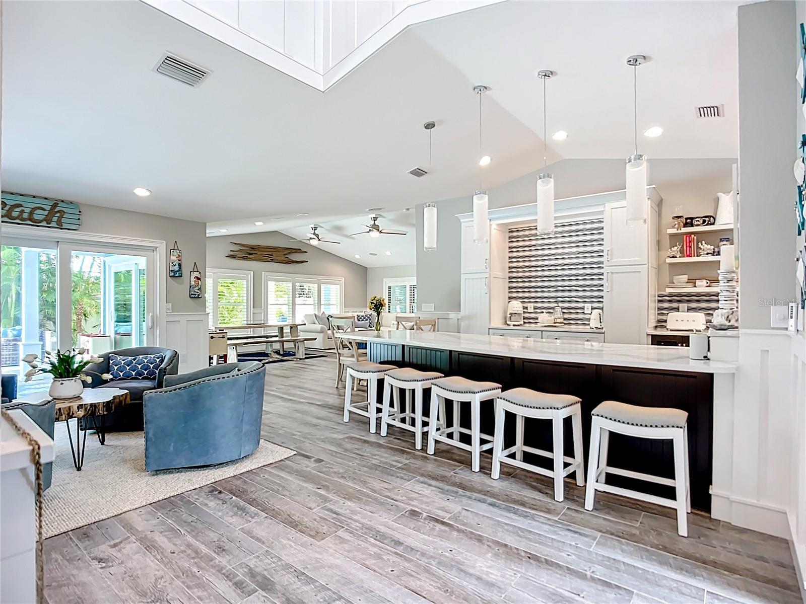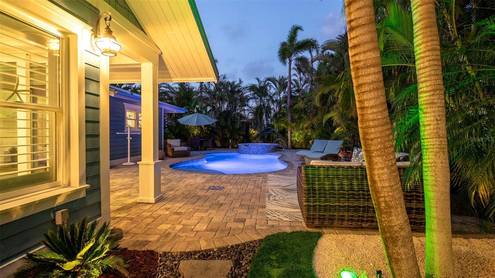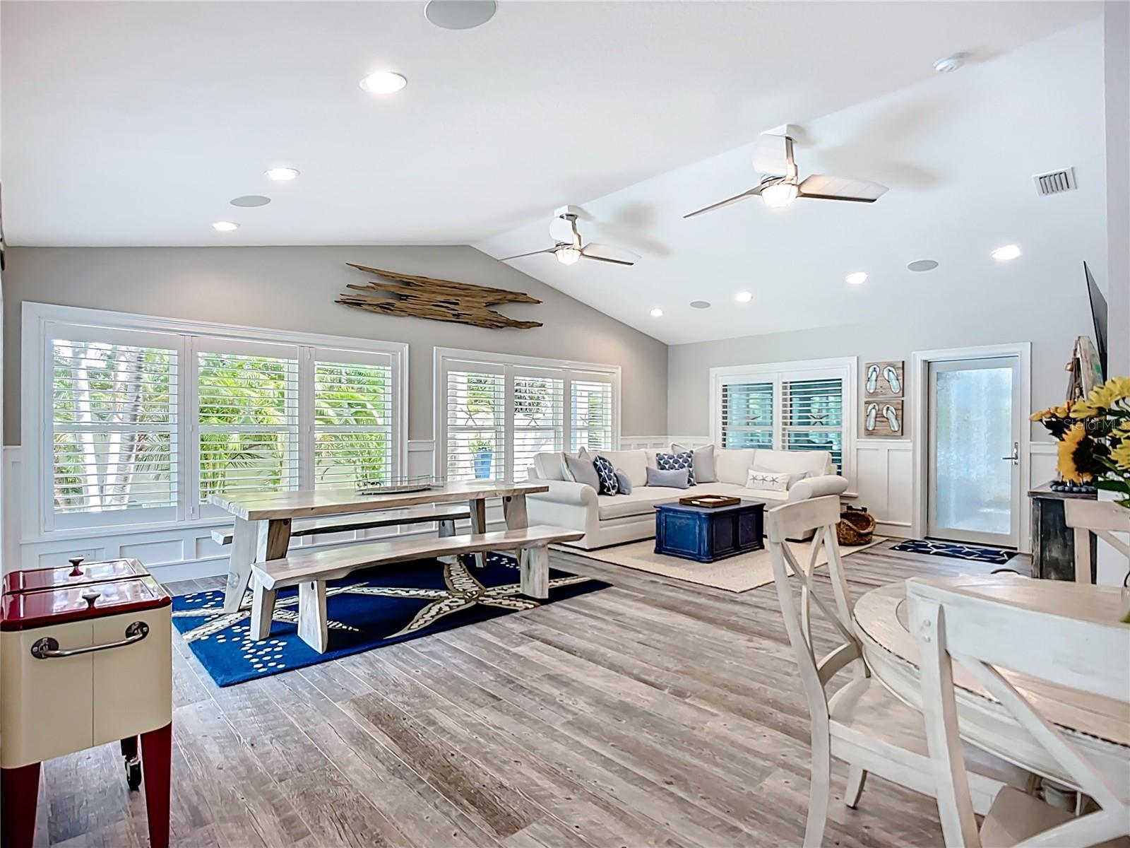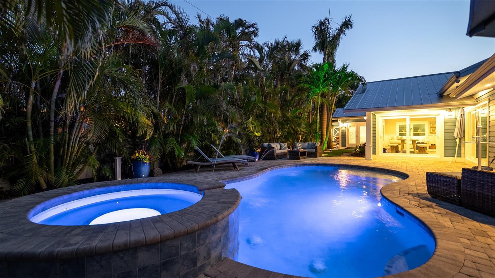 Charming Coastal Cottage in Holmes Beach. Welcome to this newly and meticulously remodeled coastal retreat, ideally located in the heart of Holmes Beach. This one-of-a-kind, artsy beach cottage blends timeless charm with modern elegance and smart technology. Step through the inviting rain glass double doors into a spacious open-concept living, dining, and kitchen area, where a dramatic lighted cupola and vaulted ceilings create a stunning first impression. A custom shell stone fireplace with a wood mantle adds warmth to the cozy seating area—perfect for relaxing or entertaining. The chef’s kitchen is a true showstopper, featuring an oversized, lighted quartz island with seating, beadboard cabinetry, and a custom wave-patterned glass backsplash. High-end appliances include an ILVE Majestic 4-burner gas stove with griddle, GE Café refrigerator, wine fridge, and porcelain farm sink—all designed with entertaining in mind.Craftsmanship continues throughout with custom millwork, shiplap accents, paneled walls, and solid-core doors. Oversized sliding glass doors open to reveal a tropical backyard oasis, complete with a free-form heated pool and spa, paver patio with artificial turf. The lush, mature landscaping with up lighting show off the tall palm trees, perfect for a evening cocktail party under the stars. The southern-facing yard is perfect for dining, lounging, and soaking up the sun. Each of the three bedrooms and 2.5 baths showcases custom chrome period fixtures, retro-inspired sinks, and designer details. Tech-savvy buyers will love the smart home features, including Lutron lighting controls, LED lighting, Sonos sound system, security cameras, and plantation shutters. The property includes a 250-gallon buried propane tank serving the on-demand water heater, gas grill, pool heater, and stove. It’s also generator-ready with existing plumbing and wiring in place. There is city dockage close by for boating enthusiast's This extraordinary home offers a rare blend of beachy charm and luxurious amenities—an absolute must-see!