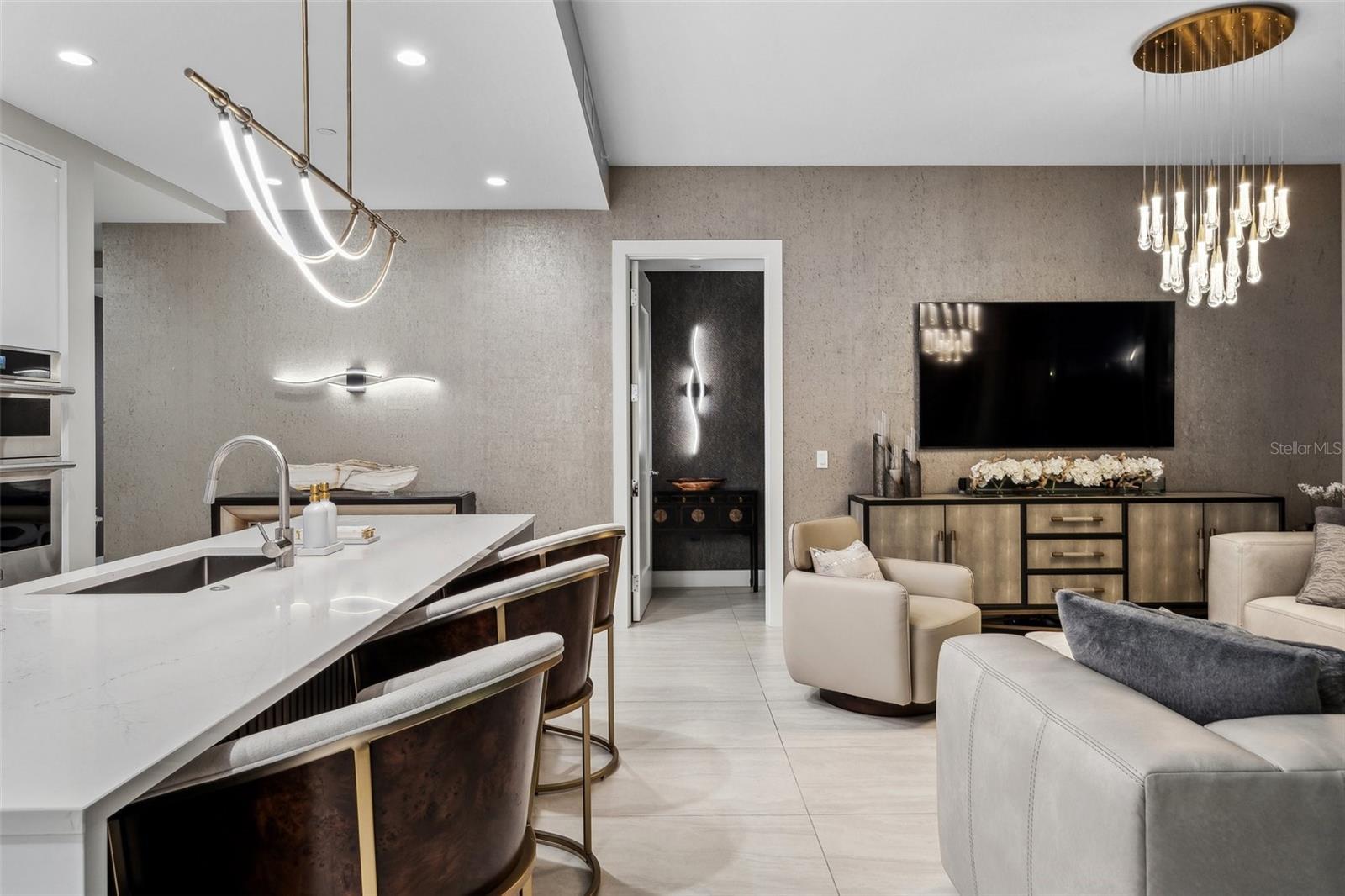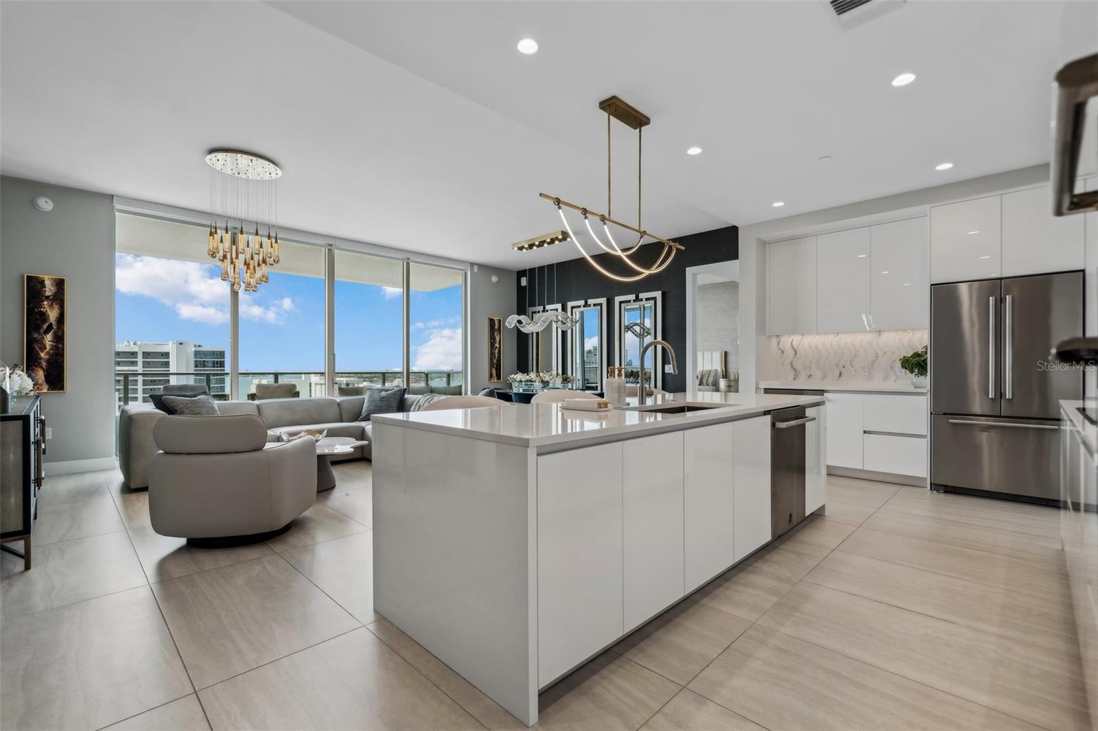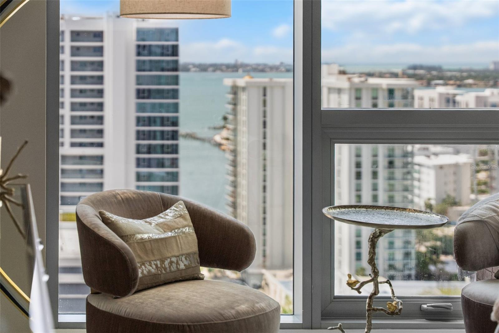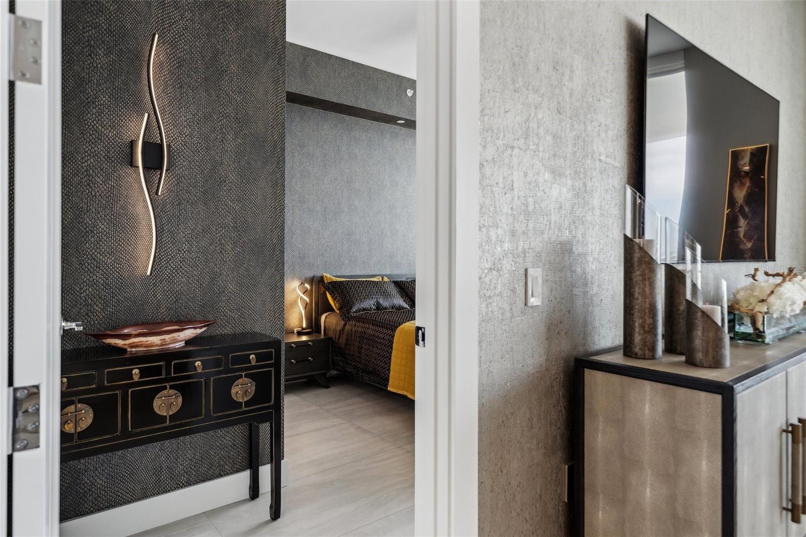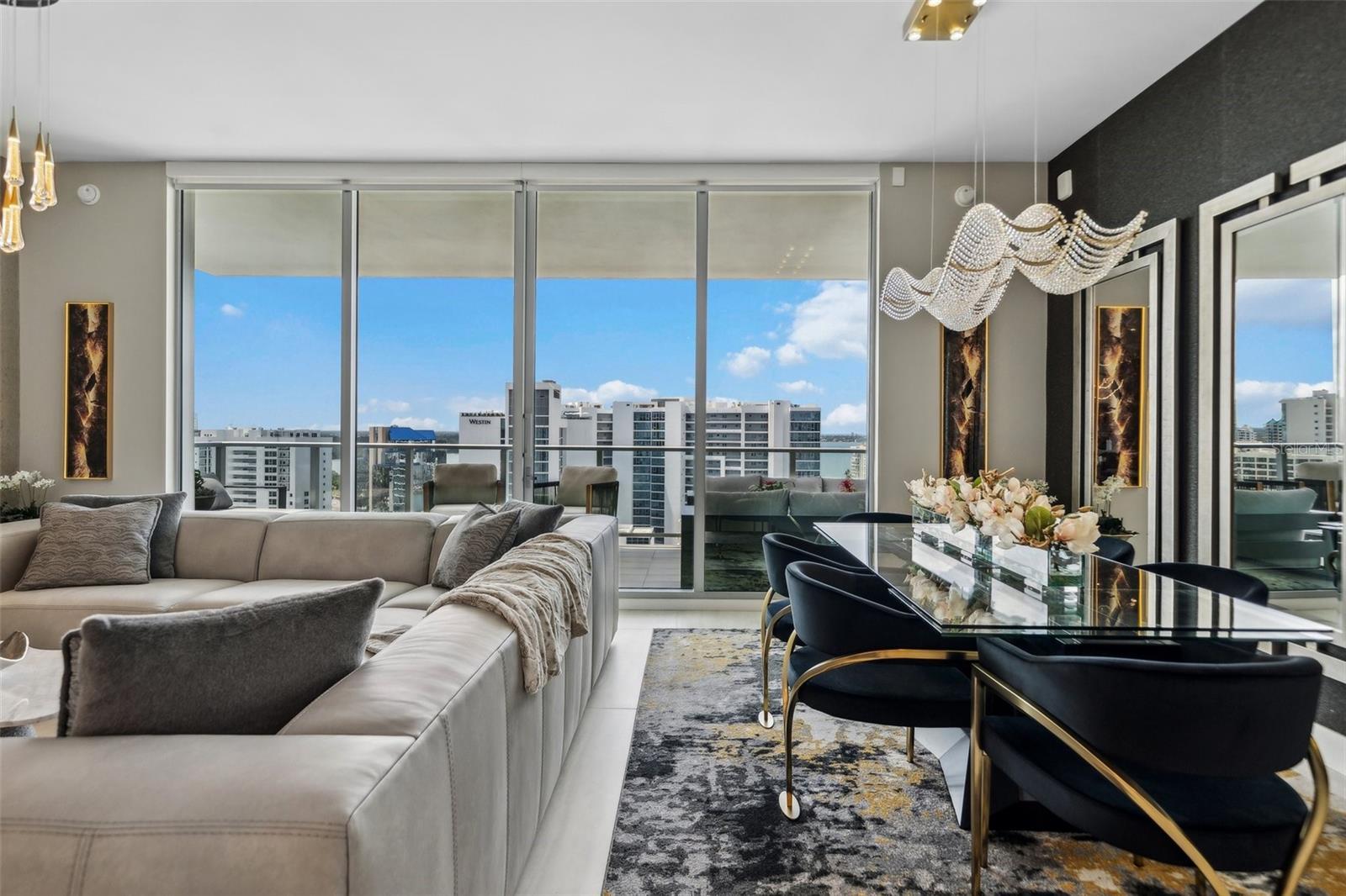 PRICE REDUCTION! OVER $250K IN DESIGNER UPGRADES! STUNNING DESIGNER CONDO WITH PANORAMIC WATER VIEWS | 17TH FLOOR | DOWNTOWN SARASOTA: Experience elevated coastal luxury in this professionally designed condo located on the 17th floor in the heart of Downtown Sarasota, just steps from the vibrant Quay Harbor. With sweeping, partial views of Sarasota Bay and the Gulf of Mexico, this residence was transformed in just 18 weeks from a blank canvas into a breathtaking, design-forward home. | From the moment you enter, you're greeted by a striking onyx and gold Italian porcelain tile foyer with raised gold detailing — a stunning introduction to the level of craftsmanship and detail found throughout. Each wall has received two coats of premium paint and is adorned with distinctive, HIGH-QUALITY EUROPEAN WALL COVERINGS that lend texture and a timeless elegance. Every room is thoughtfully curated with a neutral color palette that enhances the light, complements the views, and creates a cohesive sense of calm and sophistication. | The chef’s kitchen is both sleek and refined, boasting European cabinetry, quartz countertops, a Jenn-Air appliance suite, and a hand-cut CARRARA MARBLE AND MOTHER-OF-PEARL backsplash imported from Italy. Oak wood batten board detailing on the kitchen island flows seamlessly into the adjacent den, reinforcing the design’s intentional flow. | Every element has been thoughtfully selected, from the imported European light fixtures, chandeliers, and tile to the luxurious décor. The dining area is crowned by a showstopping chandelier adorned with 700 INDIVIDUALLY HANDSET SWAROVSKI CRYSTALS, casting a soft, radiant light that reflects off three 6-foot custom mirrors and enhances the 10-foot ceilings. | Electric shades in the Great Room, primary suite, and second bedroom provide convenience and privacy at the touch of a button. The Great Room is designed for comfort and entertainment, it currently features a reclining leather sectional and a smart media setup with a sound bar, subwoofer, Sonos speakers, and Alexa-enabled voice-command remotes. Should the new owner decide to keep things simple, furnishings mentioned are available to purchase separately. | Both the primary and secondary bedrooms include custom-designed shelving and drawer systems, providing optimal organization and maximizing storage without sacrificing elegance. The primary bath features a luxurious soaking tub—a rare feature in floor plans at BAYSO—perfect for unwinding in total relaxation. All shower floors have been expertly grouted and sealed for lasting durability. | Custom-designed outdoor furnishings and accessories (available for purchase separately) were delivered in December 2024 and January 2025, complete this refined, move-in-ready home. | Residents of this luxury building enjoy world-class amenities, including a state-of-the-art fitness center, resort-style pool, dog park, and more. Located just 3 miles from Lido Beach and steps from Sarasota’s version of Central Park—The Bay Sarasota—this prime location is close to everything you could want. Enjoy arts and culture, fine dining, and upscale shopping all nearby. Boating enthusiasts will appreciate the convenient marina just south of BAYSO for effortless access to Sarasota Bay. | NOW ACCEPTING PRIVATE APPOINTMENTS. Discover a rare blend of artistry, comfort, and breathtaking views in one of Sarasota’s most coveted locations. Furniture package available upon request.