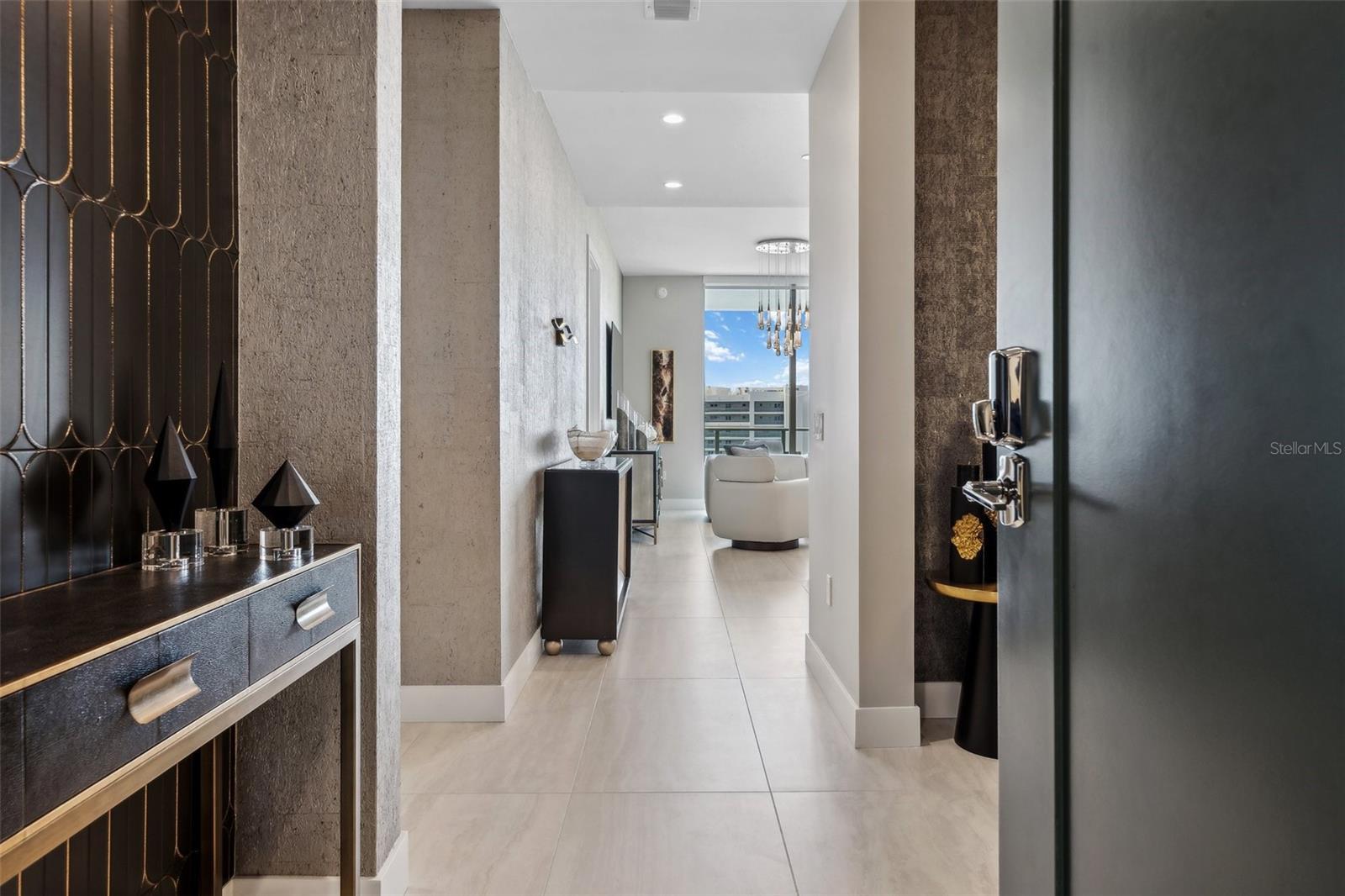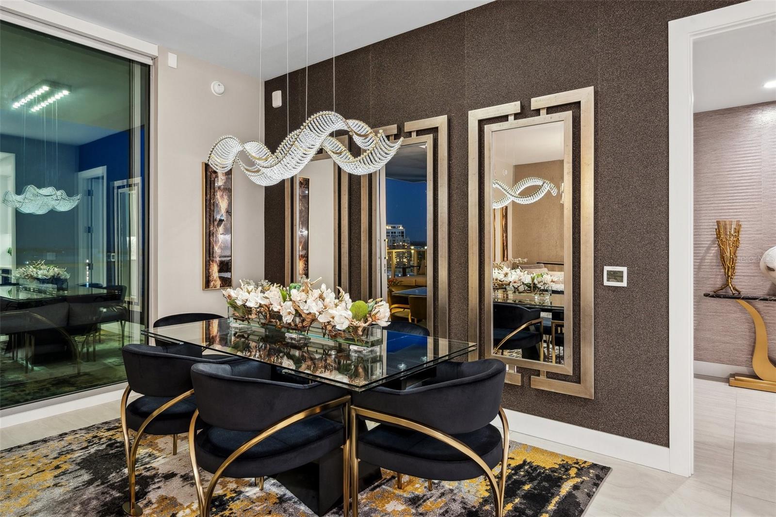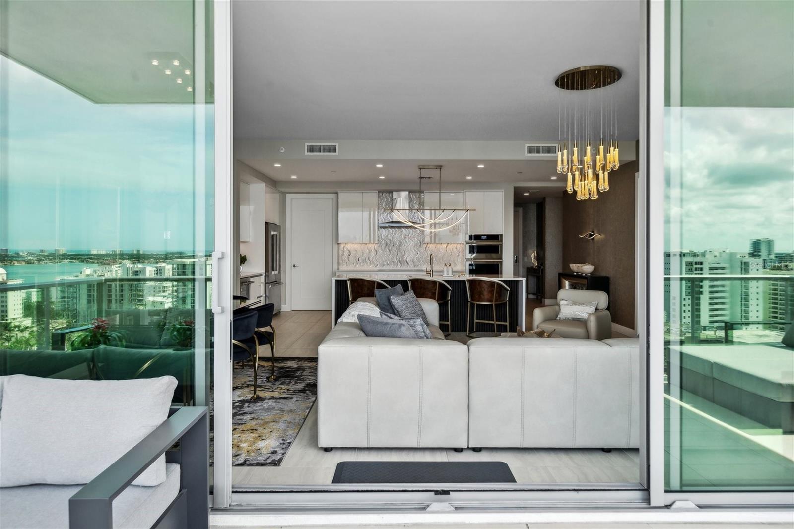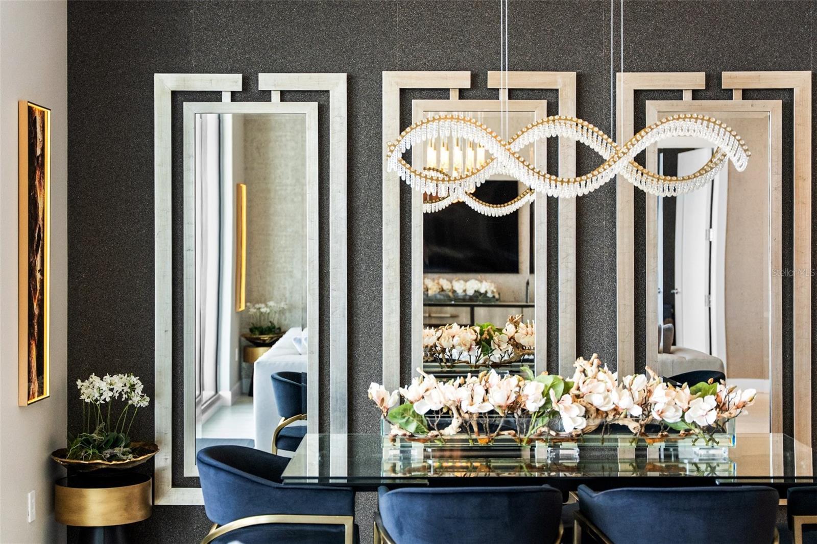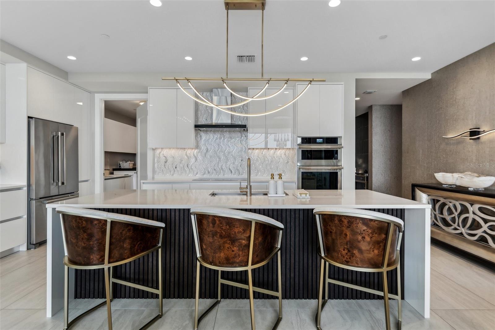 PRICE REDUCTION! OVER $250K IN DESIGNER UPGRADES! STUNNING DESIGNER CONDO WITH PANORAMIC WATER VIEWS | 17TH FLOOR | DOWNTOWN SARASOTA: Experience elevated coastal luxury in this professionally designed condo located on the 17th floor in the heart of Downtown Sarasota, just steps from the vibrant Quay Harbor. With sweeping, partial views of Sarasota Bay and the Gulf of Mexico, this residence was transformed in just 18 weeks from a blank canvas into a breathtaking, design-forward home. | From the moment you enter, you're greeted by a striking onyx and gold Italian porcelain tile foyer with raised gold detailing — a stunning introduction to the level of craftsmanship and detail found throughout. Each wall has received two coats of premium paint and is adorned with distinctive, HIGH-QUALITY EUROPEAN WALL COVERINGS that lend texture and a timeless elegance. Every room is thoughtfully curated with a neutral color palette that enhances the light, complements the views, and creates a cohesive sense of calm and sophistication. | The chef’s kitchen is both sleek and refined, boasting European cabinetry, quartz countertops, a Jenn-Air appliance suite, and a hand-cut CARRARA MARBLE AND MOTHER-OF-PEARL backsplash imported from Italy. Oak wood batten board detailing on the kitchen island flows seamlessly into the adjacent den, reinforcing the design’s intentional flow. | Every element has been thoughtfully selected, from the imported European light fixtures, chandeliers, and tile to the luxurious décor. The dining area is crowned by a showstopping chandelier adorned with 700 INDIVIDUALLY HANDSET SWAROVSKI CRYSTALS, casting a soft, radiant light that reflects off three 6-foot custom mirrors and enhances the 10-foot ceilings. | Electric shades in the Great Room, primary suite, and second bedroom provide convenience and privacy at the touch of a button. The Great Room is designed for comfort and entertainment, it currently features a reclining leather sectional and a smart media setup with a sound bar, subwoofer, Sonos speakers, and Alexa-enabled voice-command remotes. Should the new owner decide to keep things simple, furnishings mentioned are available to purchase separately. | Both the primary and secondary bedrooms include custom-designed shelving and drawer systems, providing optimal organization and maximizing storage without sacrificing elegance. The primary bath features a luxurious soaking tub—a rare feature in floor plans at BAYSO—perfect for unwinding in total relaxation. All shower floors have been expertly grouted and sealed for lasting durability. | Custom-designed outdoor furnishings and accessories (available for purchase separately) were delivered in December 2024 and January 2025, complete this refined, move-in-ready home. | Residents of this luxury building enjoy world-class amenities, including a state-of-the-art fitness center, resort-style pool, dog park, and more. Located just 3 miles from Lido Beach and steps from Sarasota’s version of Central Park—The Bay Sarasota—this prime location is close to everything you could want. Enjoy arts and culture, fine dining, and upscale shopping all nearby. Boating enthusiasts will appreciate the convenient marina just south of BAYSO for effortless access to Sarasota Bay. | NOW ACCEPTING PRIVATE APPOINTMENTS. Discover a rare blend of artistry, comfort, and breathtaking views in one of Sarasota’s most coveted locations. Furniture package available upon request.