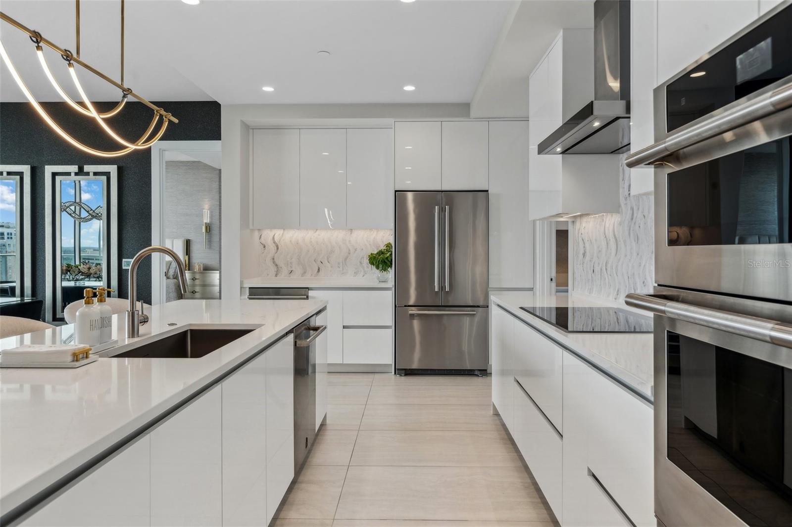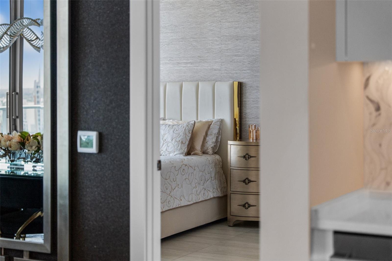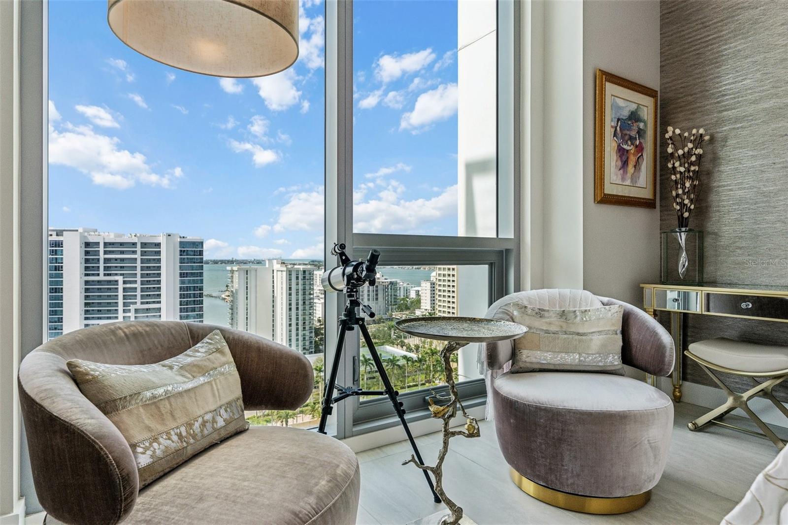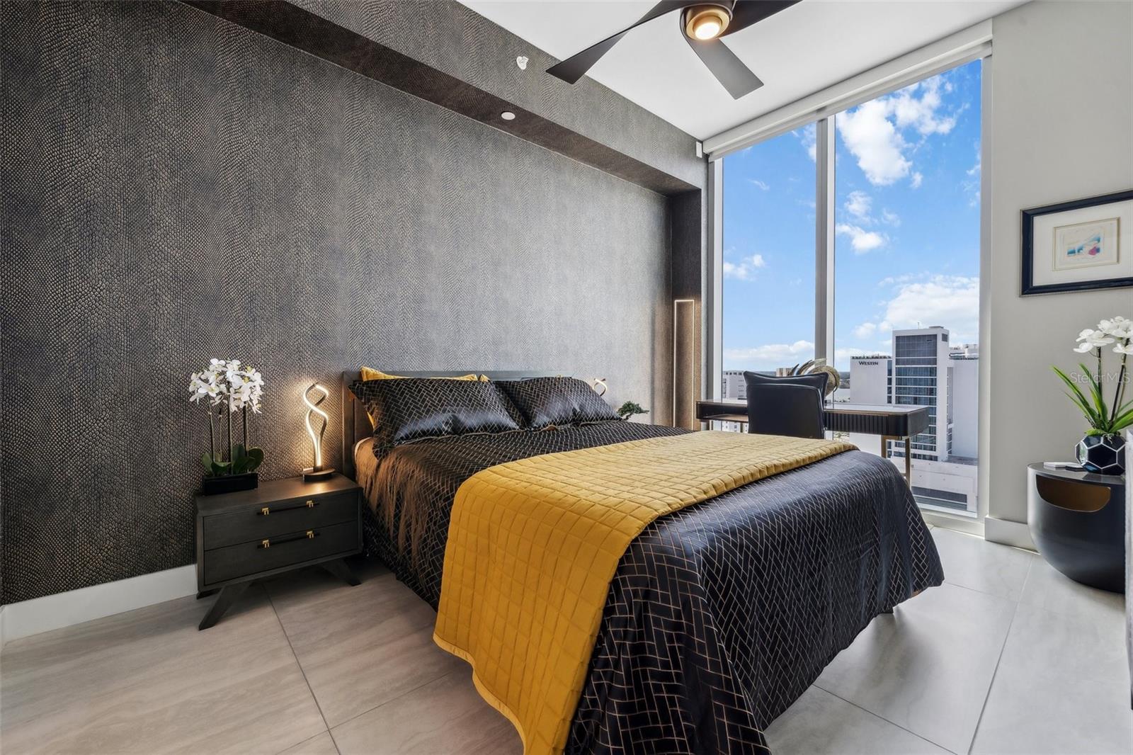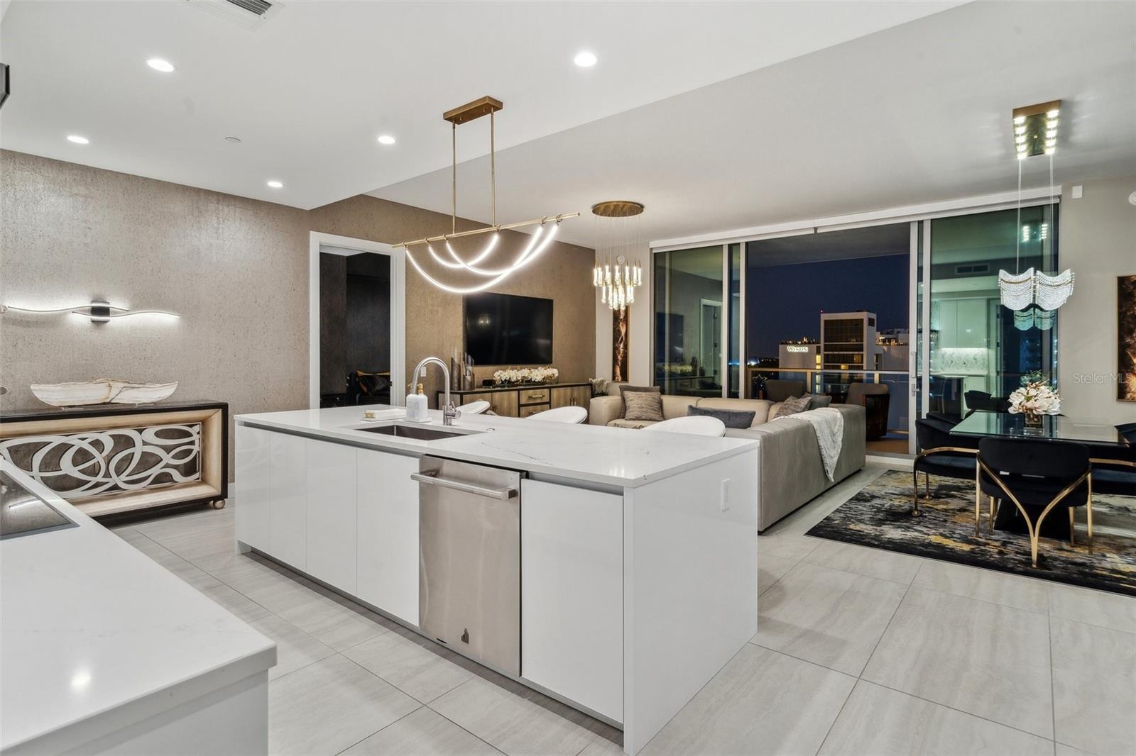 PRICE REDUCTION! OVER $250K IN DESIGNER UPGRADES! STUNNING DESIGNER CONDO WITH PANORAMIC WATER VIEWS | 17TH FLOOR | DOWNTOWN SARASOTA: Experience elevated coastal luxury in this professionally designed condo located on the 17th floor in the heart of Downtown Sarasota, just steps from the vibrant Quay Harbor. With sweeping, partial views of Sarasota Bay and the Gulf of Mexico, this residence was transformed in just 18 weeks from a blank canvas into a breathtaking, design-forward home. | From the moment you enter, you're greeted by a striking onyx and gold Italian porcelain tile foyer with raised gold detailing — a stunning introduction to the level of craftsmanship and detail found throughout. Each wall has received two coats of premium paint and is adorned with distinctive, HIGH-QUALITY EUROPEAN WALL COVERINGS that lend texture and a timeless elegance. Every room is thoughtfully curated with a neutral color palette that enhances the light, complements the views, and creates a cohesive sense of calm and sophistication. | The chef’s kitchen is both sleek and refined, boasting European cabinetry, quartz countertops, a Jenn-Air appliance suite, and a hand-cut CARRARA MARBLE AND MOTHER-OF-PEARL backsplash imported from Italy. Oak wood batten board detailing on the kitchen island flows seamlessly into the adjacent den, reinforcing the design’s intentional flow. | Every element has been thoughtfully selected, from the imported European light fixtures, chandeliers, and tile to the luxurious décor. The dining area is crowned by a showstopping chandelier adorned with 700 INDIVIDUALLY HANDSET SWAROVSKI CRYSTALS, casting a soft, radiant light that reflects off three 6-foot custom mirrors and enhances the 10-foot ceilings. | Electric shades in the Great Room, primary suite, and second bedroom provide convenience and privacy at the touch of a button. The Great Room is designed for comfort and entertainment, it currently features a reclining leather sectional and a smart media setup with a sound bar, subwoofer, Sonos speakers, and Alexa-enabled voice-command remotes. Should the new owner decide to keep things simple, furnishings mentioned are available to purchase separately. | Both the primary and secondary bedrooms include custom-designed shelving and drawer systems, providing optimal organization and maximizing storage without sacrificing elegance. The primary bath features a luxurious soaking tub—a rare feature in floor plans at BAYSO—perfect for unwinding in total relaxation. All shower floors have been expertly grouted and sealed for lasting durability. | Custom-designed outdoor furnishings and accessories (available for purchase separately) were delivered in December 2024 and January 2025, complete this refined, move-in-ready home. | Residents of this luxury building enjoy world-class amenities, including a state-of-the-art fitness center, resort-style pool, dog park, and more. Located just 3 miles from Lido Beach and steps from Sarasota’s version of Central Park—The Bay Sarasota—this prime location is close to everything you could want. Enjoy arts and culture, fine dining, and upscale shopping all nearby. Boating enthusiasts will appreciate the convenient marina just south of BAYSO for effortless access to Sarasota Bay. | NOW ACCEPTING PRIVATE APPOINTMENTS. Discover a rare blend of artistry, comfort, and breathtaking views in one of Sarasota’s most coveted locations. Furniture package available upon request.