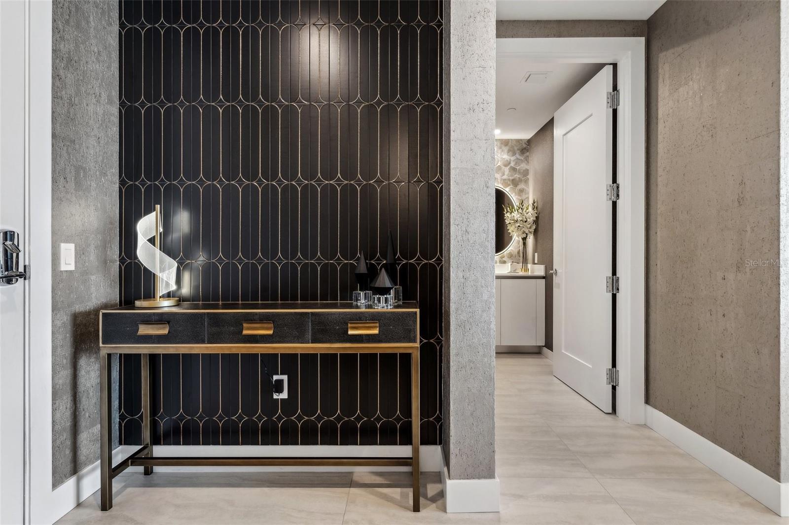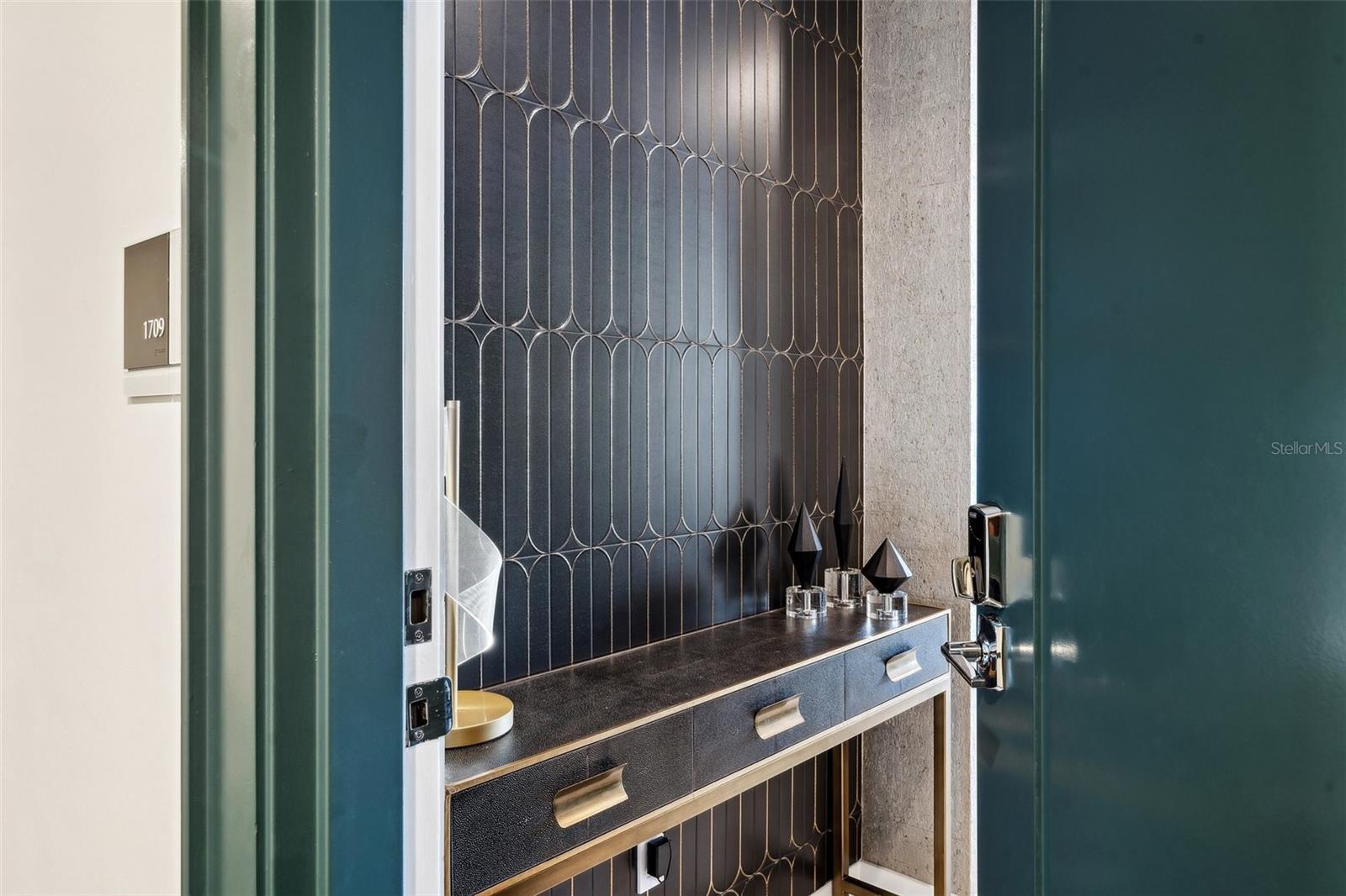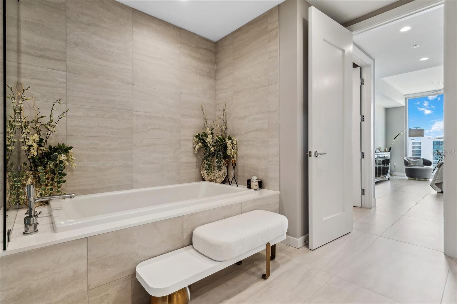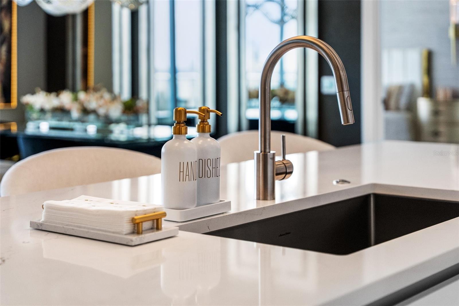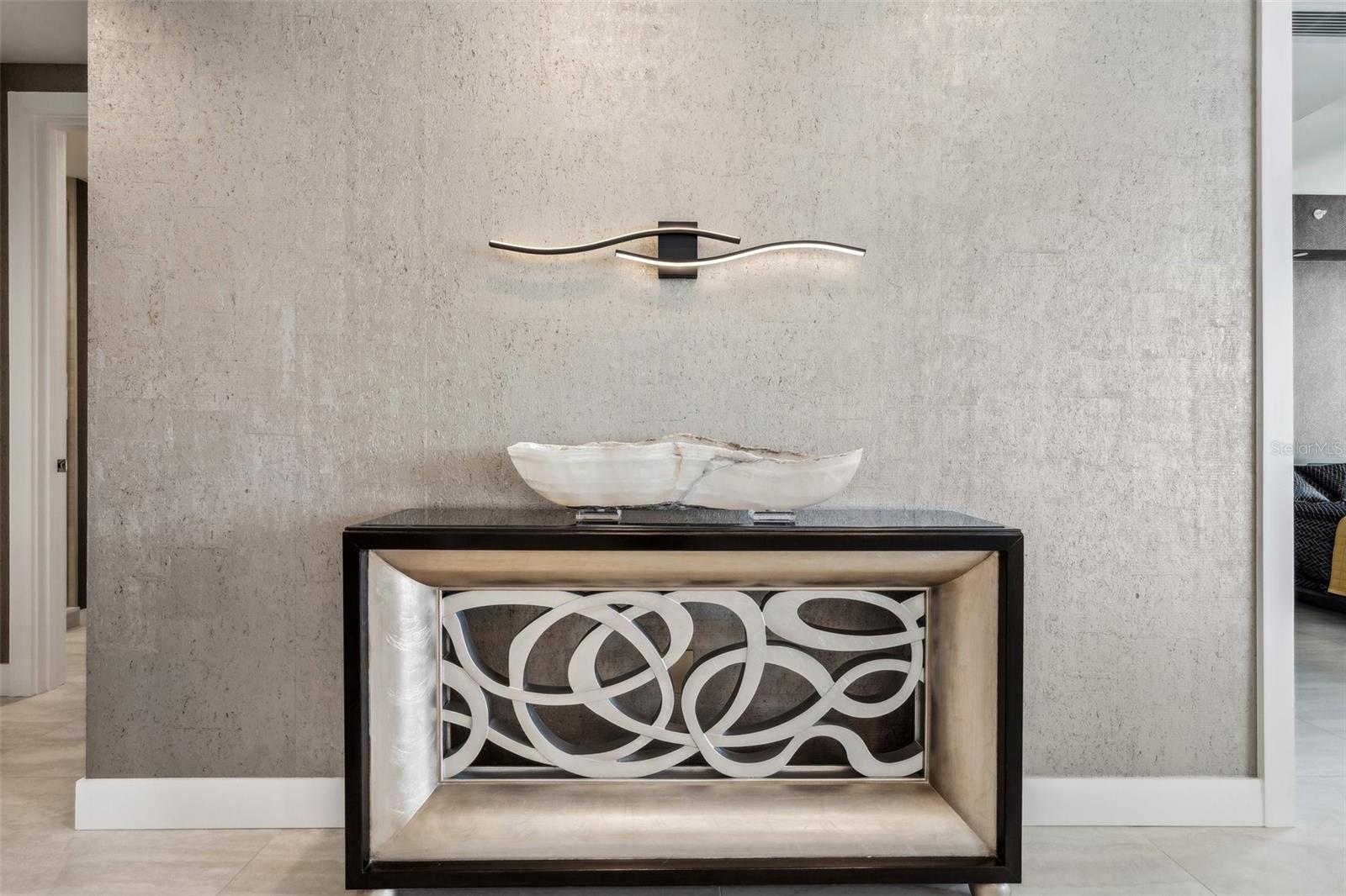 PRICE REDUCTION! OVER $250K IN DESIGNER UPGRADES! STUNNING DESIGNER CONDO WITH PANORAMIC WATER VIEWS | 17TH FLOOR | DOWNTOWN SARASOTA: Experience elevated coastal luxury in this professionally designed condo located on the 17th floor in the heart of Downtown Sarasota, just steps from the vibrant Quay Harbor. With sweeping, partial views of Sarasota Bay and the Gulf of Mexico, this residence was transformed in just 18 weeks from a blank canvas into a breathtaking, design-forward home. | From the moment you enter, you're greeted by a striking onyx and gold Italian porcelain tile foyer with raised gold detailing — a stunning introduction to the level of craftsmanship and detail found throughout. Each wall has received two coats of premium paint and is adorned with distinctive, HIGH-QUALITY EUROPEAN WALL COVERINGS that lend texture and a timeless elegance. Every room is thoughtfully curated with a neutral color palette that enhances the light, complements the views, and creates a cohesive sense of calm and sophistication. | The chef’s kitchen is both sleek and refined, boasting European cabinetry, quartz countertops, a Jenn-Air appliance suite, and a hand-cut CARRARA MARBLE AND MOTHER-OF-PEARL backsplash imported from Italy. Oak wood batten board detailing on the kitchen island flows seamlessly into the adjacent den, reinforcing the design’s intentional flow. | Every element has been thoughtfully selected, from the imported European light fixtures, chandeliers, and tile to the luxurious décor. The dining area is crowned by a showstopping chandelier adorned with 700 INDIVIDUALLY HANDSET SWAROVSKI CRYSTALS, casting a soft, radiant light that reflects off three 6-foot custom mirrors and enhances the 10-foot ceilings. | Electric shades in the Great Room, primary suite, and second bedroom provide convenience and privacy at the touch of a button. The Great Room is designed for comfort and entertainment, it currently features a reclining leather sectional and a smart media setup with a sound bar, subwoofer, Sonos speakers, and Alexa-enabled voice-command remotes. Should the new owner decide to keep things simple, furnishings mentioned are available to purchase separately. | Both the primary and secondary bedrooms include custom-designed shelving and drawer systems, providing optimal organization and maximizing storage without sacrificing elegance. The primary bath features a luxurious soaking tub—a rare feature in floor plans at BAYSO—perfect for unwinding in total relaxation. All shower floors have been expertly grouted and sealed for lasting durability. | Custom-designed outdoor furnishings and accessories (available for purchase separately) were delivered in December 2024 and January 2025, complete this refined, move-in-ready home. | Residents of this luxury building enjoy world-class amenities, including a state-of-the-art fitness center, resort-style pool, dog park, and more. Located just 3 miles from Lido Beach and steps from Sarasota’s version of Central Park—The Bay Sarasota—this prime location is close to everything you could want. Enjoy arts and culture, fine dining, and upscale shopping all nearby. Boating enthusiasts will appreciate the convenient marina just south of BAYSO for effortless access to Sarasota Bay. | NOW ACCEPTING PRIVATE APPOINTMENTS. Discover a rare blend of artistry, comfort, and breathtaking views in one of Sarasota’s most coveted locations. Furniture package available upon request.