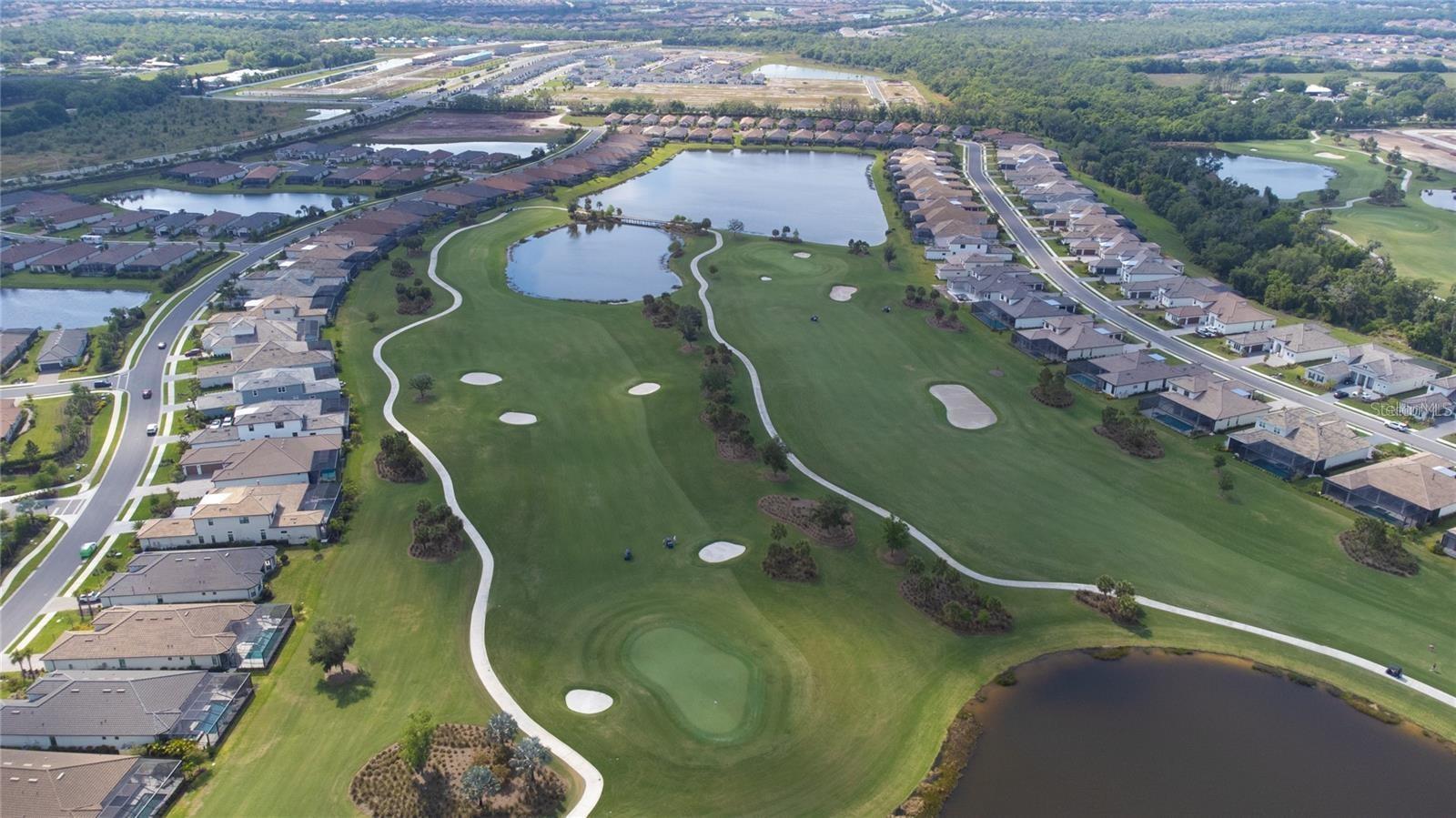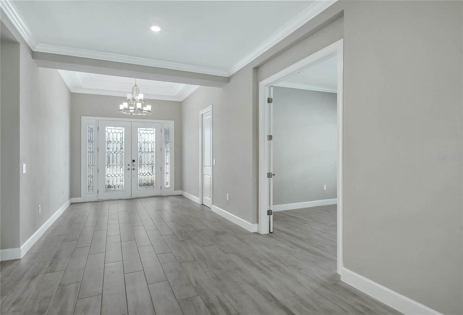 One or more photo(s) has been virtually staged. One or more photo(s) has been virtually staged. Step into unparalleled luxury of the GOLF DEEDED Palazzio floor plan offering 3-bedrooms, 3-bathrooms and den where elegance meets thoughtful functionality. Nestled in a prime location with stunning golf course views, this residence offers a serene lifestyle in a meticulously crafted space. Enter through the grand double doors and immediately be greeted by gleaming porcelain tile floors and sophisticated tray ceilings that accentuate the spacious, open floor plan. The 8-foot doors throughout enhance the airy feel, creating a seamless flow from room to room. At the heart of the home, a chef's kitchen awaits, featuring upgraded cabinetry, a GE Café appliance package, and ample counter space – perfect for both entertaining and everyday culinary adventures. Each room is bathed in natural light, thanks to hurricane-resistant windows that provide both safety and panoramic views of the lush greens beyond. The master suite is a retreat of its own, offering privacy, a luxurious en-suite bathroom, and direct access to those breathtaking golf views. Two additional bedrooms and well-appointed bathrooms ensure space and comfort for family and guests alike. With a tandem garage for added convenience and extra storage, this home is not only a sanctuary but also a masterpiece in modern luxury. Every detail has been carefully selected to offer the finest in both aesthetics and durability, promising a lifestyle of comfort, safety, and effortless elegance in Azario community with its plethora of amenities.