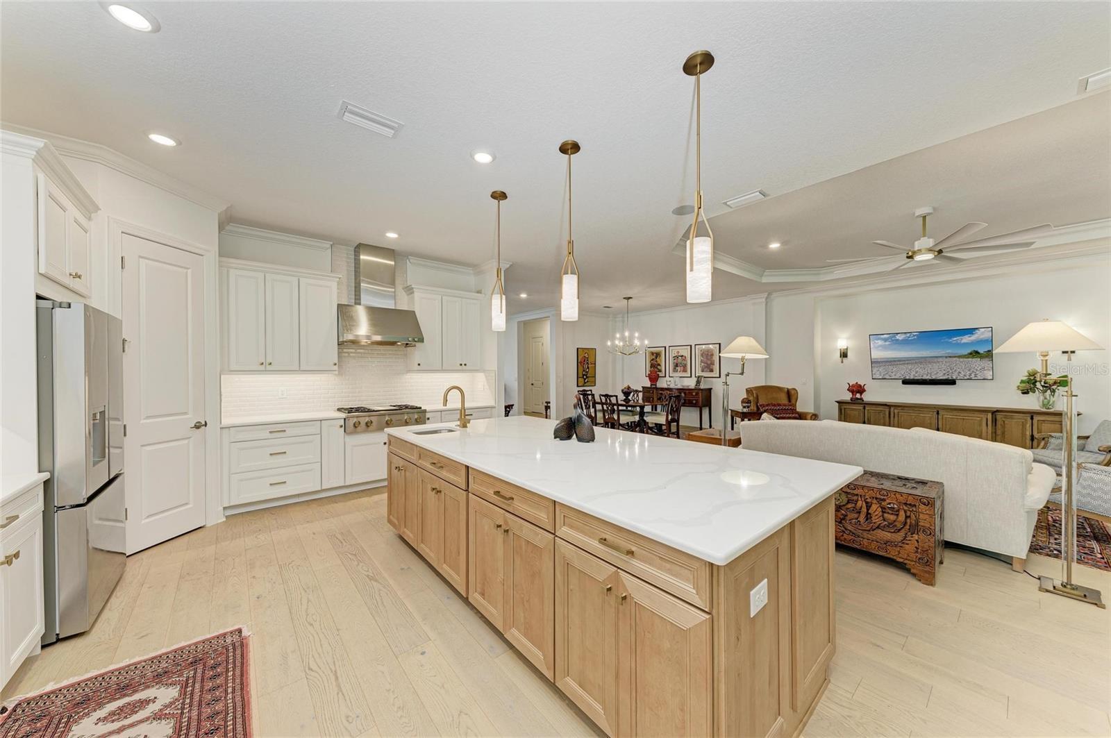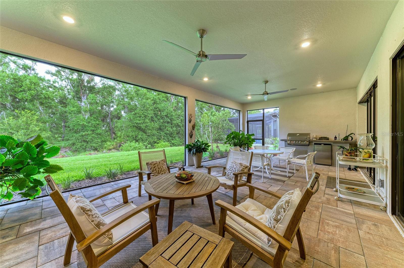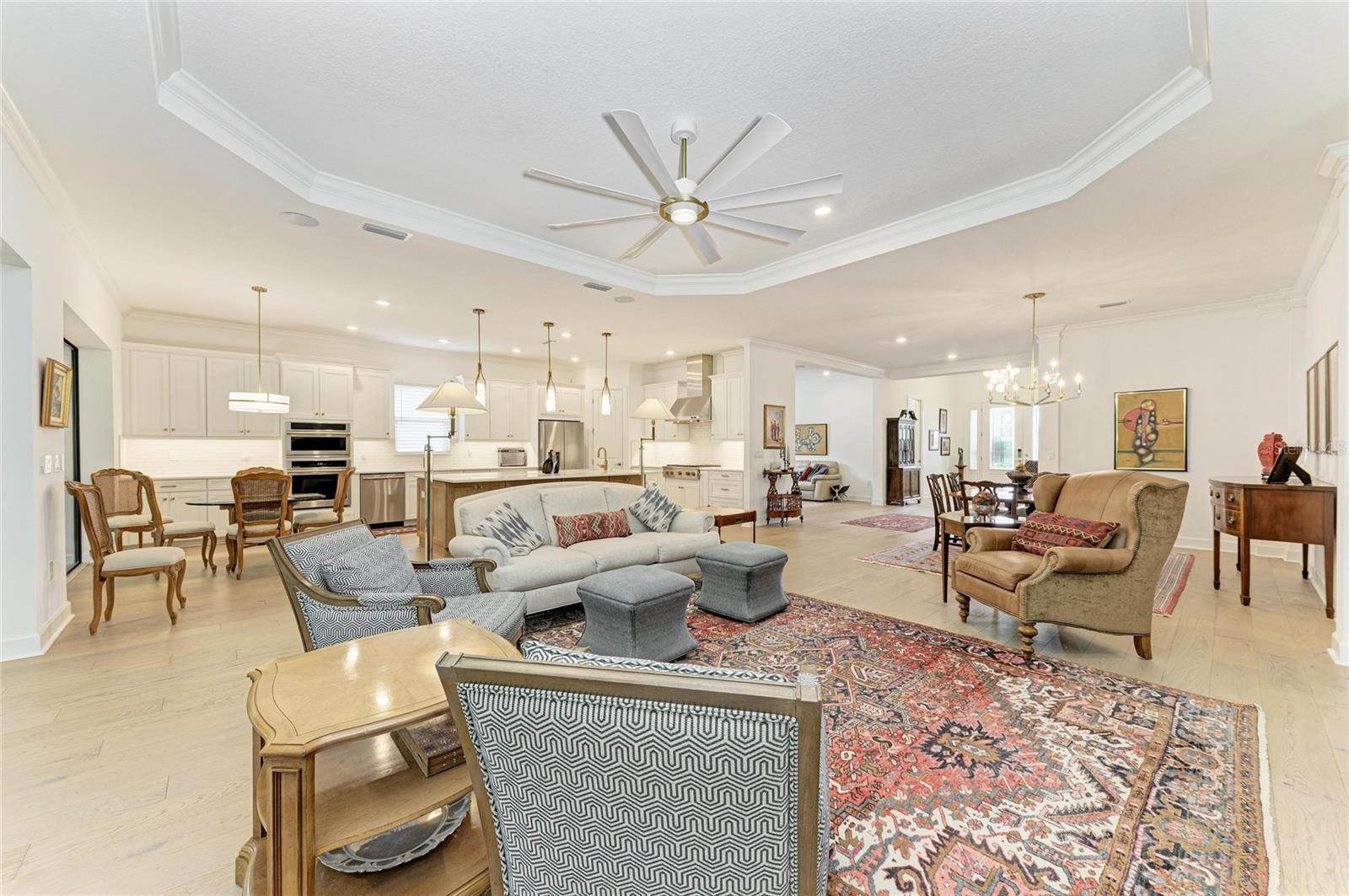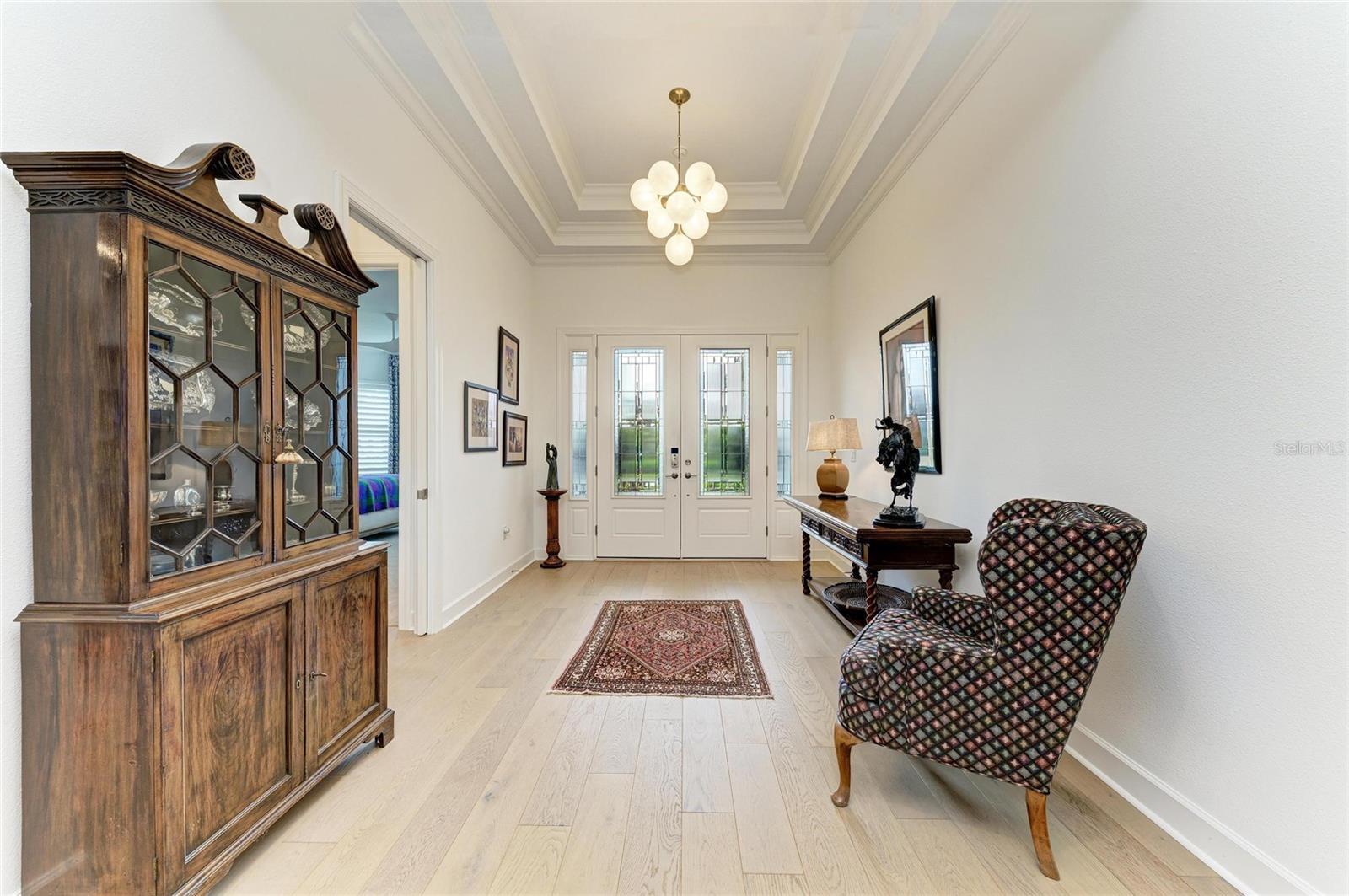 IMMEDIATE MOVE-IN. Welcome to Elevated Florida Living in Esplanade – Azario at Lakewood Ranch! Experience the perfect blend of elegance, comfort, and privacy in this meticulously crafted 2023-built home offering 3 bedrooms, 3 bathrooms, a dedicated den/office, and a rare tandem 3-car garage—all thoughtfully designed with timeless upgrades and modern conveniences. From the moment you enter, you'll be captivated by the refined ambiance created by engineered wood flooring throughout (with plush carpeting in Suites 2 and 3), soaring tray ceilings adorned with crown molding, and custom upgraded lighting that complements every space. Each of the three spacious bedrooms features its own ensuite bath, offering privacy and comfort for family and guests alike. Bay windows in two bedrooms flood the rooms with natural light and add architectural charm. The home’s expansive interior showcases 8’ solid-core doors, B&G interior shutters, and soft-close cabinetry with upgraded shelving. The gourmet kitchen is a culinary dream, boasting quartz countertops, stainless steel appliances, a smart faucet, and a large kitchen island with an additional prep sink. The natural gas range is complemented by an upgraded vent hood, while designer plumbing fixtures elevate the entire space. The casual dining extension flows effortlessly into the great room—enhanced by a high-quality speaker system that continues into the office and rear lanai, perfect for entertaining or relaxing in style. Step outside to your serene, screened-in lanai with a built-in summer kitchen, ideal for alfresco dining or hosting guests against a backdrop of Florida’s natural beauty. The home backs up to a heavily wooded preserve, offering rare and sought-after privacy. Silent ceiling fans are thoughtfully placed throughout all living areas, including the lanai, to ensure year-round comfort. The garage features an acrylic-sealed floor and an enlarged tandem space to accommodate extra storage or your favorite hobby. Living in Esplanade – Azario means access to an unparalleled lifestyle, including: A private, championship 18-hole golf course Onsite golf pro shop Gated community for added security Elegant clubhouse and breakfast bar Resort-style pool, spa, and poolside Bahama Bar Culinary Center with signature dining experiences State-of-the-art fitness and wellness facilities, including a full-service spa and hair salon Tennis and pickleball courts, dog park, and scenic walking/biking trails Full-time Lifestyle & Activity Manager to curate events and social connections Whether you're enjoying a peaceful morning in your lanai or an afternoon on the golf course, this home is the epitome of luxury living in one of Lakewood Ranch’s most sought-after communities. Don’t miss the opportunity to make this move-in-ready, designer-detailed home yours—schedule your private tour today!