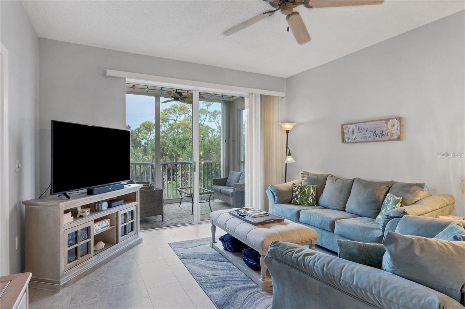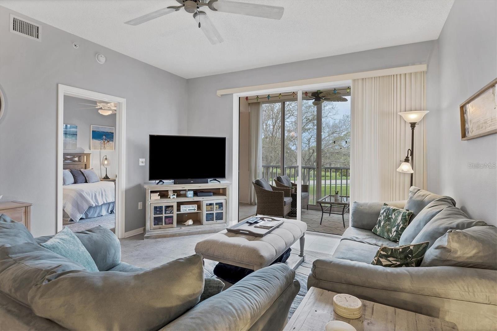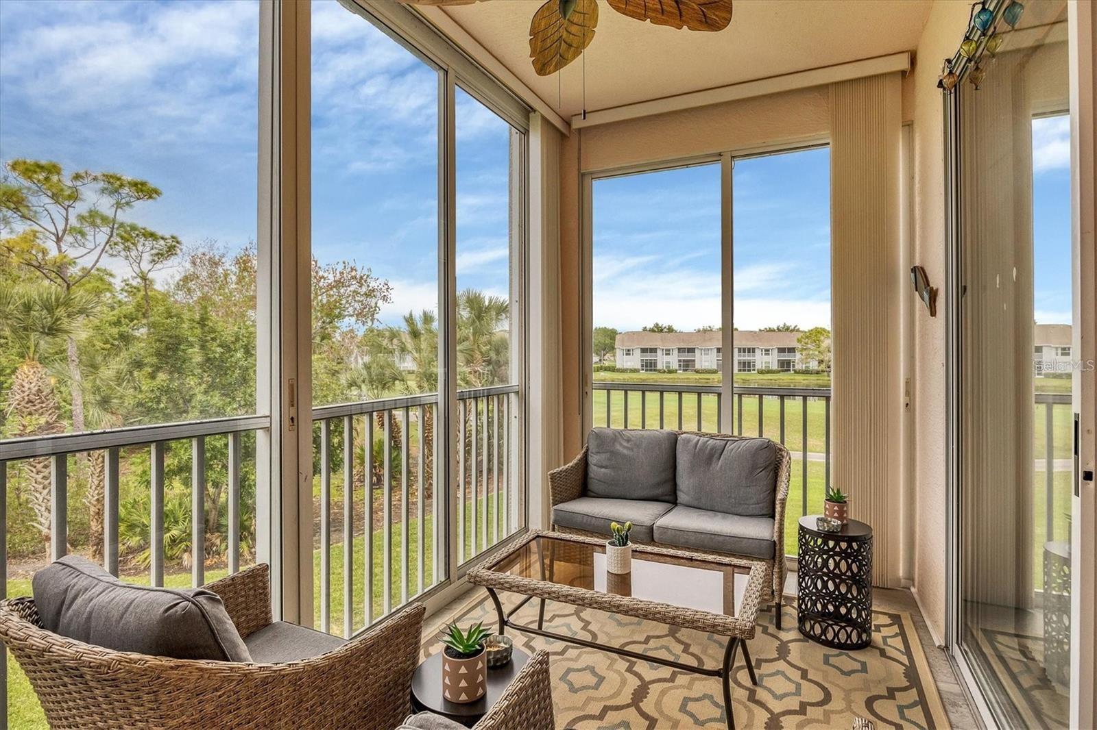RENTED DEC., JAN., FEB., MARCH 2026: AVAILABLE OFF-SEASON. Second-floor condo at Stoneybrook Club South (in elevator building) open floor plan, vinyl flooring in main living areas, granite counters and stainless steel appliances in the kitchen, dining area is open to the living area, large smart TV, and comfortable seating. The primary bedroom has king bed, a sliding glass door out onto the lanai, a walk-in closet, granite countertops and a walk-in shower. The second bedroom has double bed and twin bed making it perfect for those occasional guests. The glassed and screened lanai extends the living space and is a welcoming spot to relax and enjoy picturesque views across the lake and surroundings. The unit provides a convenient inside laundry, one covered parking space, a storage locker, and the community pool and tennis courts are right across the parking lot. The golf or social membership are available for transfer (check with clubhouse for fee schedule) allowing full use of all amenities, including access to the newly modernized golf course, a pristine pool, tennis courts, pickleball, and a clubhouse with a full-service restaurant and much more. The community borders the Legacy walking and biking trail, is less than 15 minutes from the sugary sandy beaches of Siesta Key, the village shops and restaurants, and a short drive to downtown Sarasota to enjoy the culinary and cultural experiences that Sarasota has to offer.