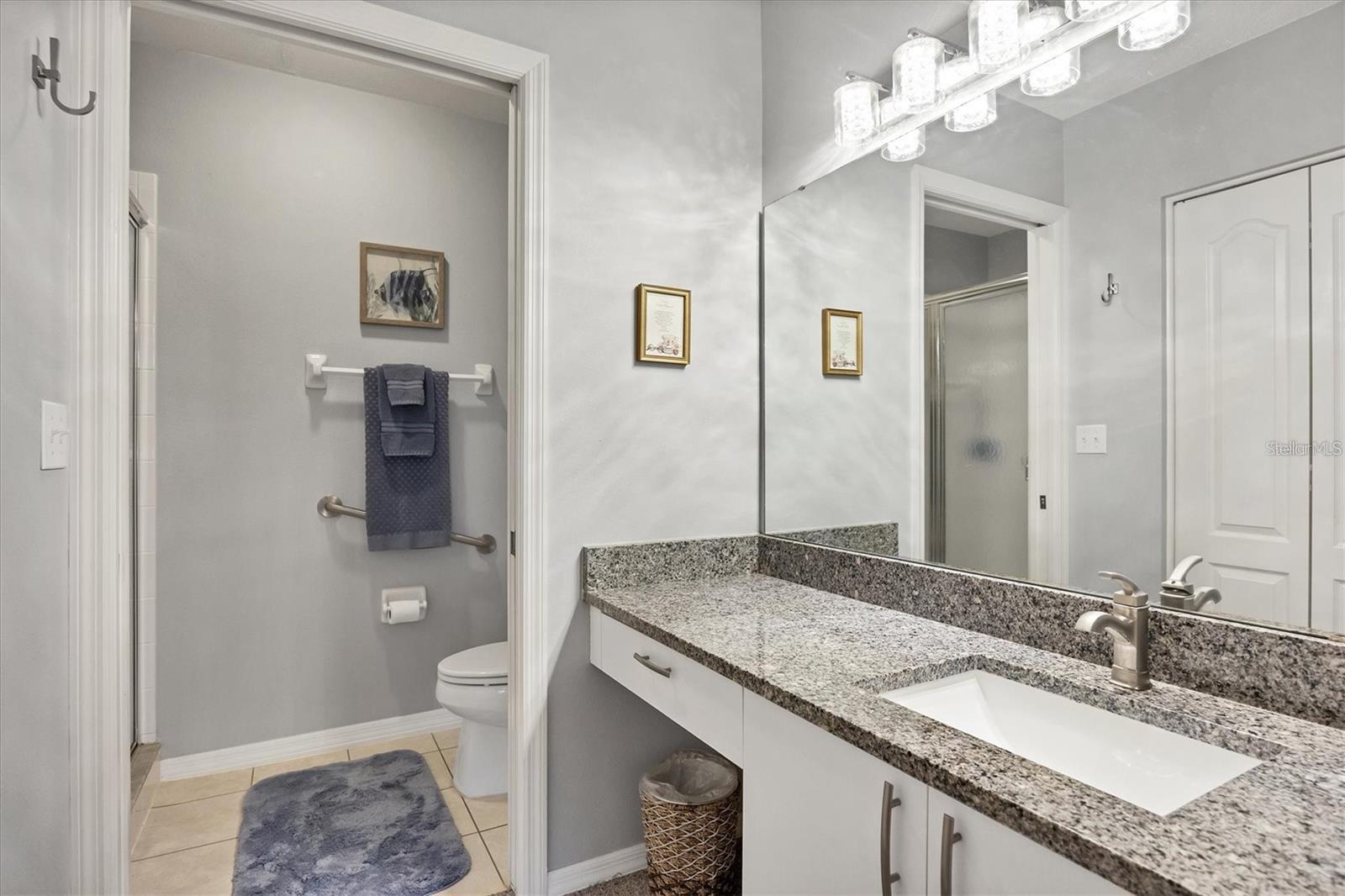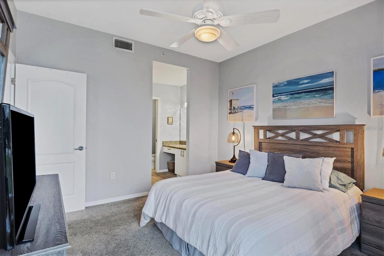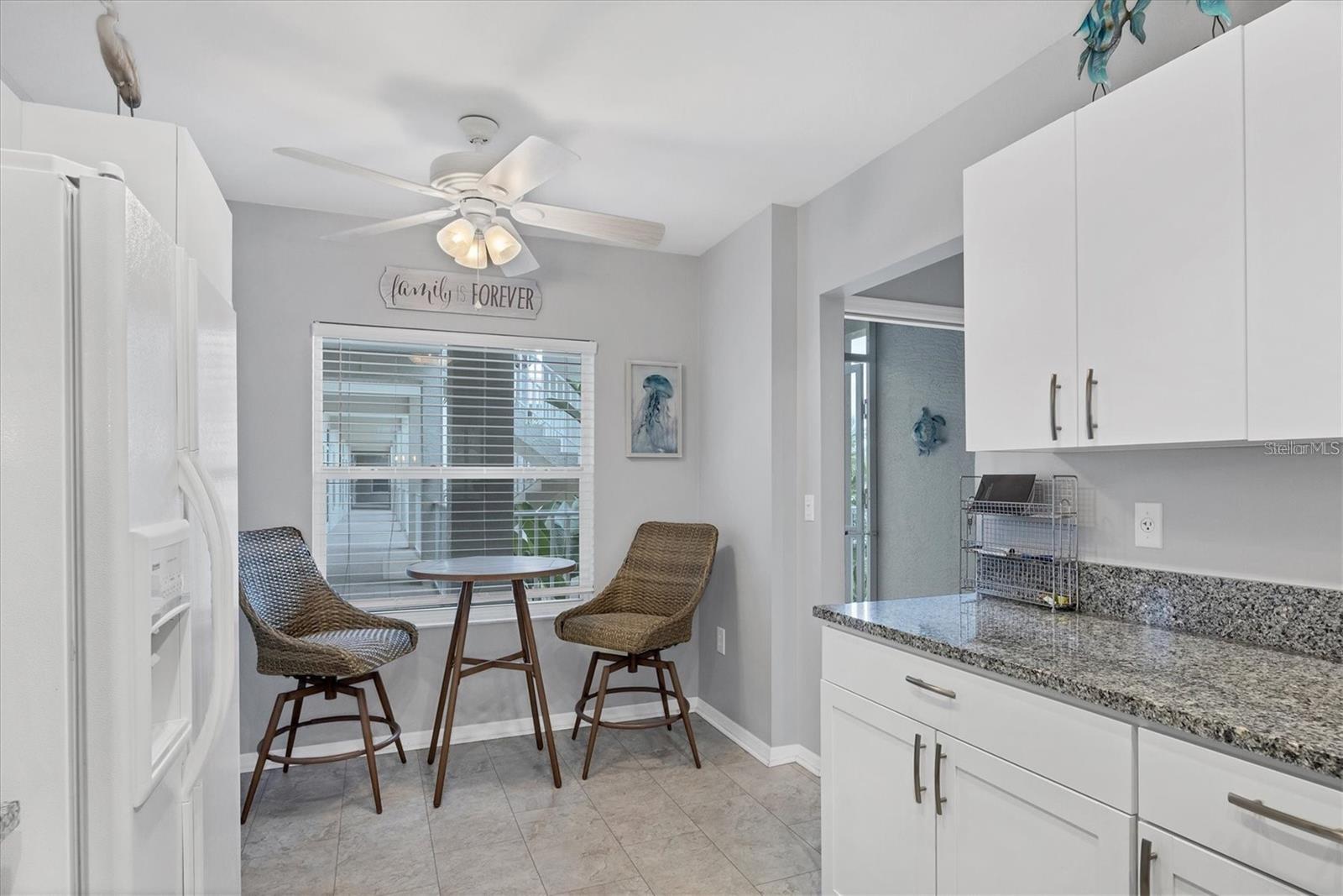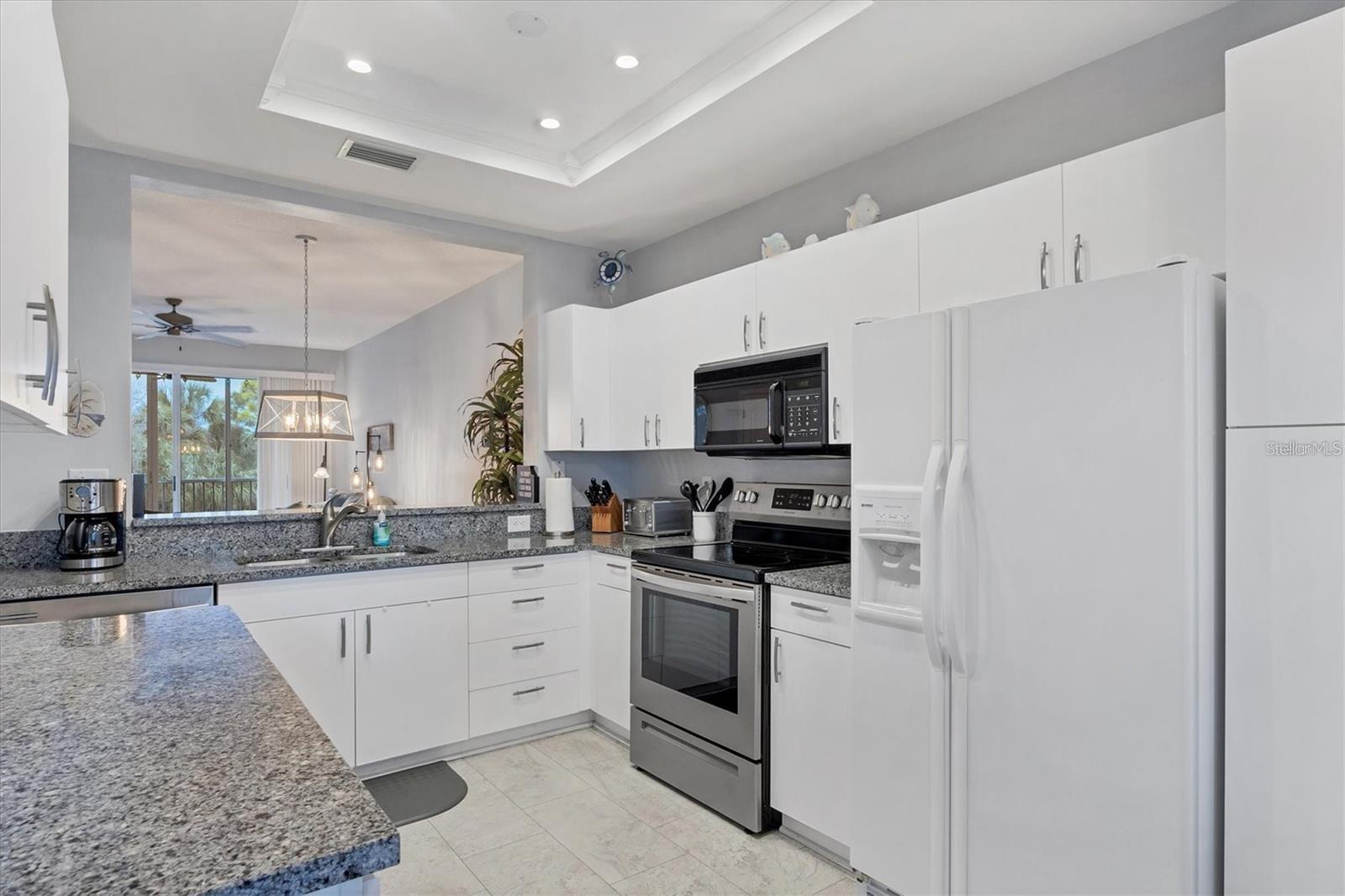 RENTED DEC., JAN., FEB., MARCH 2026: AVAILABLE OFF-SEASON. Second-floor condo at Stoneybrook Club South (in elevator building) open floor plan, vinyl flooring in main living areas, granite counters and stainless steel appliances in the kitchen, dining area is open to the living area, large smart TV, and comfortable seating. The primary bedroom has king bed, a sliding glass door out onto the lanai, a walk-in closet, granite countertops and a walk-in shower. The second bedroom has double bed and twin bed making it perfect for those occasional guests. The glassed and screened lanai extends the living space and is a welcoming spot to relax and enjoy picturesque views across the lake and surroundings. The unit provides a convenient inside laundry, one covered parking space, a storage locker, and the community pool and tennis courts are right across the parking lot. The golf or social membership are available for transfer (check with clubhouse for fee schedule) allowing full use of all amenities, including access to the newly modernized golf course, a pristine pool, tennis courts, pickleball, and a clubhouse with a full-service restaurant and much more. The community borders the Legacy walking and biking trail, is less than 15 minutes from the sugary sandy beaches of Siesta Key, the village shops and restaurants, and a short drive to downtown Sarasota to enjoy the culinary and cultural experiences that Sarasota has to offer.