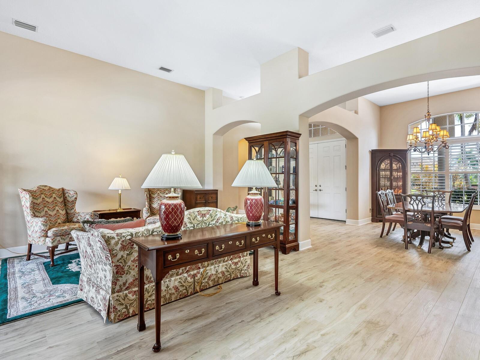 - Ceiling Fans(s), Eat-in Kitchen, High Ceilings, Kitchen/Family Room Combo, Open Floorplan, Primary Bedroom Main Floor, Solid Surface Counters, Solid Wood Cabinets, Split Bedroom, Stone Counters, Vaulted Ceiling(s), Walk-In Closet(s), Window Treatments
