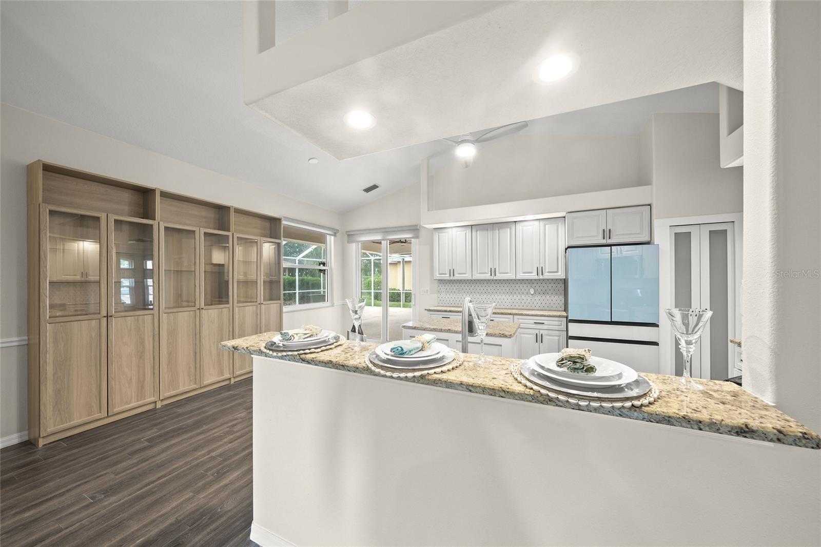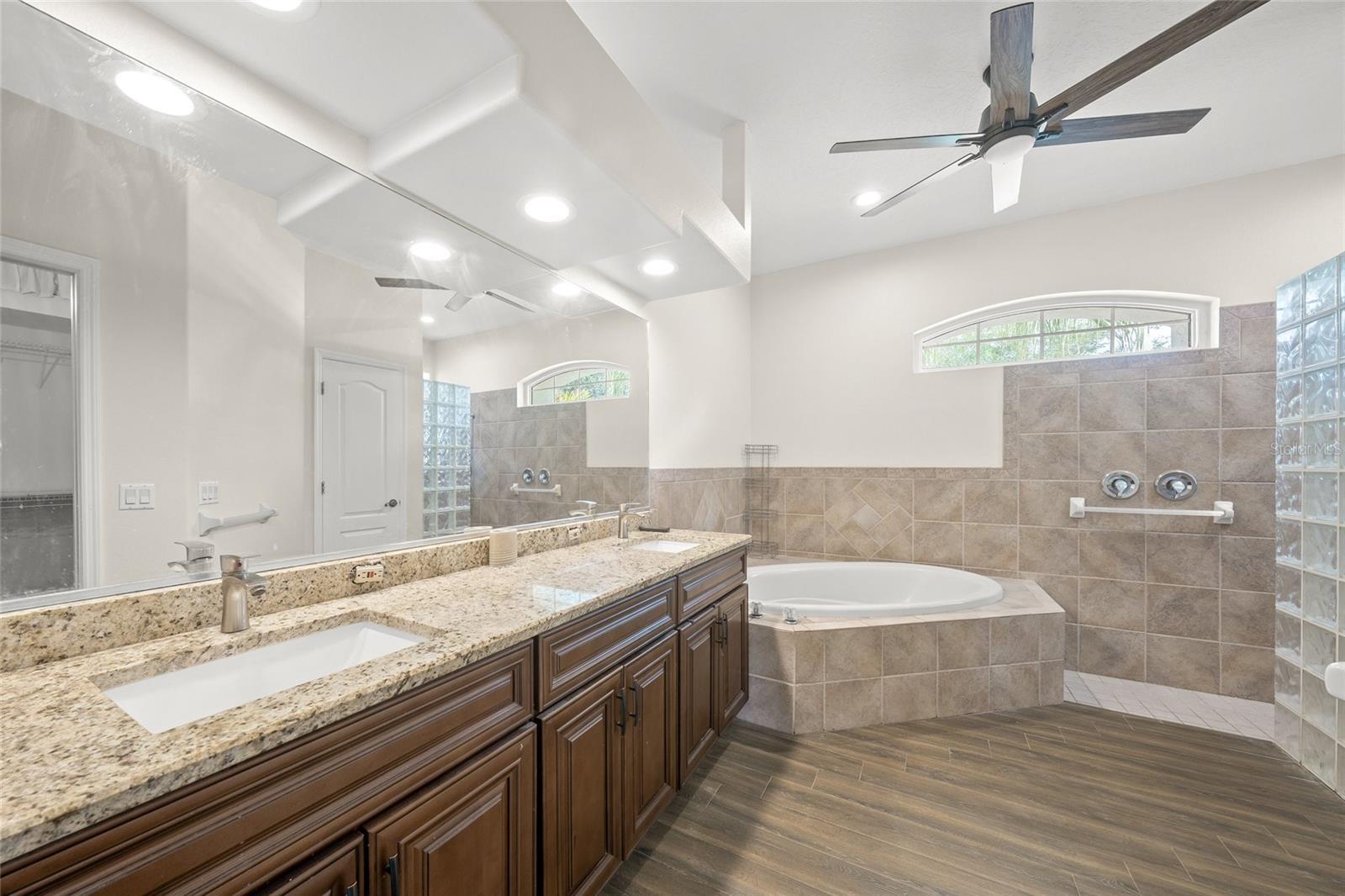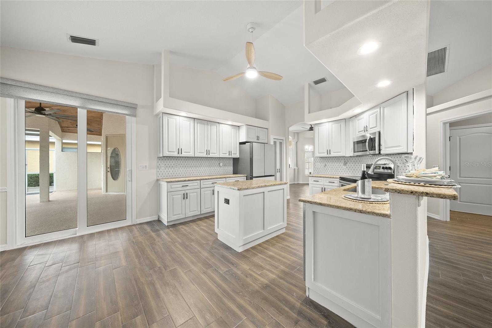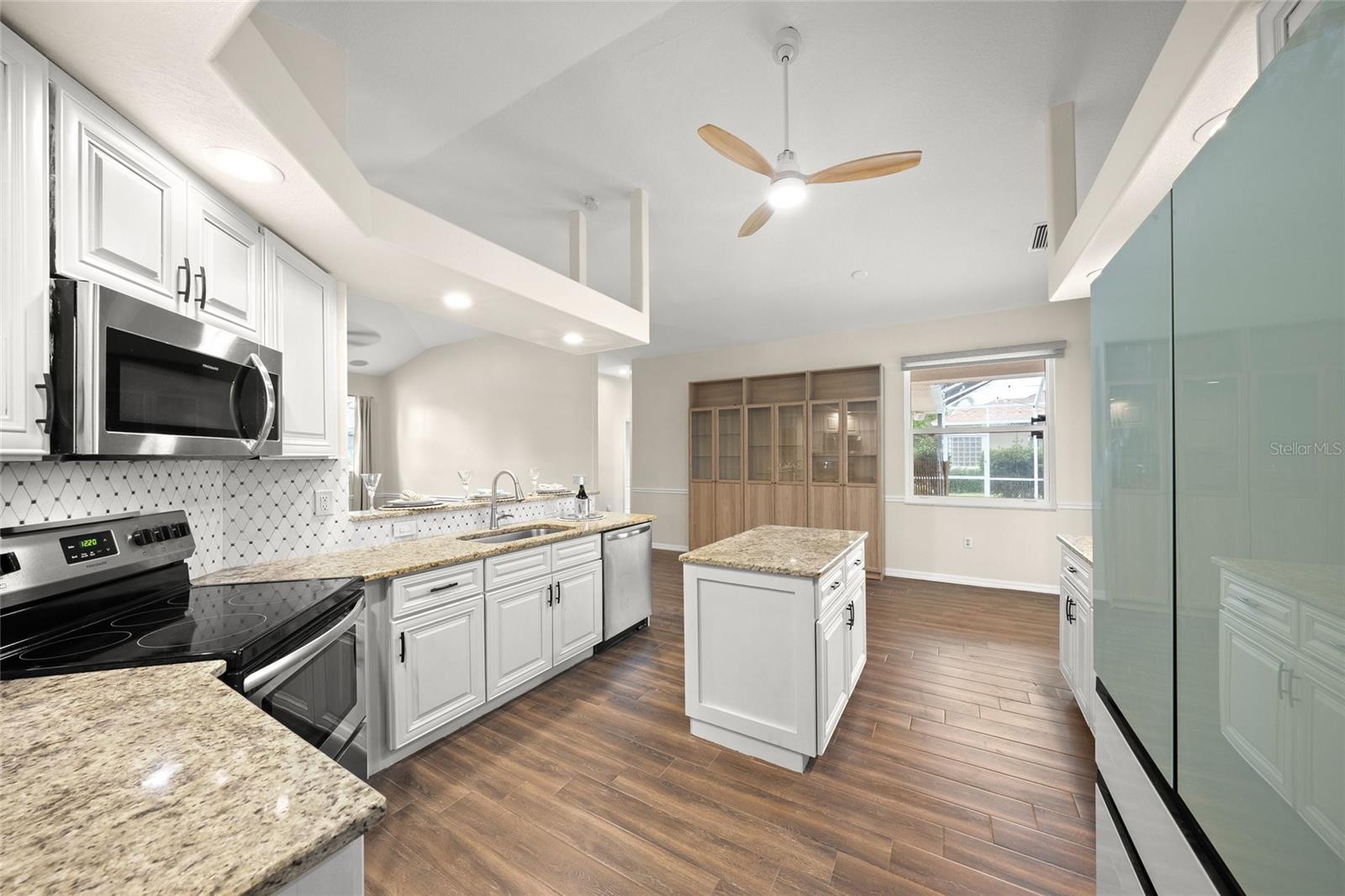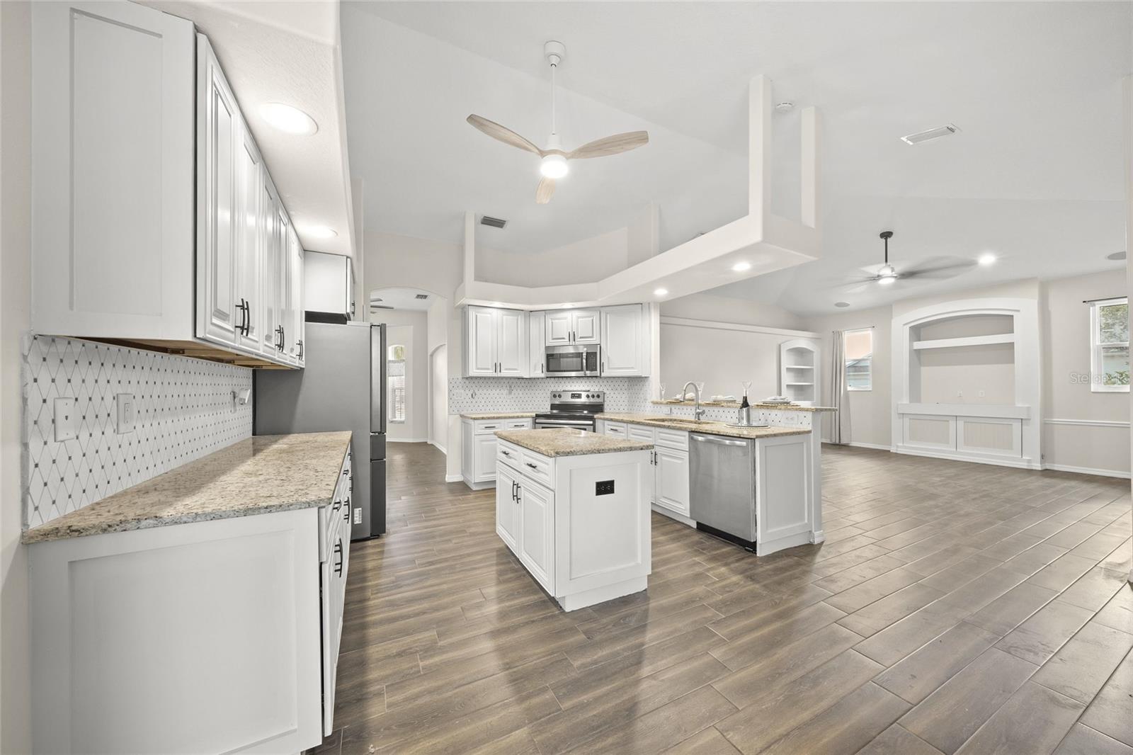 - Ceiling Fans(s), Coffered Ceiling(s), Eat-in Kitchen, High Ceilings, Kitchen/Family Room Combo, Primary Bedroom Main Floor, Stone Counters, Walk-In Closet(s), Window Treatments