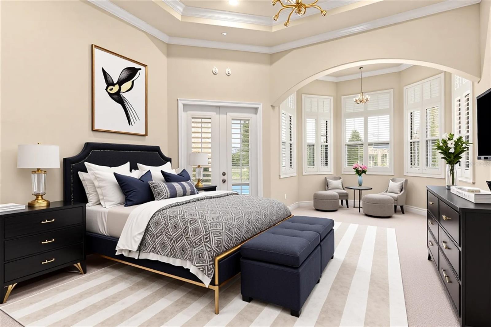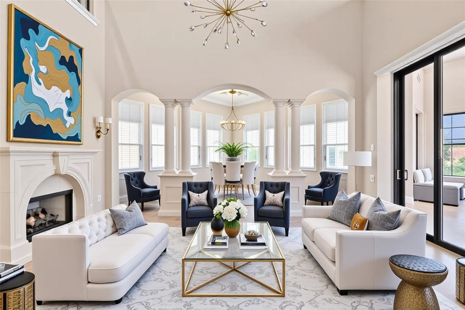 One or more photo(s) has been virtually staged. Welcome to the pinnacle of Florida luxury living on a premier cul de sac overlooking the prestigious Kings Dune’s 15th green in the heart of Lakewood Ranch. This exceptional estate, exquisitely crafted by John Cannon homes, combines elegant design, resort-style amenities and smart features to create a truly unforgettable home. Nestled on a premium half acre lot, the professional landscaping blends tropical palms and sophisticated oaks, setting the stage for the impressive elevation drawing your eye up the refined paver driveway to the substantial double front doors. Step inside to find a bright, open entryway enhanced by soaring 24’ ceilings and an expansive dining and gathering room framed by windows that flood the space with natural light. Feature your precious collectibles and artwork in the built-in entertainment center and multiple wall niches, creating easy displays to personalize your space and aesthetic. The aspiring chef will delight in the beautiful kitchen where crafting your culinary creations is a breeze with the help of high end appliances and a functional layout. The open concept affords effortless entertainment and promises that you never misses a moment or a memory whether your guests are seated at the counter, in the eat in kitchen area, the expansive living room with a warm gas fireplace or the bonus billiards room. Outdoor integration is seamless with collapsable glass doors to the expansive outdoor kitchen and screened oasis featuring a large, salt water pool and spa, comfortable ceiling fans, a television and a generous patio with ample seating and gathering areas. As days of adventures fade to peaceful evenings and sunsets, the first floor principal suite will be your personal retreat where a luxurious bath including a walk-in shower, soaking tub, double sinks and handsome travertine tile. This space is the perfect place to pamper and unwind while the custom owner’s closet will keep your fetching attire organized. This home offers three additional, generous bedrooms each with a private bath, a quiet office space, a second floor screened patio with pristine golf course views, multiple wet bars with wine storage, a water purification system, and 3 a/c units (each replaced since 2020). For those who love to tinker, the 3.5 car garage features epoxy flooring, it’s own a/c, new cabinets and shelves, upgraded electrical and an insulated attic space. Rest peacefully knowing your home is protected by waterproofed outdoor electrical, hurricane film on select windows and hurricane shutters, and a whole house gas generator. Located just minutes from world-class shopping, dining, top-rated schools and the vibrant culture and arts scene of Sarasota this home is ideal for a full time resident or an amazing seasonal escape. Experience the ultimate in Florida luxury living – where every detail is curated for comfort, style and relaxation. It’s more than a home, it’s a lifestyle!