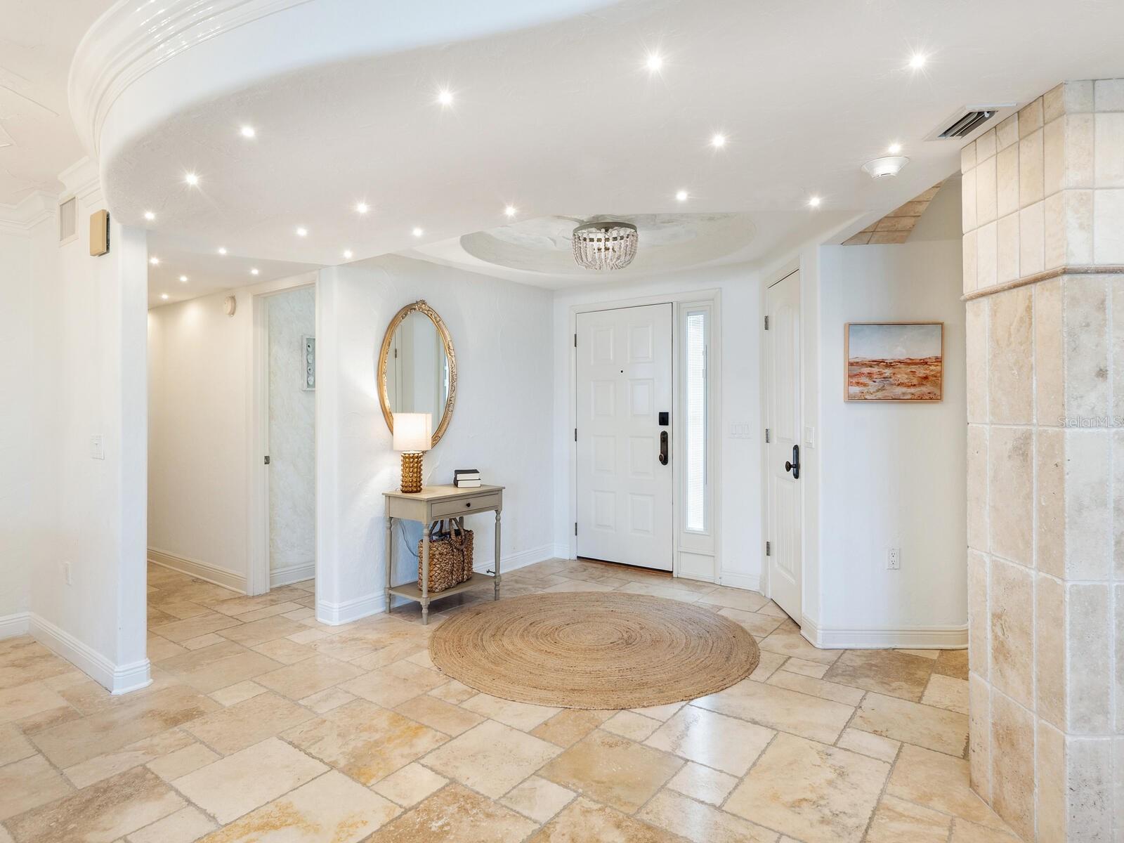 - Built-in Features, Crown Molding, Eat-in Kitchen, Elevator, Living Room/Dining Room Combo, Solid Surface Counters, Split Bedroom, Stone Counters, Thermostat, Wet Bar, Window Treatments