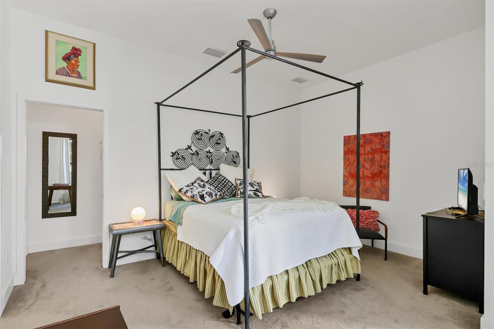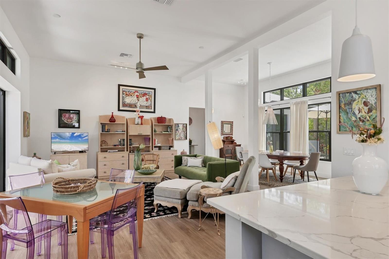 - Ceiling Fans(s), Eat-in Kitchen, High Ceilings, In Wall Pest System, Kitchen/Family Room Combo, Living Room/Dining Room Combo, Open Floorplan, Primary Bedroom Main Floor, Solid Surface Counters, Solid Wood Cabinets, Split Bedroom, Stone Counters, Thermostat, Walk-In Closet(s), Wet Bar
