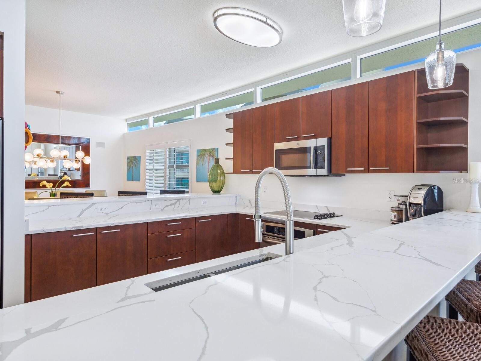 Spectacular, rarely available gulf-front living at Crescent Siesta Key. Savor endless Gulf of Mexico views and world-renowned Siesta Beach’s powdery white sands from this luxurious three-bedroom, three-bath, turnkey-furnished residence in Crescent Siesta Key. Positioned with a desirable southwest exposure, this exceptional condominium blends elegant coastal style with thoughtful design across nearly 2,200 square feet of climate-controlled living space. Towering 11.5-foot ceilings and transom windows flood the open floor plan with natural light, while custom finishes and soft contemporary décor create an atmosphere of effortless sophistication. The chef’s kitchen is a culinary dream, featuring Poggenpohl cabinetry, sleek stone countertops, bar-height seating and abundant pantry storage, all opening seamlessly to the spacious great room and dining area. Go through glass sliders to the expansive 10-by-17-foot terrace, where glass railings frame unobstructed views of the Gulf. Equipped with a summer kitchen, this outdoor haven is ideal for alfresco dining and sunset cocktails. The gracious primary suite is a tranquil retreat, offering breathtaking beach views and direct access to the lanai. The luxurious en-suite bath includes dual vanities, a jetted soaking tub and an oversized walk-in shower. Two additional bedrooms—one with a private bath—provide ample space for guests or the flexibility of a home office or den. A generous laundry room features a full-size washer and dryer, utility sink and built-in storage. This gated, boutique enclave of just 26 residences offers the ultimate in maintenance-free beachfront living. Built in 2006 to the highest standards, Crescent Siesta Key boasts premier amenities such as direct beach access, a beachfront pool and spa, a lap pool, a poolside summer kitchen, fitness center, social lounge, clubhouse, elevators and a beautifully landscaped garden terrace. Two covered parking spaces are conveniently next to the secure lobby elevator. The property also includes 24-hour video surveillance, keypad-secured common areas and an EV charging station. Pet-friendly for owners and offering excellent rental income potential with one- and two-week minimum rental periods, this exceptional property is ideal as a full-time residence, vacation getaway or high-performing investment. Just moments to Siesta Village and mainland Sarasota’s cultural, dining and shopping experiences, this is the pinnacle of Gulf-front living on Florida’s celebrated beach.