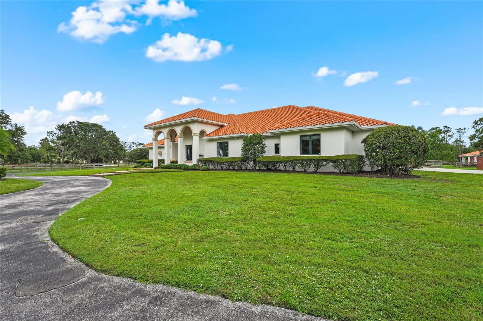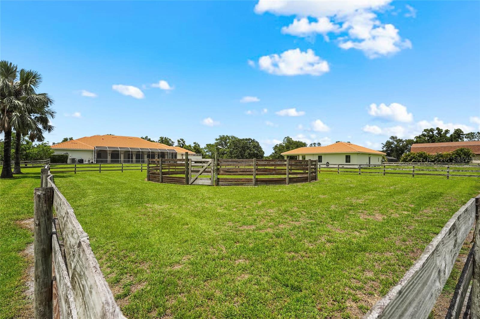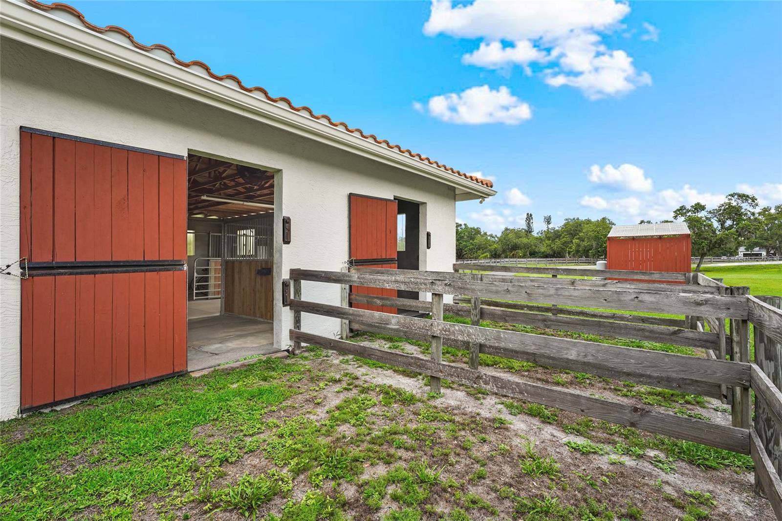 Under contract-accepting backup offers. Welcome to this exceptional equestrian gem meant for multigenerational living with 2 homes, a horse stable with 6 stalls, 5 fully fenced pastures, an air-conditioned tack room, and a custom round pen for training that equestrians will be thrilled with! This amazing estate is located in the gated Saddle Creek community, where equestrian living meets refined comfort. The main house includes 3-bedrooms and 2.5-bathrooms. This ranch style pool home offers over-the-top charm and functionality, with a pond on property, a private gate at the entrance, and 26 miles of community riding trails. The fully furnished guest house includes 3 bedrooms, a full kitchen, laundry room, and its own carport. The main home features tile flooring throughout the common areas and a spacious primary suite with a walk-in closet and private fenced-in courtyard. The primary bathroom is elegantly appointed with double vanities, stone countertops, soft-close cabinetry, and a stunning wraparound dual-entry shower. The great room and kitchen share an open layout beneath soaring 15-foot cathedral ceilings with rustic wood beams, creating an airy and inviting space. The gourmet kitchen boasts granite countertops, soft-close drawers and cabinets, a large prep island, and newer stainless steel KitchenAid appliances. The two additional bedrooms share a full bath, and the 4-car garage includes an EV charger. Additional upgrades include a new HVAC system and reverse osmosis water system. Step outside to your saltwater, heated pool with a covered, fenced-in lounging area—perfect for entertaining. This rare Saddle Creek gem offers the perfect blend of luxury, privacy, and equestrian lifestyle—all just minutes from town.