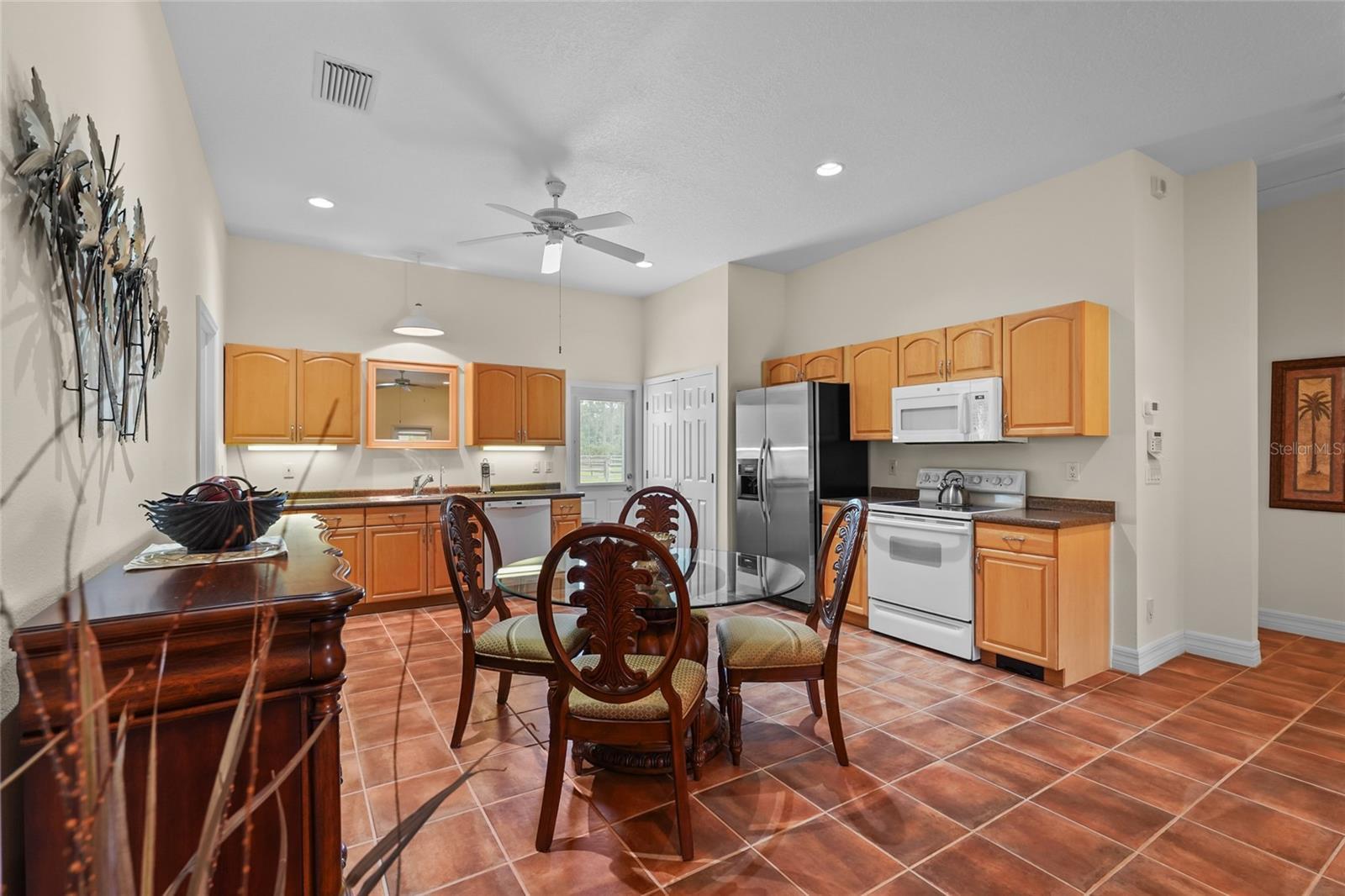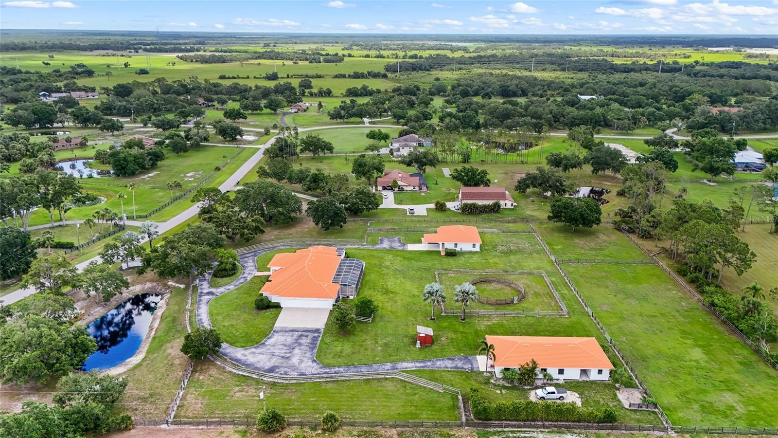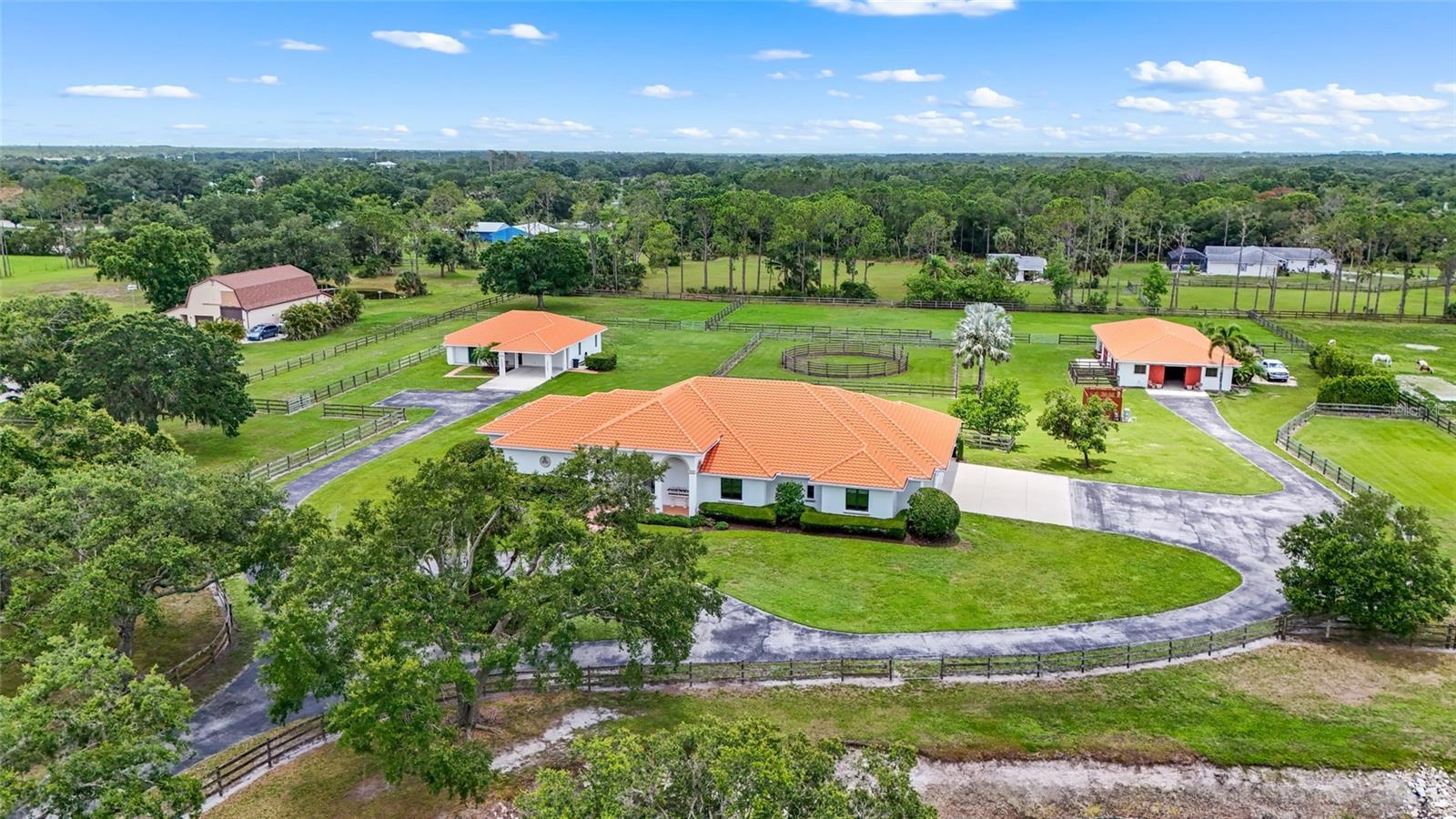 Under contract-accepting backup offers. Welcome to this exceptional equestrian gem meant for multigenerational living with 2 homes, a horse stable with 6 stalls, 5 fully fenced pastures, an air-conditioned tack room, and a custom round pen for training that equestrians will be thrilled with! This amazing estate is located in the gated Saddle Creek community, where equestrian living meets refined comfort. The main house includes 3-bedrooms and 2.5-bathrooms. This ranch style pool home offers over-the-top charm and functionality, with a pond on property, a private gate at the entrance, and 26 miles of community riding trails. The fully furnished guest house includes 3 bedrooms, a full kitchen, laundry room, and its own carport. The main home features tile flooring throughout the common areas and a spacious primary suite with a walk-in closet and private fenced-in courtyard. The primary bathroom is elegantly appointed with double vanities, stone countertops, soft-close cabinetry, and a stunning wraparound dual-entry shower. The great room and kitchen share an open layout beneath soaring 15-foot cathedral ceilings with rustic wood beams, creating an airy and inviting space. The gourmet kitchen boasts granite countertops, soft-close drawers and cabinets, a large prep island, and newer stainless steel KitchenAid appliances. The two additional bedrooms share a full bath, and the 4-car garage includes an EV charger. Additional upgrades include a new HVAC system and reverse osmosis water system. Step outside to your saltwater, heated pool with a covered, fenced-in lounging area—perfect for entertaining. This rare Saddle Creek gem offers the perfect blend of luxury, privacy, and equestrian lifestyle—all just minutes from town.