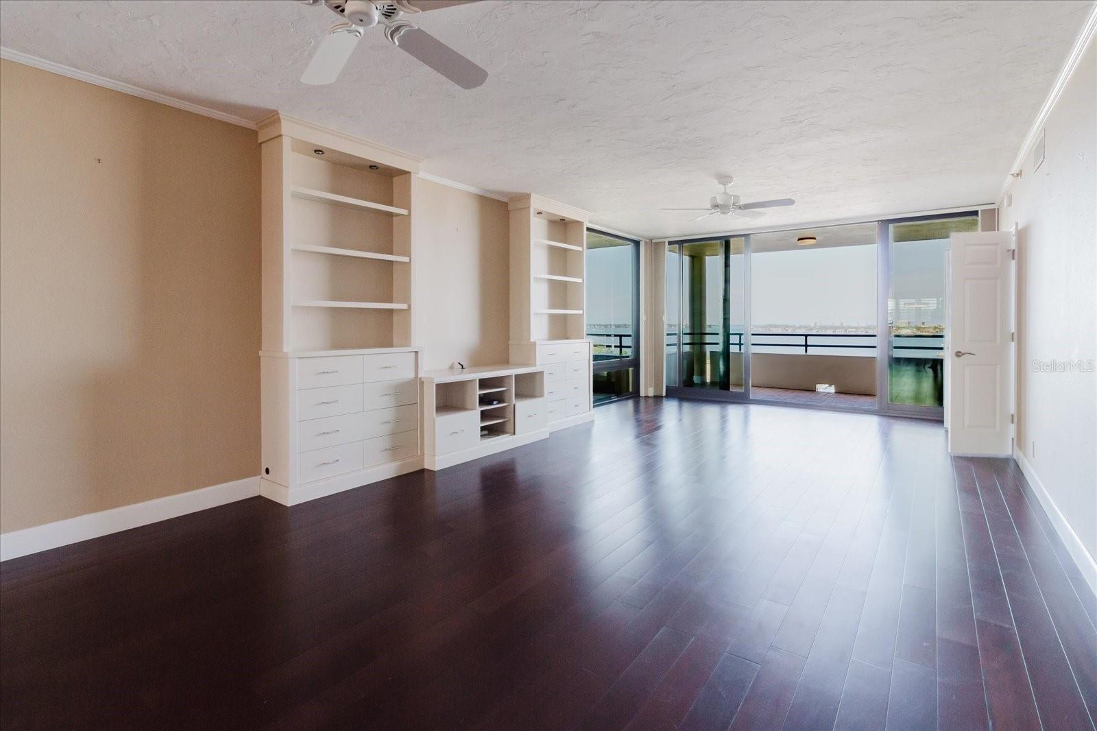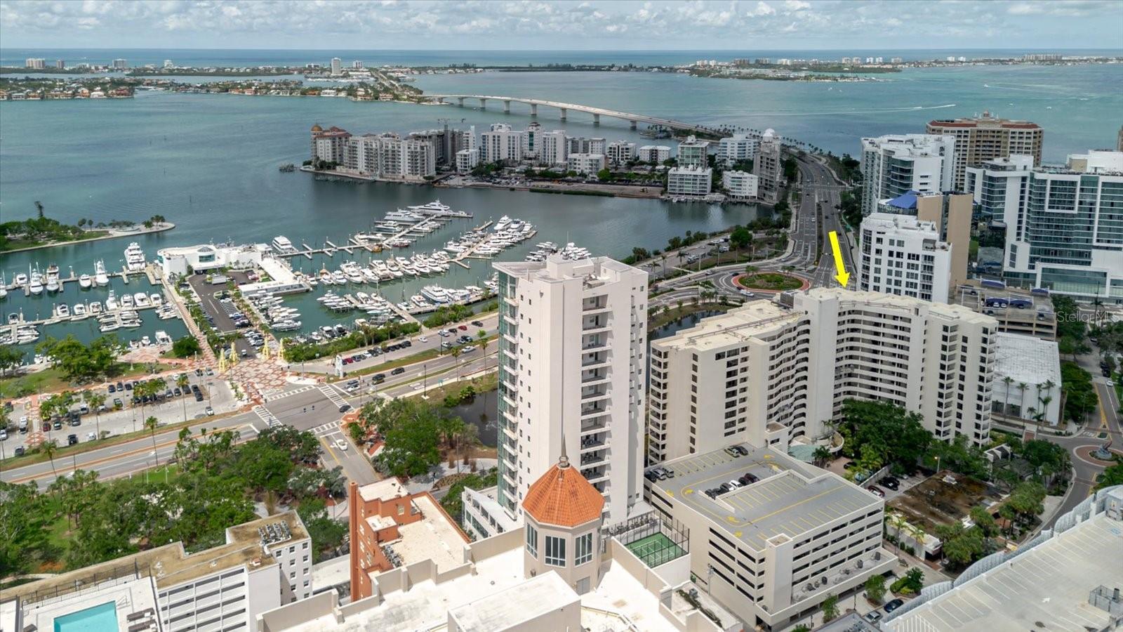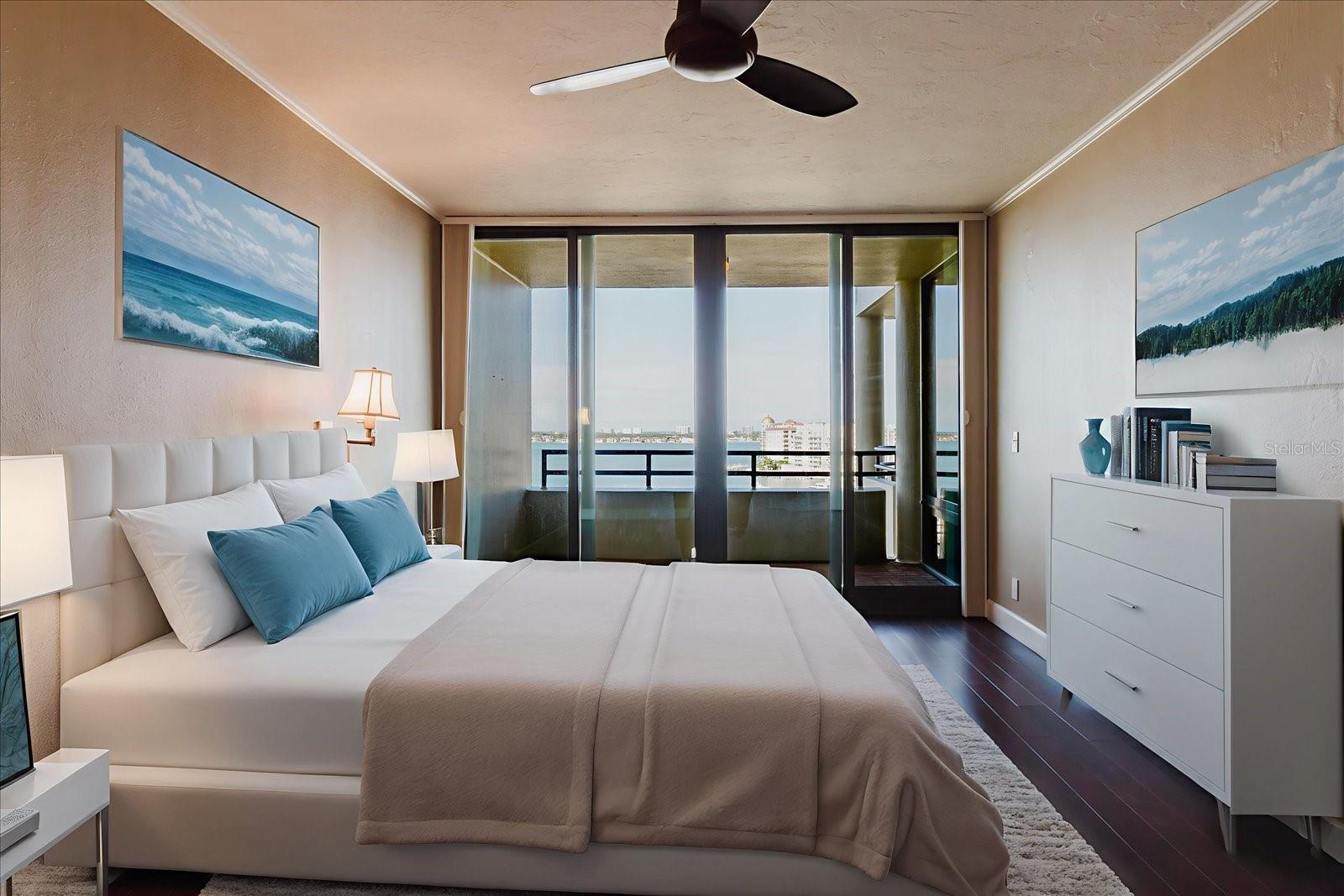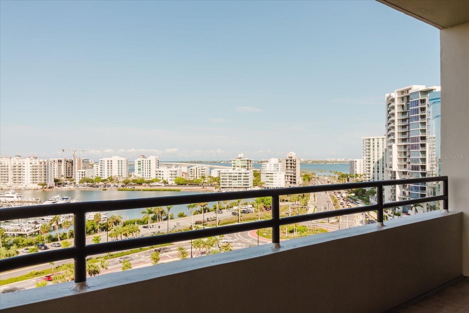 One or more photo(s) has been virtually staged. Experience luxurious downtown living from the 11th floor of the renowned Bay Plaza, offering sweeping, unobstructed views of Sarasota Bay. Perfectly positioned on Palm Avenue—between Main Street and Cocoanut Avenue—this iconic address puts you in the heart of it all. Bay Plaza delivers top-tier amenities including 24-hour concierge service, valet parking, a Contemporary lobby, well-equipped fitness center, library, and a media/meeting room. Relax poolside in the heated swimming pool and spa, or entertain outdoors using outdoor kitchen. Inside, this thoughtfully designed 2-bedroom, 2-bath home with an additional office space has been upgraded with new impact-rated sliding glass doors and windows, maximizing panoramic bay views from nearly every room. Brazilian cherry hardwood floors flow through the main living areas and bedrooms, setting a warm, elegant tone. The expansive great room opens onto a generous balcony—the perfect spot to catch unforgettable sunsets. The gourmet kitchen is a dream for any culinary enthusiast, featuring travertine marble flooring, granite countertops, custom walnut cabinetry, and premium appliances: KitchenAid refrigerator, double oven, Miele induction cooktop, Wolf microwave drawer, and a glass-door wine fridge. Retreat to a serene primary suite with its own private balcony, custom walk-in closets, and a spa-like en-suite bath showcasing designer porcelain tile, black granite counters, jetted soaking tub, walk-in shower with pebble stone flooring, and private commode. The guest suite offers a clever blend of style and function, with a queen Murphy bed, built-in shelving, and its own custom closet. The guest bath includes a glass-enclosed shower and in-unit washer/dryer setup. Known for its security and prestige, Bay Plaza is among the most desirable buildings in Sarasota. You’re steps away from world-class dining, entertainment, the opera, weekend farmers markets, Selby Gardens, and the vibrant Sarasota Bayfront. This is downtown waterfront living at its finest—don’t let this rare opportunity pass you by!