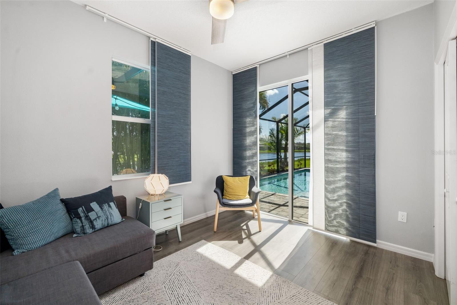 Under contract-accepting backup offers. ***HUGE PRICE REDUCTION*** Connect with the listing agent for details***Stunning Water View spacious 4-bedroom, 2 bath with half bath, heated pool, enclosed den, paver driveway with 3 car garage, EV CHARGER with SECOND EV hookup located in the sought after gated community of Greyhawk Landing, delivers exceptional value, privacy, and resort-style Florida living. Inside the open floor plan features tray ceilings, wood-look tile flooring, modern finishes and thoughtful upgrades abound, from sleek fixtures, modern lighting all on dimmer switches to fresh, contemporary design touches, custom built-ins. Living and dining spaces extend to the expansive screened lanai with heated saltwater pool, generous covered areas, pre-plumbed and wired for a future outdoor kitchen, is ideal for year-round enjoyment. The chef’s kitchen offers quartz countertops, a large center island, gas range, stainless steel appliances, abundant cabinetry with soft close drawers, separate eating casual bench seating space. The primary suite is a private retreat with lanai access, custom accent wall, designer lighting, and spa-inspired bath with dual vanities, walk-in shower, makeup vanity, and spacious walk-in closet with custom built-ins. Greyhawk Landing is an established, gated community featuring mature landscaping, scenic lakes, miles of trails, two clubhouses, fitness center, resort-style pools with waterslide, pickle ball, tennis, basketball courts, soccer and baseball field, fishing pier and playgrounds all for a low $70 a year HOA, fencing is allowed. Centrally located within Lakewood Ranch, convenient access to I-75, Sarasota, Tampa, St. Pete, top-rated schools and colleges, premier shopping, dining and Florida’s breathtaking Gulf Coast beaches. A rare opportunity to enjoy privacy, flexibility, and a refined connection to nature in one of most desirable communities.