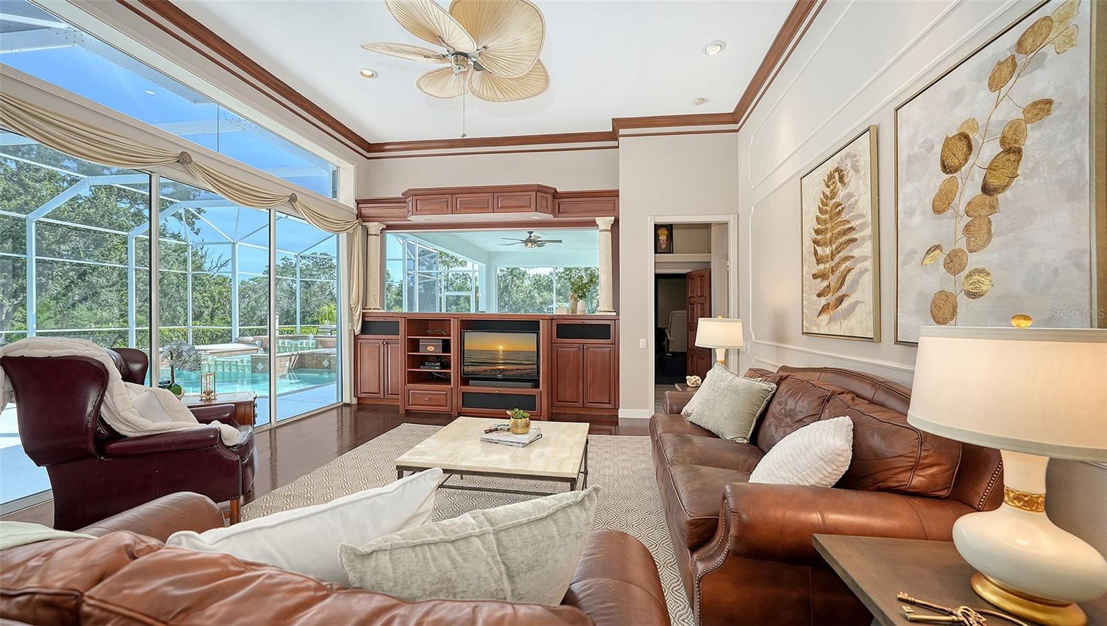 Tucked away on nearly 1.5 acres at the end of a quiet cul-de-sac, this beautifully updated River Club residence offers timeless style and classic Florida living with serene lake and preserve views. A new roof and freshly painted exterior enhance the home’s curb appeal, while a circular driveway welcomes you to a thoughtfully designed interior. The 3,662 sq ft split-bedroom layout includes three bedrooms, three full baths, and a dedicated home theater with platform seating, 11-foot screen, and impressive surround sound. Rich wood flooring, crown molding, built-in speakers throughout, and custom built-ins add character and comfort, while the kitchen features granite countertops, a prep island with wine fridge, walk-in pantry, and a spacious dinette framed by an aquarium window. Ideal for entertaining, the living room showcases a fireplace with built-in shelving and storage, full wet bar, and flows seamlessly into the dining room. Sliding glass doors from both the living and family rooms open to a showstopping tri-level screened lanai with pool and spa, all overlooking the tranquil natural backdrop. The primary suite is a private retreat with lanai access, plantation shutters, two walk-in closets, and a luxurious bath with soaking tub, walk-in shower, dual vanities, private water closet, and linen closet. Set within the established community of River Club, this exceptional home offers easy access to the world-renowned Gulf Coast beaches, the shopping, dining, and entertainment venues of Lakewood Ranch and Sarasota, top-tier medical facilities and A-rated schools.