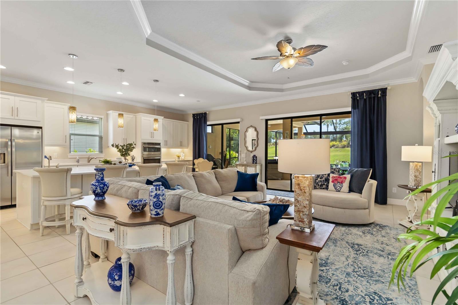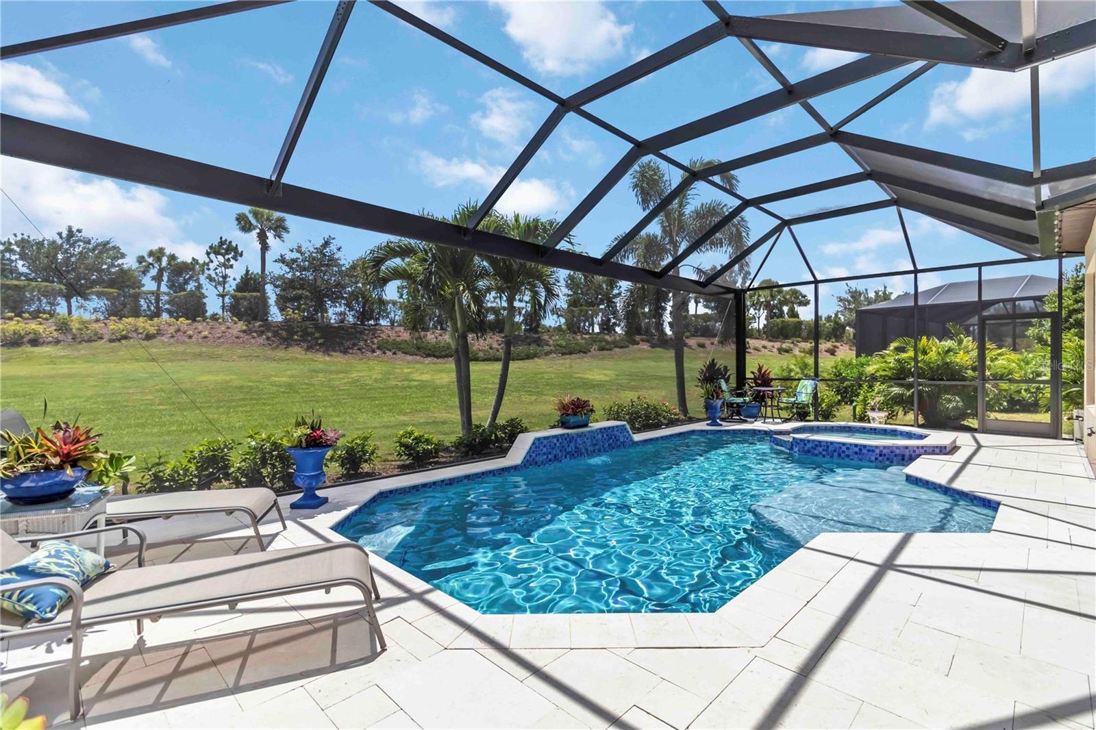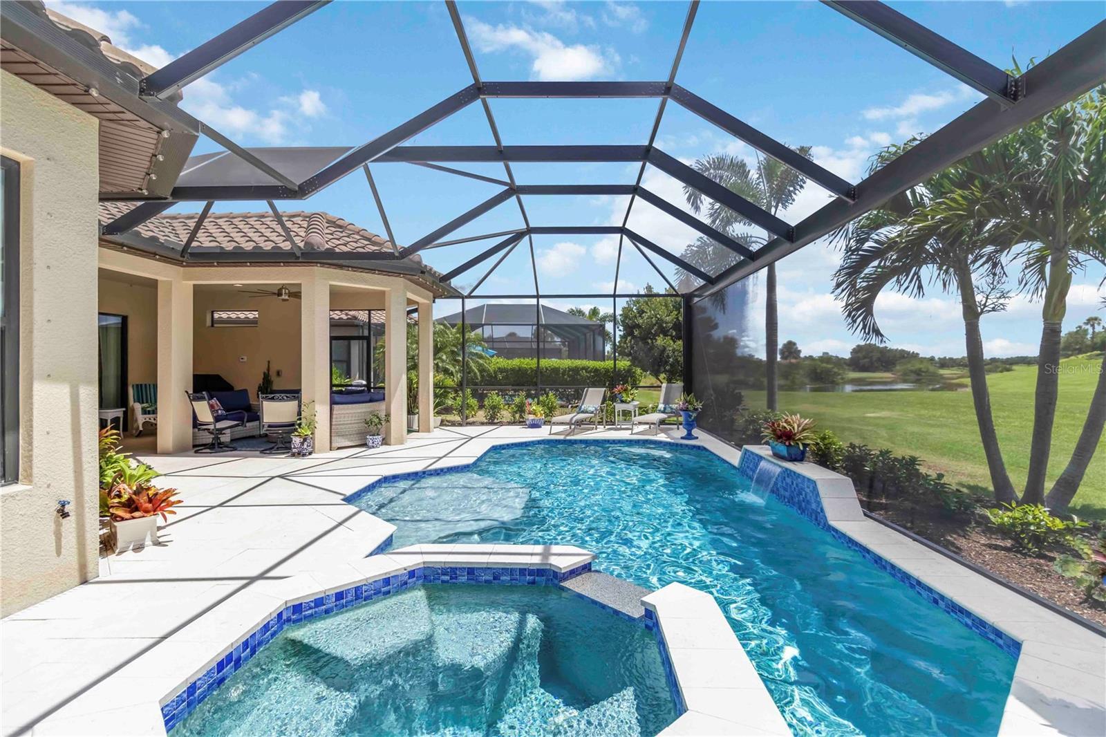 GOLF – SALT POOL – SUNSET Extended Lazio Home in Esplanade with New Laminate Floors in All Bedrooms/New Pool Pump and Controller/New UV light in HVAC Welcome to 4540 Terrazza Court, a beautifully maintained extended Lazio golf-deeded home in Esplanade at Lakewood Ranch, perfectly positioned on a spectacular lot with serene water views on one side and a lush panorama of towering palms and vibrant greenery from the lanai. Inside, this 3-bedroom, 3-bath residence with a flex study features several desirable builder upgrades, including an extended gourmet kitchen with prep sink, extended bay windows in both the primary and guest bedrooms, crown molding throughout, and a thoughtfully expanded layout that offers both comfort and functionality. The neutral palette, open-concept design, and inviting flow provide a clean slate to personalize and make your own. Designed for entertaining, the extended travertine lanai showcases a sparkling saltwater pool and spa with waterfall feature, creating the perfect setting for sunset gatherings or quiet mornings with coffee. The space is already plumbed for an outdoor kitchen, allowing you to customize your ideal outdoor living area. A curated garden backdrop adds a storybook feel to this private retreat. Esplanade at Lakewood Ranch is a gated, resort-style community offering two fitness centers, a full-service spa, bocce ball, pickleball courts, tennis club, fitness classes, walking trails, dog park, culinary center and clubhouse, a resort-style pool with private cabanas, resistance pool, and a full-service tiki bar and restaurant. This is a golf-deeded home. Bring your best offer — the seller is motivated and ready to move.