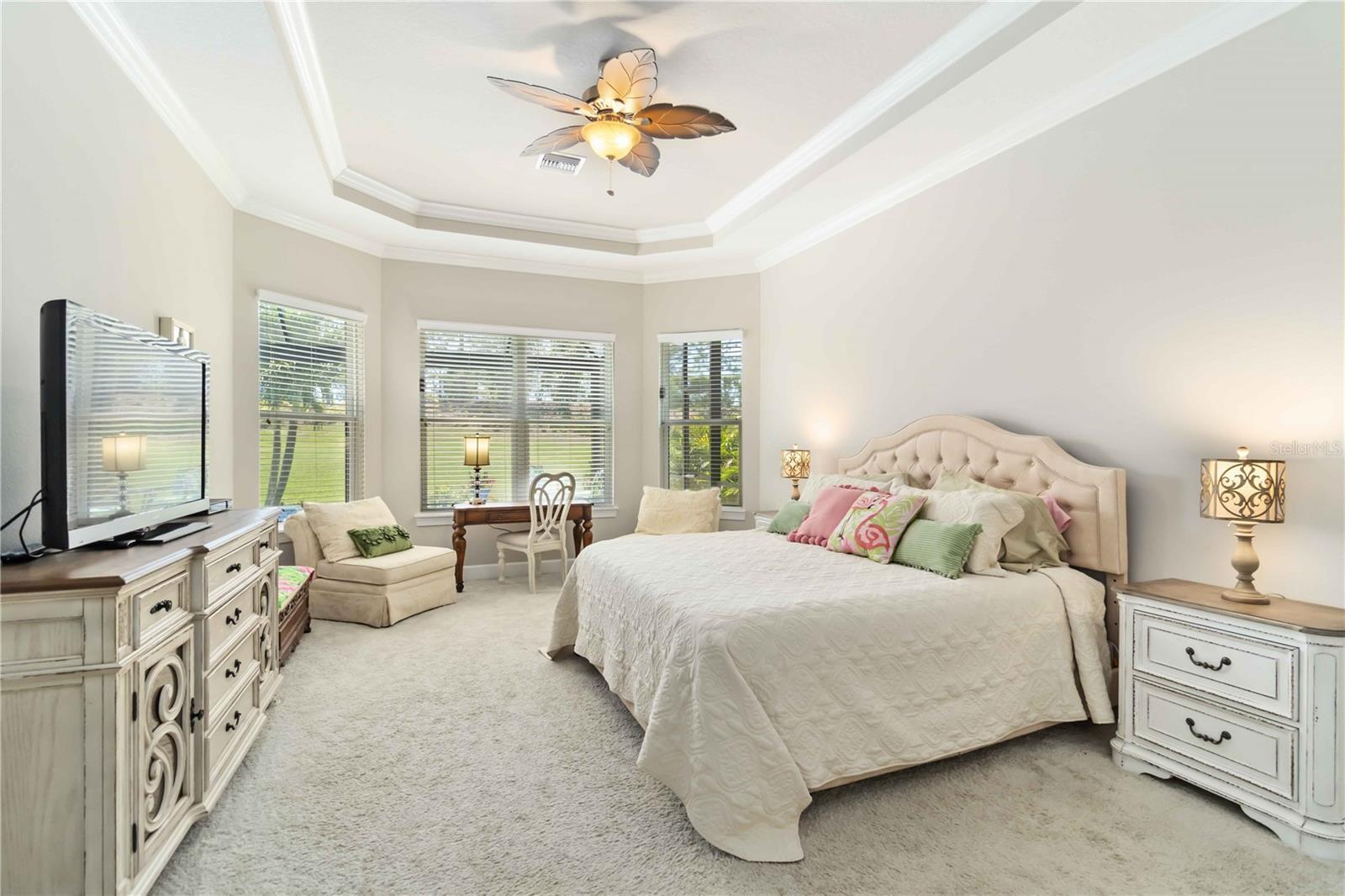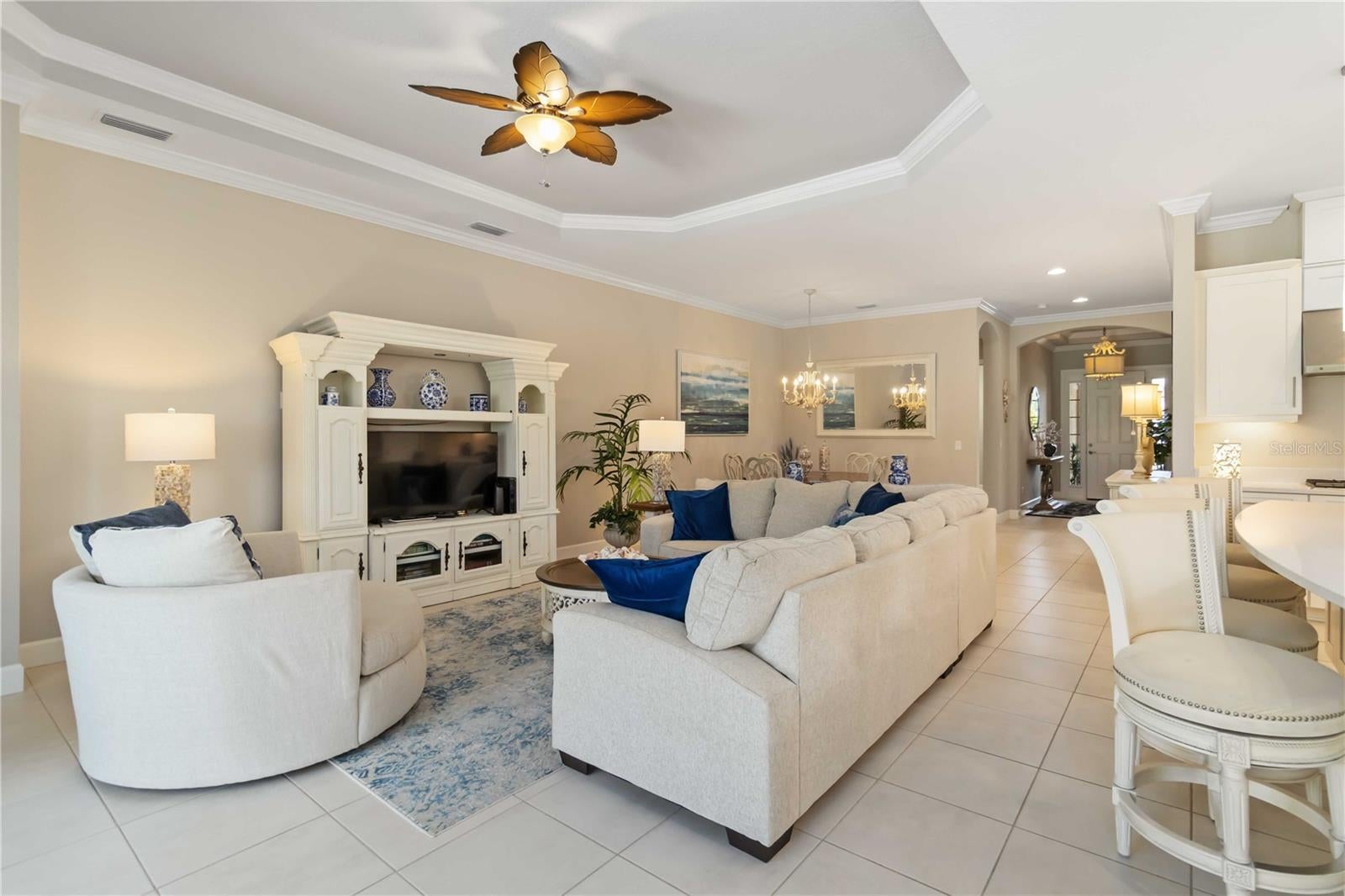 - Ceiling Fans(s), Crown Molding, Eat-in Kitchen, Kitchen/Family Room Combo, Living Room/Dining Room Combo, Open Floorplan, Pest Guard System, Primary Bedroom Main Floor, Solid Wood Cabinets, Stone Counters, Thermostat, Tray Ceiling(s), Walk-In Closet(s), Window Treatments