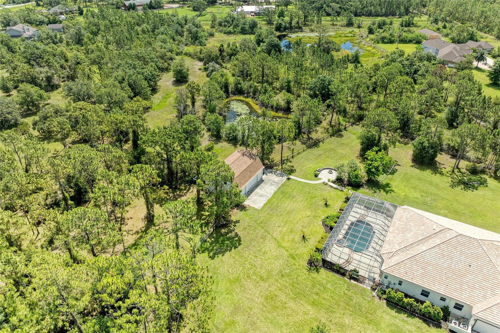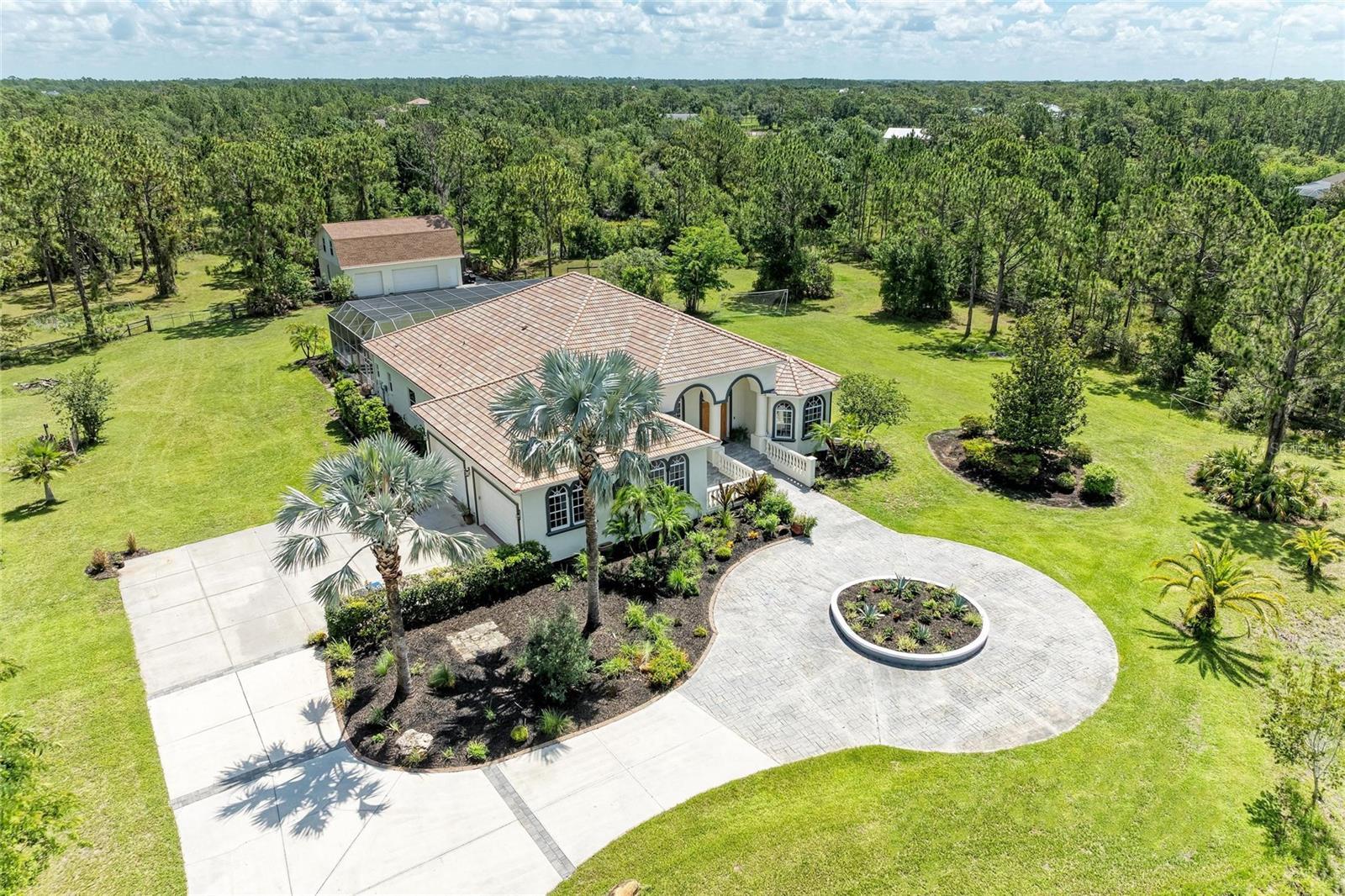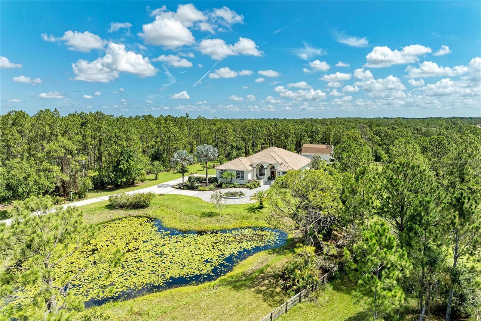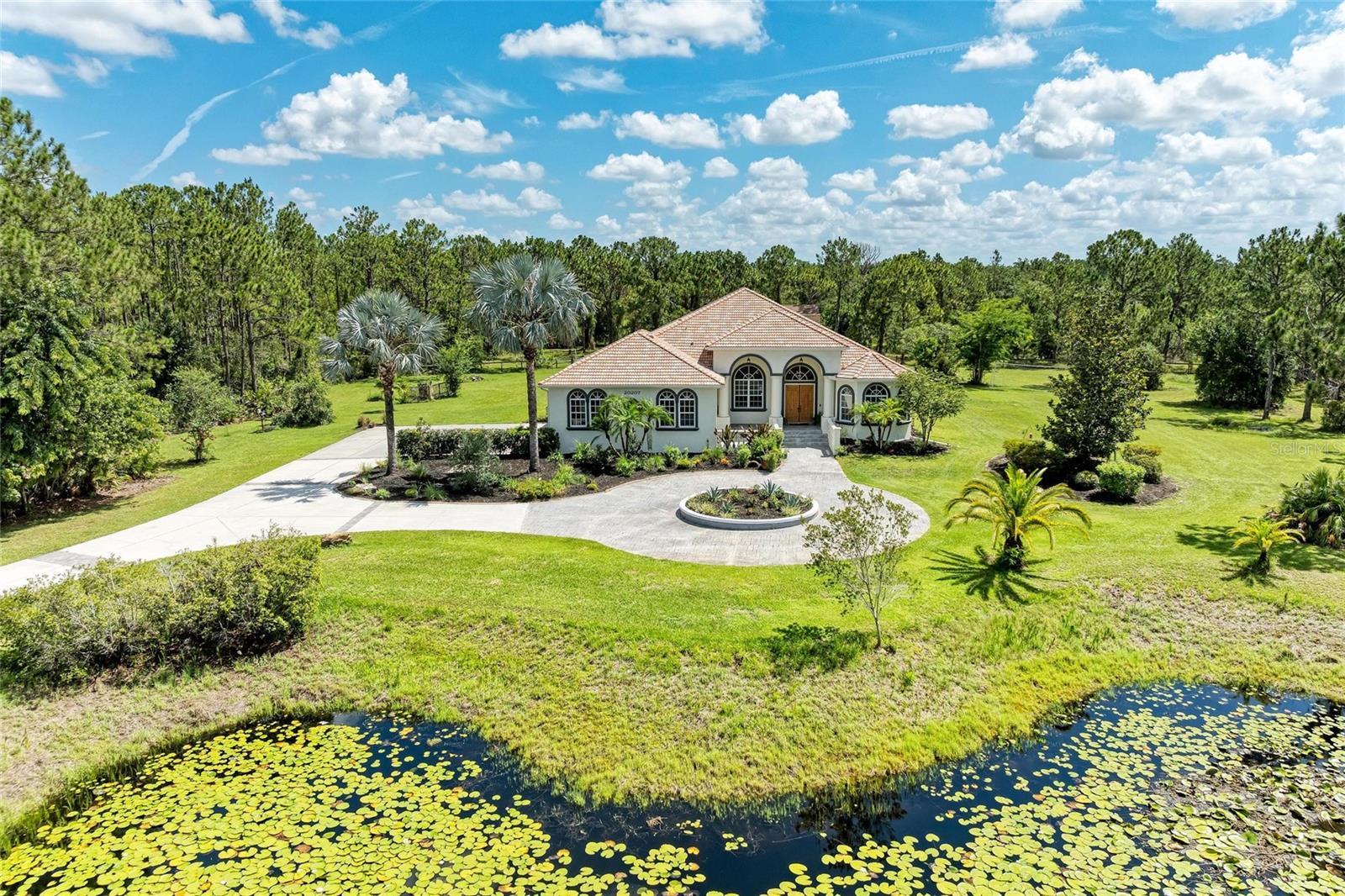 Welcome home to this elegantly REMODELED custom estate set on 5 private acres in the highly desired, equestrian-friendly community of The Forest at Panther Ridge! The Forest is 1 of 9 sections within Panther Ridge encompassing approximately 4,500 acres & 15 miles of scenic trails perfect for hiking or horseback riding. This stunning estate sits on 5 fenced acres consisting of towering pines, oak trees and two ponds on a private, dead-end street. This 3,890 square foot luxuriously REMODELED home has exceptional custom details throughout PLUS a 7 CAR GARAGE (4 car attached to main home & a 3 car detached garage)! The 3 car detached garage has a finished interior complete with spray foam insulation, drywall and paint. UPSTAIRS is a bonus/theatre room providing an EXTRA 595 sq ft., of living space. Dual-Head Mini Split AC system services both the garage area & upstairs bonus room. ALL GARAGE DOORS are MyQ enabled & can be opened & closed with the APP from anywhere! THIS gorgeous home includes 5 bedrooms, 4.5 bathrooms, two of the guest bedrooms are ensuites, a large covered lanai area with a HUGE pool & spa perfect for entertaining & a newer paver walkway leading you to the firepit area & detached garage space. Upon entering the grand foyer you are taken back by the custom details with 14 foot ceilings in the entry and primary bedroom and 12 foot ceilings throughout the rest of the home, elegant columns, tray ceilings and a direct view of the pool area through the 4 large, pocketing sliders. The stunning AND extensive high-end kitchen remodel done in 2021 will take your breath away with no expense spared! Gorgeous 42" white, dove-tailed, soft-close cabinets, GORGEOUS MARBLE TOPS, two islands one being a HUGE family-style island with seating, custom-carved decorative legs & tons of under-counter storage all push to open/close. Franke faucet and Franke fragranite sink which is an exceptionally tough material highly resistant to burns, dents, chips & stains. GE luxury-line Cafe Series appliances including two wall ovens with multi-level convection & one with French door. ALL Cafe Appliances are App enabled & can set custom routines, such as having range hood turn on & off with cooktop. Cooktop is Bluetooth enabled allowing communication with Heat Cue Smart Cookware on the App. You will appreciate the LARGE, DESIGNER lights over the island bringing warmth and elegance to this space. OTHER UPDATES & FEATURES: Tray ceilings, crown molding. 2021: NEW high-end Mannington luxury-vinyl flooring & NEW designer lighting throughout. Guest bath renovations: NEW vanities, tops, faucets, & lighting. NEW fire pit & paver path, NEW Westinghouse/HTP Lifetime stainless steel water heater. 2025: NEW AC Unit, NEW front porch anti-slip tile & NEW painted lanai. NEW pool salt cell & wireless Pentair pool controller. 2023: New pool pump. 2022: NEWLY painted house & detached garage exterior, NEW well pressure switch. 2020: NEW 2.5 ton A/C main house, NEW window balances & locks, wireless irrigation system. 2019: NEW house garage door openers. THIS PEACEFUL & PRIVATE COUNTRY LOCATION is ONLY minutes to Lakewood Ranch, shopping, dining, LWR Hospital, UTC Mall, Waterside & A-Rated Lakewood Ranch schools! A short drive to our area's beautiful beaches & airports! This elegantly remodeled country estate perfectly combines exceptional custom features with a PRIME LOCATION! Come fall in love with this beautiful estate in the highly-desirable Panther Ridge community!