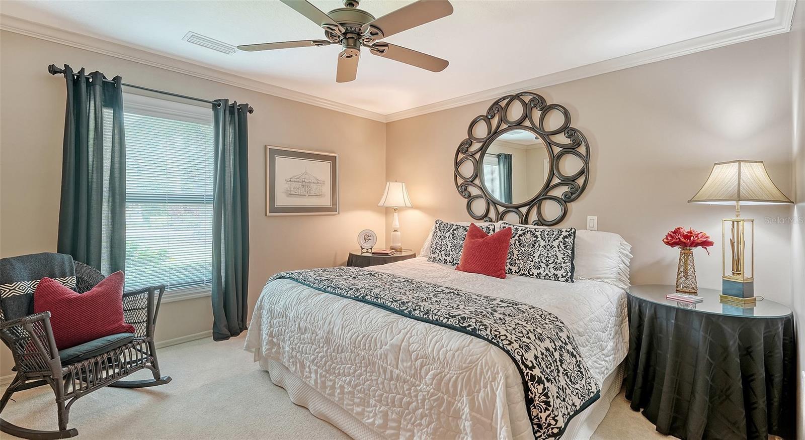 - Built-in Features, Ceiling Fans(s), Primary Bedroom Main Floor, Solid Wood Cabinets, Split Bedroom, Stone Counters, Walk-In Closet(s), Window Treatments