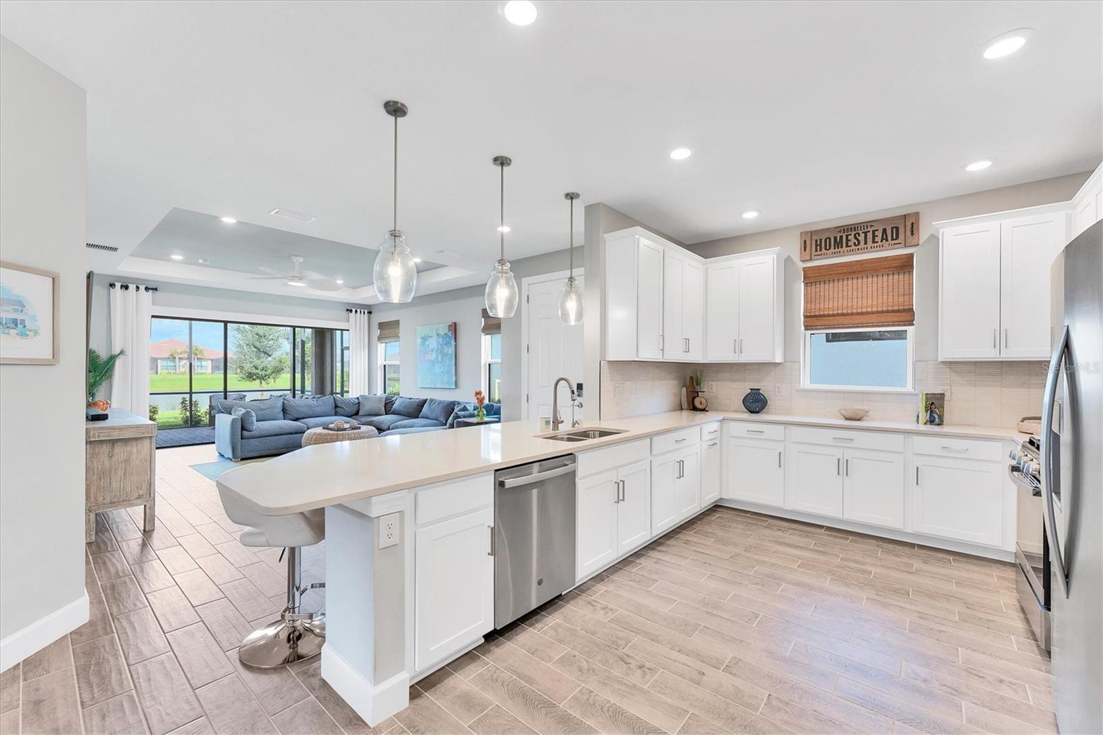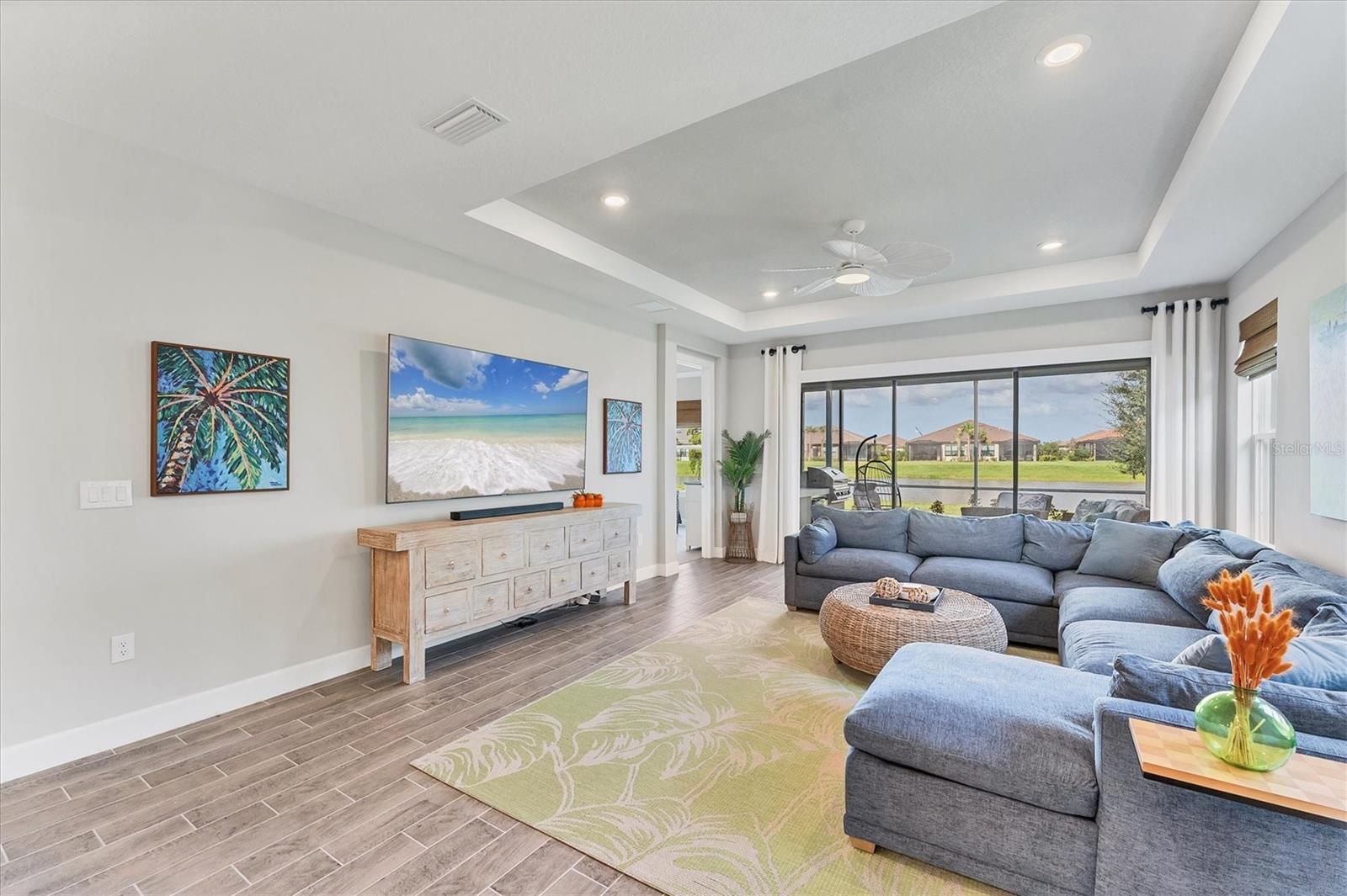 Under contract-accepting backup offers. Step into paradise at 3025 Veneto Court, an upgraded, GOLF-DEEDED Arezzo model nestled in the heart of the highly sought after Esplanade at Azario in Lakewood Ranch. Situated on a beautifully landscaped cul-de-sac, this elegant home perfectly blends luxury, comfort, and vibrant resort-style living. From the moment you enter, you’ll feel transported to your own tropical oasis. Wood look tile flows seamlessly throughout the open concept floor plan, complemented by tray ceilings, 8-foot doors, coastal inspired light fixtures, and custom bamboo window treatments—all coming together to create a breezy, upscale vibe with a touch of island elegance. Culinary enthusiasts will love the spacious, light filled kitchen, complete with premium stainless steel appliances, quartz countertops, and elegant finishes. It flows effortlessly into the dining room, where tray ceilings and ample space invite you to host family and friends with ease. The living room opens up to an extended covered lanai through sliding glass doors, where tranquil water views and gentle breezes create the perfect backdrop for relaxation. Step onto the lanai, where the outdoor kitchen and calming water views set the scene for sunset dinners and laid back evenings. Inside, the split floor plan offers privacy and flexibility. The primary suite is a sun-drenched retreat, featuring a wall of windows, a spa-like ensuite with a walk-in shower, double vanities, and a massive walk-in closet. Guests will feel right at home with two additional bedrooms and a full bath featuring double sinks. A private den with pocket doors offers the perfect space for a home office, creative studio, or quiet reading nook. Living here means more than just loving your home. You’re just a short stroll or quick golf cart ride away from Azario’s world class amenities. Spend afternoons lounging by the resort-style pool with a cocktail, indulge in a massage at the full-service spa, take a yoga or fitness class, or try your hand at pickleball and tennis. Enjoy wine tastings, cooking classes, and unforgettable dining experiences at the brand new culinary center or grab a casual bite at the on-site pizzeria. At Esplanade at Azario, every day feels like vacation—and this home is your personal paradise in the center of it all. Book your private showing today.