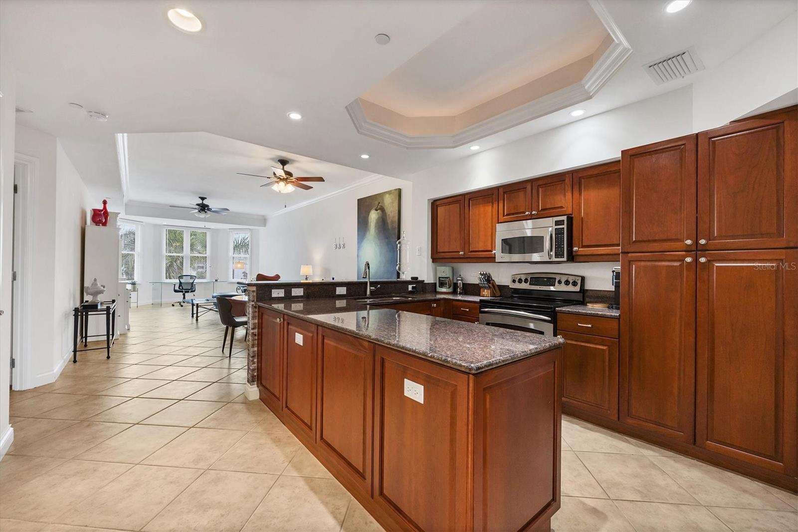 Walk in and be instantly impressed by the quality furnishings, exceptional comfort, and pristine cleanliness of this beautiful condominium, conveniently located in the heart of Lakewood Ranch’s Main Street district. Take the elevator to the third floor and enjoy charming views of Main Street right from your home. You’ll be living in the heart of a vibrant small downtown community, surrounded by popular restaurants, a movie theater, a mini golf course, shops, gyms, and more. Lakewood Ranch Medical Center is just across the street, making this location ideal for both short and long stays. The unit offers an assigned parking space, with additional public parking available if needed. Inside, you’ll find everything you could possibly want, including a private primary bedroom with a king-size bed, walk-in closet, and a spacious en-suite bathroom with double vanities, a walk-in shower, large linen closet, and a private water closet. The guest bedroom also offers a walk-in closet, en-suite bathroom, queen-size bed, and TV. The fully stocked kitchen has everything you need to prepare meals, even a full Thanksgiving dinner. The comfortable living room, furnished with luxurious Italian leather reclining furniture, a large TV, and a glass-top desk, is the true heart of the home. This home consistently earns 5-star reviews from every guest. Come stay with us—we promise you will be delighted with your experience.