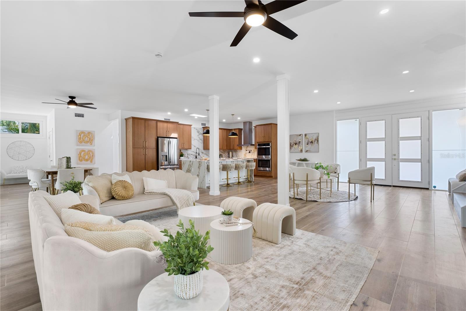 - Accessibility Features, Built-in Features, Ceiling Fans(s), Eat-in Kitchen, High Ceilings, Kitchen/Family Room Combo, Living Room/Dining Room Combo, Open Floorplan, Primary Bedroom Main Floor, Solid Surface Counters, Solid Wood Cabinets, Split Bedroom, Thermostat, Walk-In Closet(s)