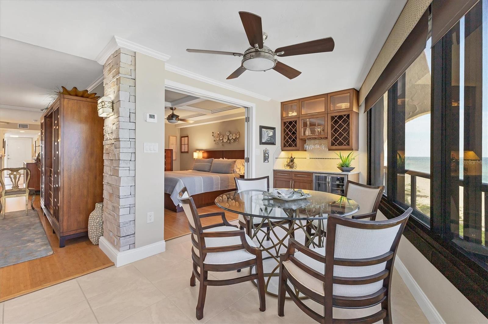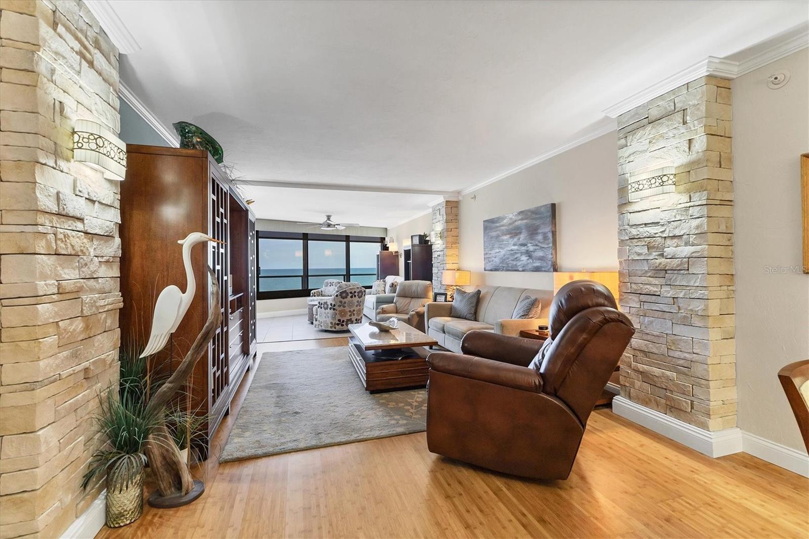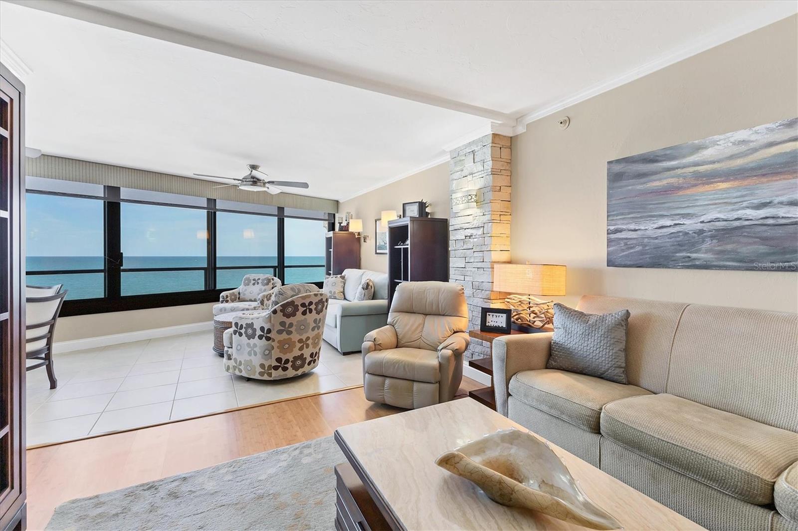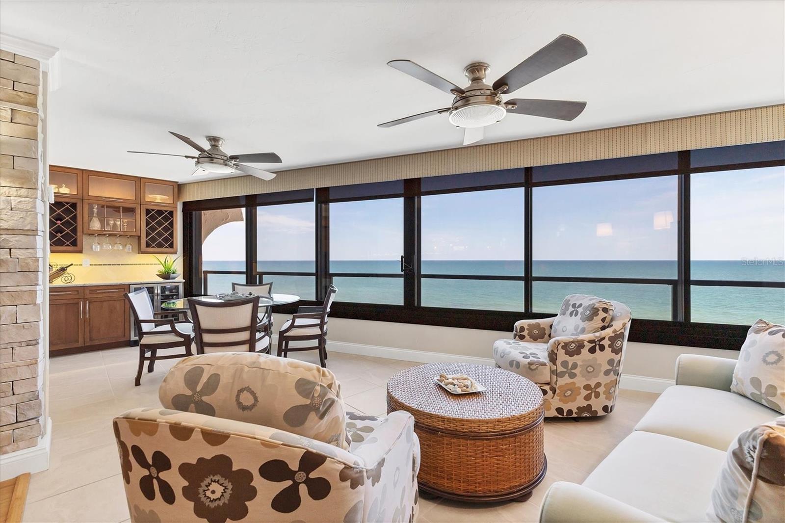 This exceptional, turn-key furnished (with some exclusions) 8th-floor condo in the highly sought-after Sansovino on Venice Island is a true standout. Completely taken down to the studs and reimagined with the expertise of a professional architect and interior designer, this residence offers a rare blend of coastal charm and upscale sophistication. With sweeping 180-degree views of the Gulf and Venice Beach, every corner reflects quality craftsmanship and thoughtful customization. Upon entry, the stacked-stone feature wall in the foyer sets the tone for the elegant updates throughout. The gourmet kitchen impresses with GE Profile appliances, soft-close hardwood cabinetry, neutral granite countertops, a glass-tiled backsplash, and pendant lighting that adds a coastal flair. Adjacent is a well-appointed laundry room with full-sized Electrolux washer and dryer, and additional cabinetry and counter space. The kitchen and foyer share beautiful 24” x 12” neutral tile flooring. The spacious living and dining areas are defined by stunning architectural details—coffered ceilings, a gorgeous lighted Media/Entertainment cabinet, bamboo flooring, dramatic stone-accent walls with attractive sconces, and a chandelier that elevates the space. The living room flows seamlessly into the expansive lanai which offers unmatched views and an entertainer’s dream setting. The lanai is outfitted with motorized window shades, two ceiling fans, a beautiful, built-in, granite-topped bar with wine/beer fridge, and an oh-so-comfortable sofabed that sleeps two. The Primary Suite features elegant bamboo flooring, a coffered ceiling with fan, and glass French doors that open to the lanai, revealing stunning Gulf views. The King-sized bed is actually a split king configuration, comprised of two twin articulating beds—each with independent head and foot adjustments to provide customized, ergonomic comfort. Two beautifully appointed walk-in closets with custom wood organizers and a spa-inspired en-suite bath, showcasing a granite double vanity with under-cabinet lighting, a glass-enclosed shower with natural stone flooring, and decorative tile accents, complete the primary retreat. The Guest Bedroom doubles as a spacious office, with a Queen-sized Murphy bed; custom built-in lighted cabinetry; and elegant touches throughout. The Guest Bath continues the theme of understated luxury with granite surfaces, pebbled shower floor, and elegant tile. Additional enhancements include solid wood five-panel interior doors with premium hardware, recessed lighting throughout, superior mattresses on all bedding, a separate shed/storage unit, and a whole-condo water filtration system. Sansovino offers secure building access with two elevators, a newly renovated Club Room, updated walkways and railings, and soon-to-be-completed new roof. Residents also enjoy a heated outdoor pool, private beach access, barbecue area, and a vibrant clubhouse for social gatherings. Minutes to downtown Venice, Crow’s Nest, and the Yacht Club—this remarkable home is truly one-of-a-kind. ***The Structural Integrity Reserve Study (SIRS) AND the Milestone Inspection (Structural Assessment) are done. Sansovino is in great condition, both financially and physically!***